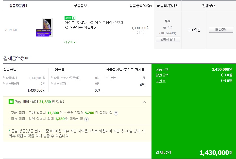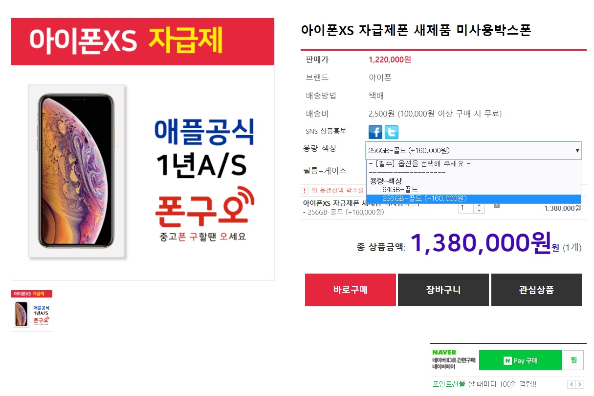 최초에는 재고가 없어서 리퍼나 중고폰을 살펴보다가 혹시나 싶어서 물어보니 재고가 있다고 해서 결제를 진행했습니다. 이번 아이폰xs 256GB는 미개봉 자급제 폰으로 138만 원에 구입을 했습니다. 아무래도 xs 256GB 제품 재고가 넉넉지 않다 보니 상대적으로 가격이 비싸더라고요. 네이버 검색을 해봐도 가장 저렴해서 바로 결제를 진행했습니다.