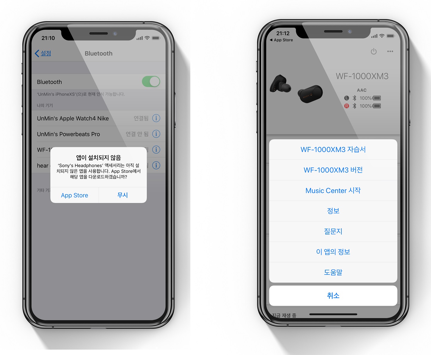 연결이 완료되니 자동으로 소니 이어폰 전용 어플에 대해 안내가 나옵니다. 바로 어플을 받고 각종 설정을 진행할 수 있습니다. 이런 디테일함을 좋아하는 분들도 많지만... 누군가가 선택해주길 바라는 결정장애인 분들도 많죠. 메뉴 중 선택이 쉽게 정리해놓은 게 있었다면 어땠을까 하는 아쉬움이 있었습니다.