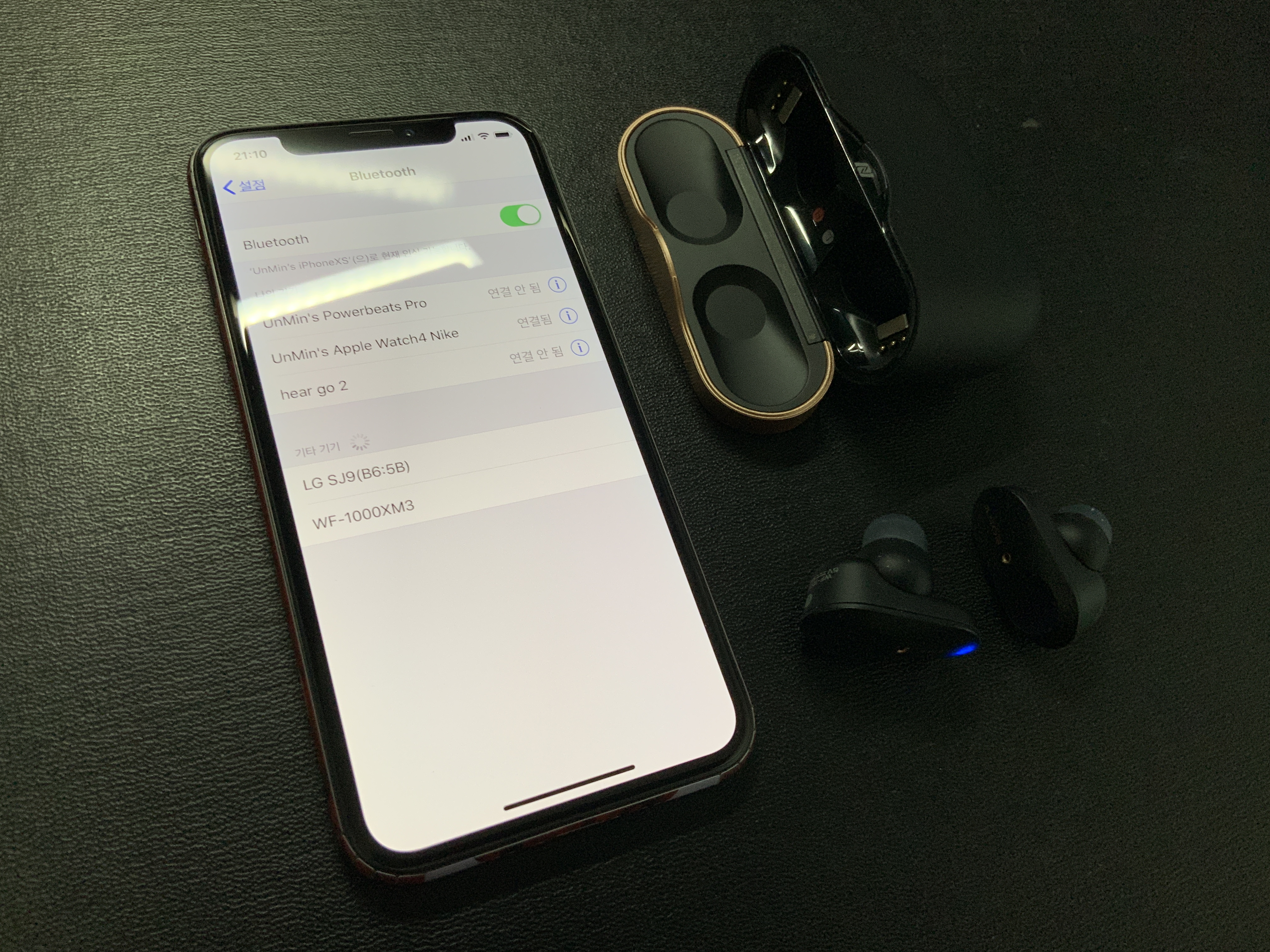 아이폰xs와 연결하는 방식입니다. 별도의 페어링 버튼이 존재하지는 않습니다. 늘 페어링 대기 상태를 유지하는 게 아닌가 싶어요. 케이스에서 꺼내면 전원이 켜지고, 폰에서 블루투스 설정에 들어가서 연결해주면 끝입니다.