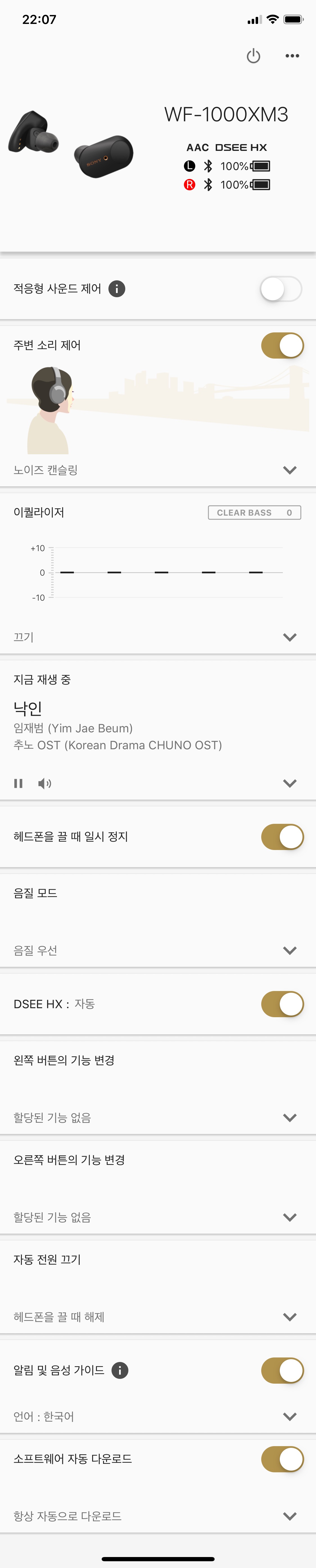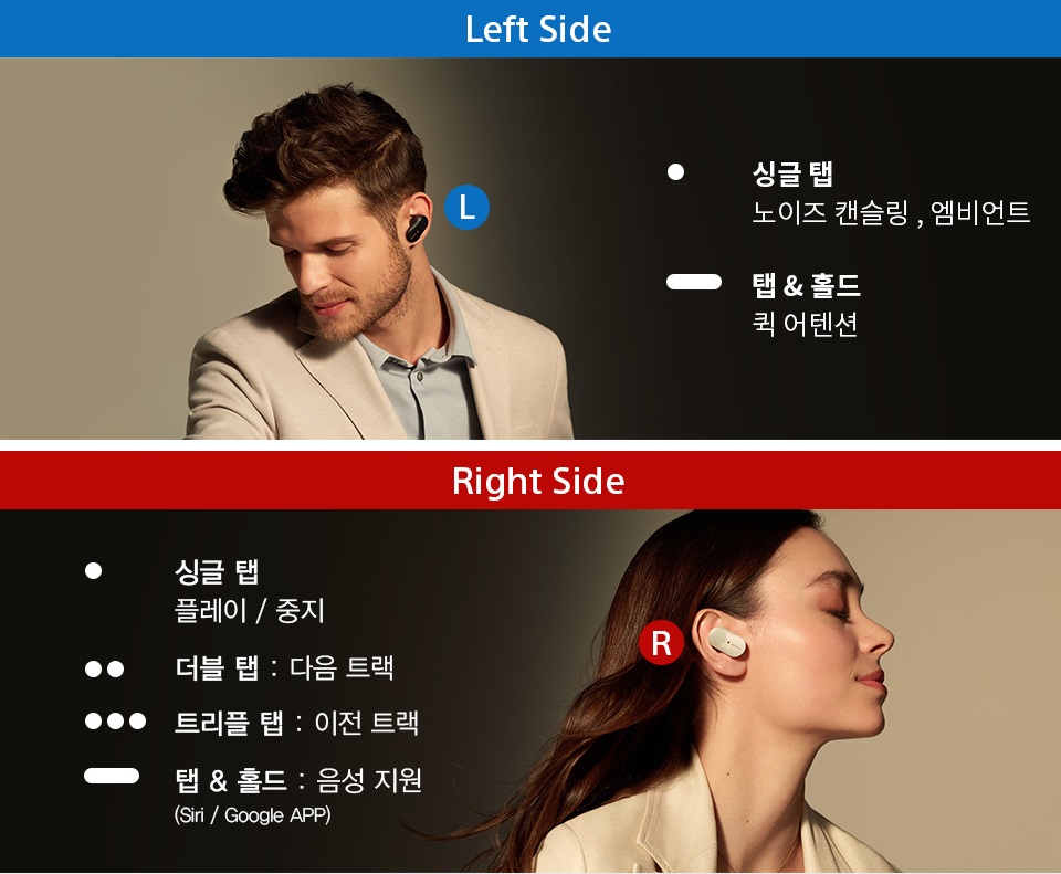 편의성 부분도 상당히 많이 좋아졌습니다. 이제는 당연한 기능이 되버린 착용 감지 기능은 물론 들어갔고요. 어플 등을 통해 EQ 제어가 가능합니다. 그리고 운전 시 한쪽만 착용하고 통화용으로 사용도 가능해요. 앞서 노캔 부분에서 설명한 좌우 터치 동작 부분도 각자 편한 대로 바꿔서 사용이 가능하다고 합니다. 개인적으로 기본 설정된 동작들이 마음에 들어서 안 바꿨어요 ㅎㅎ 참 그리고 시리나 구글어시스턴트 기능도 사용 가능합니다.
