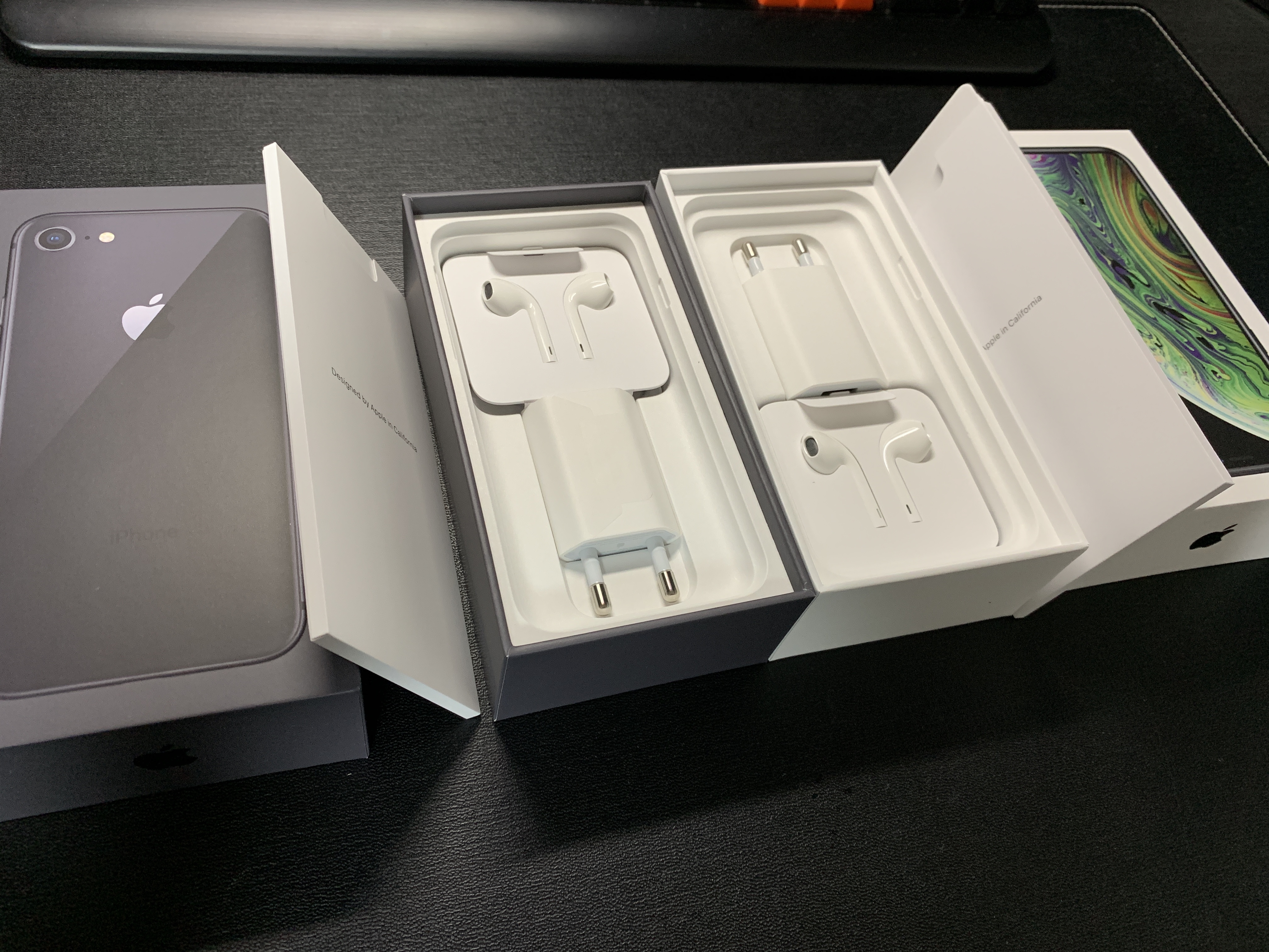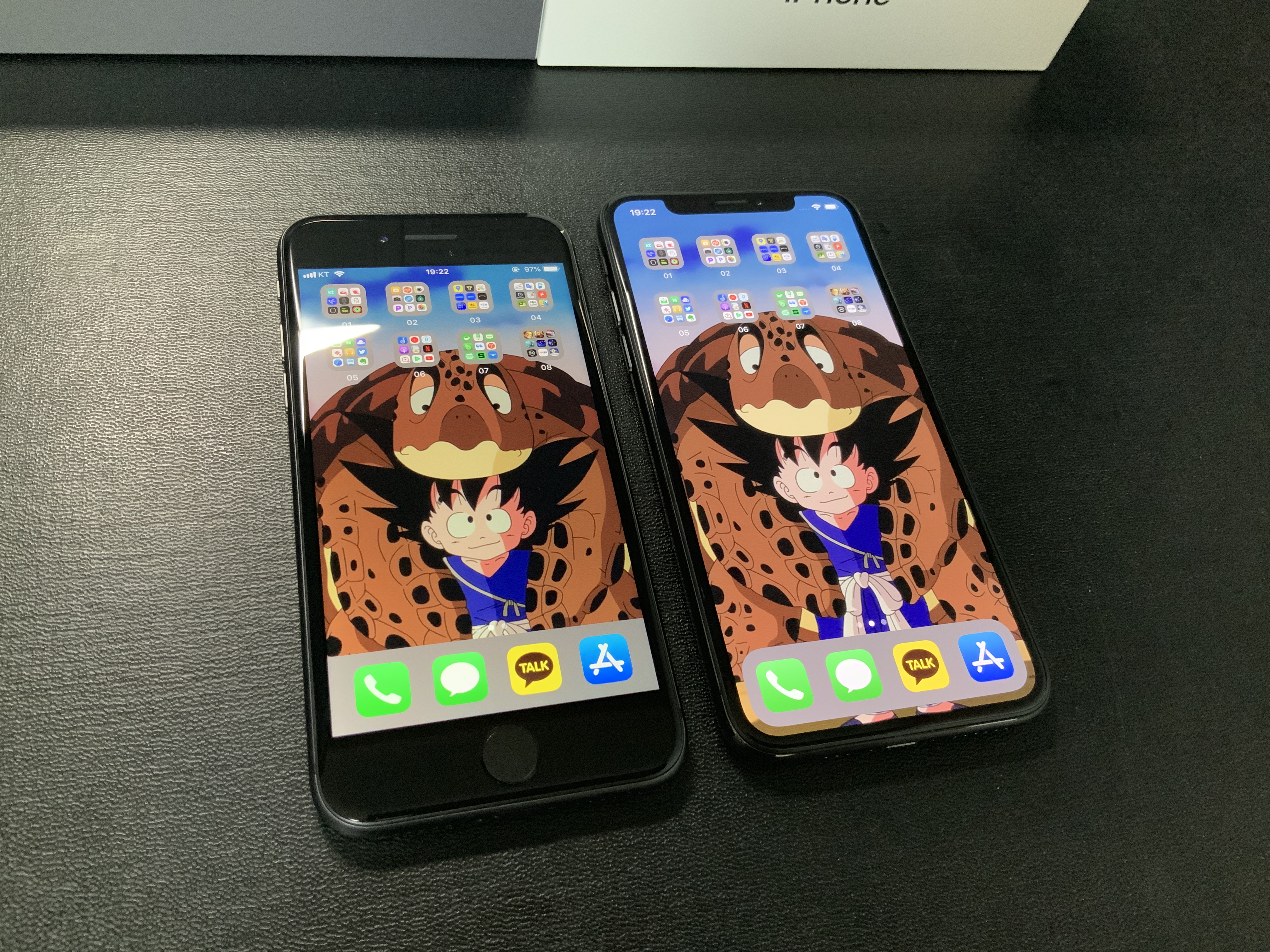 이제 와서 개봉기 자체가 의미가 없지 않을까 싶어요. 비교 대상인 아이폰xs와 박스 커플샷으로 대체합니다. ㅎㅎ 근데 박스를 보면... 색별로 포인트를 줬던 이때가 전 더 좋아요. 블랙블랙한 박스 디자인이 취향을 저격합니다. 벨킨 충전기와 케이블을 쓰기 때문에 둘 다 구성품은 전혀 건들지 않았어요.