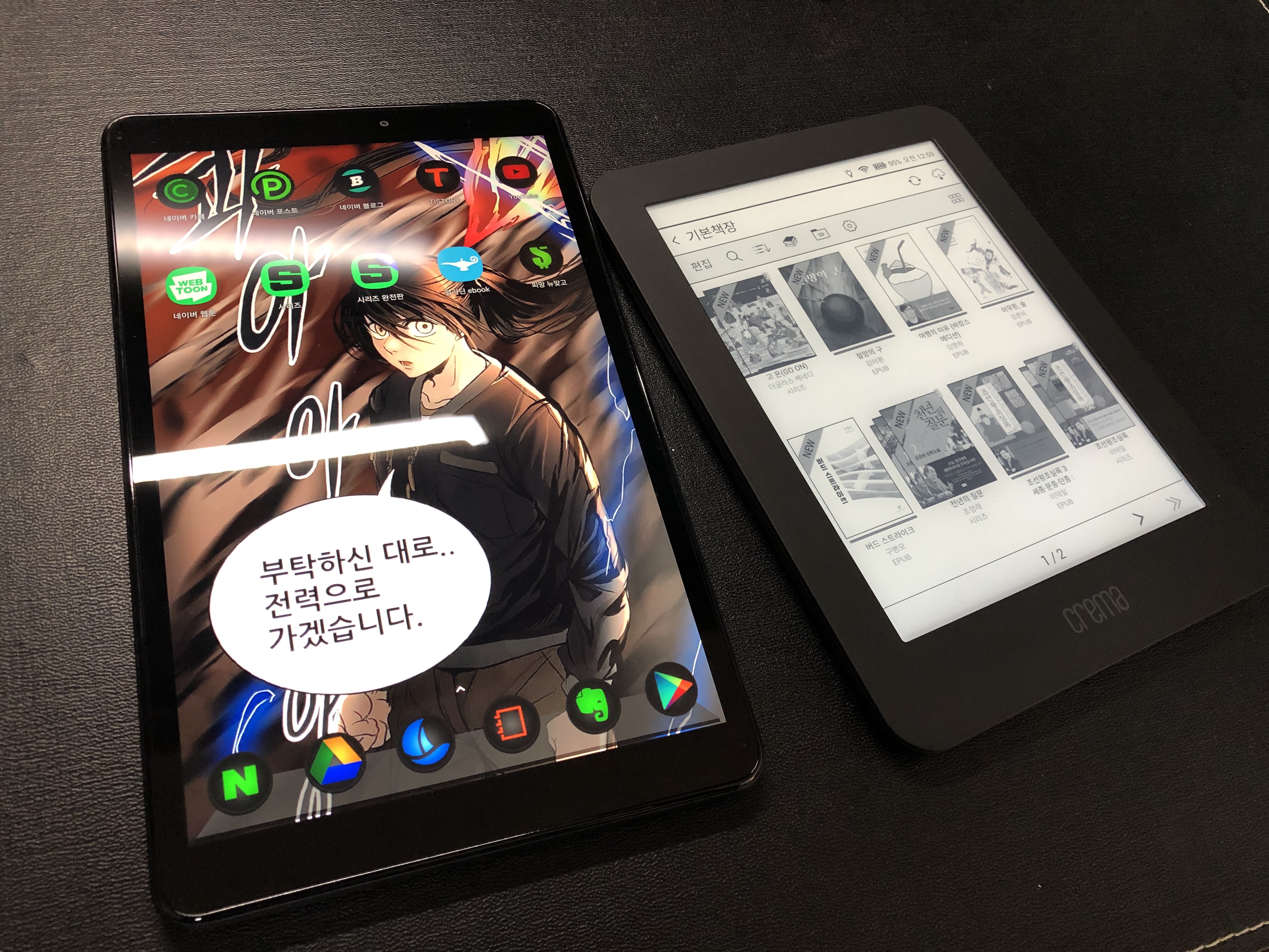 갤럭시탭A8.0은 전자책 뷰어인 크레마 그랑데와 그 역할을 나누게 됐습니다. 전에는 그랑데로 만화도 보곤 했는데요. 종이 느낌은 좋았습니다만... 컬러가 나오지 않는 점과 작은 글씨 읽는 게 힘들어서 불편했었어요. 이제 그 단점을 갤탭a8.0이 커버하게 됩니다.