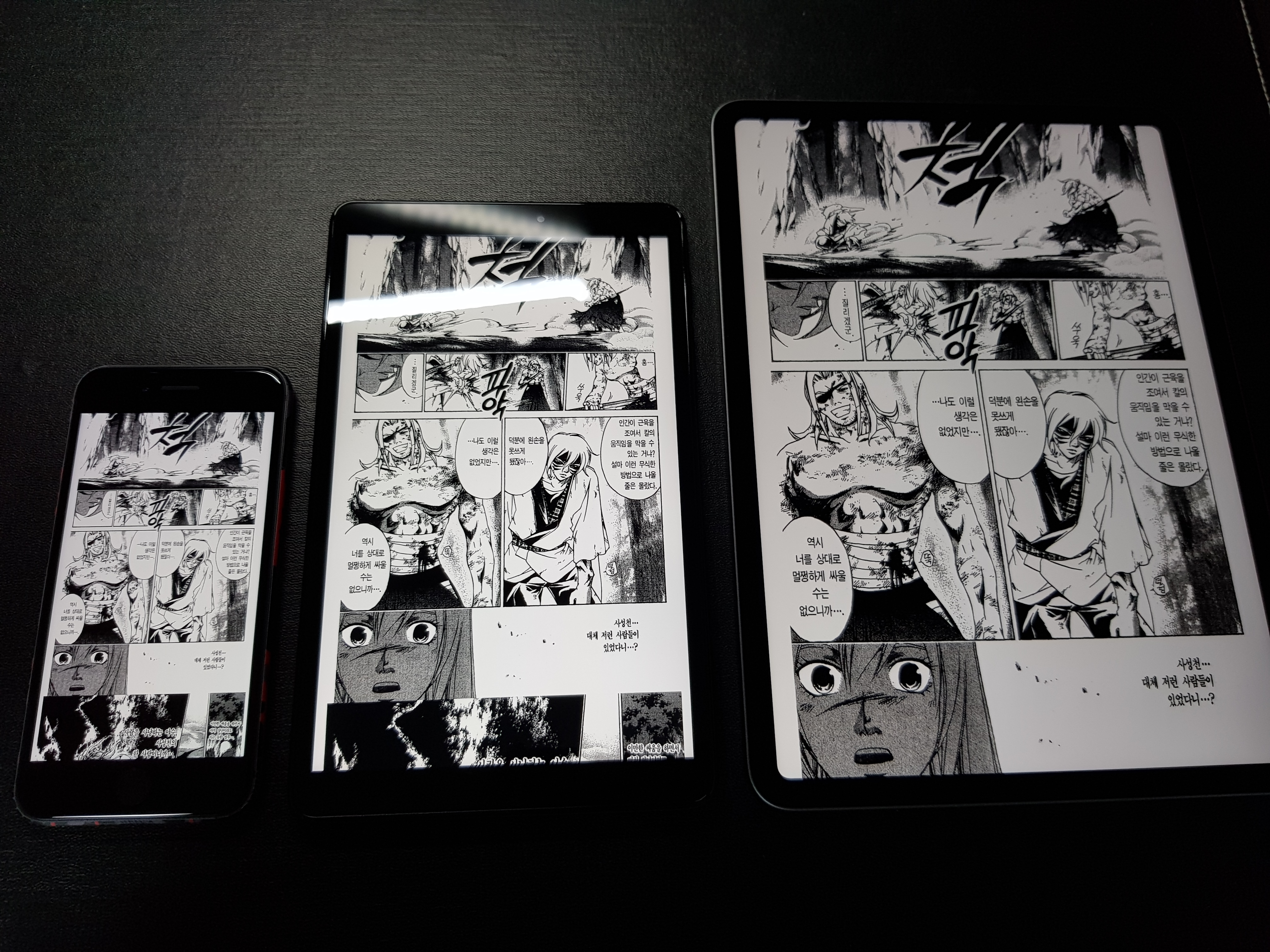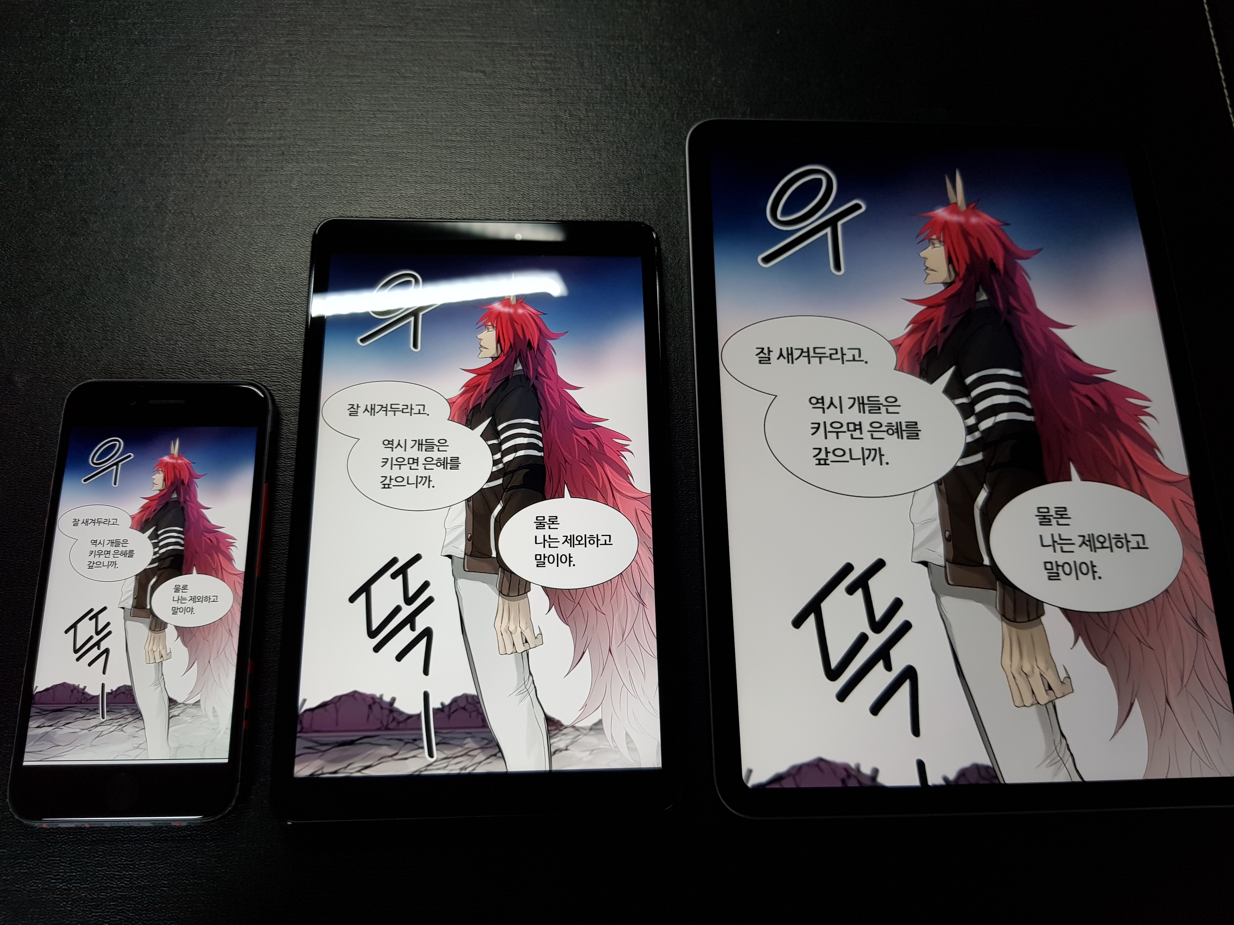 위 비교샷은 제가 왜 8인치의 탭A를 구입했는지 이유를 설명해줍니다. 제가 탭A를 구입한 가장 큰 이유, 만화 뷰어로서의 역할입니다. 위 사진은 순서대로 아이폰8, 갤럭시탭A8.0, 아이패드 프로 3세대 11인치입니다.