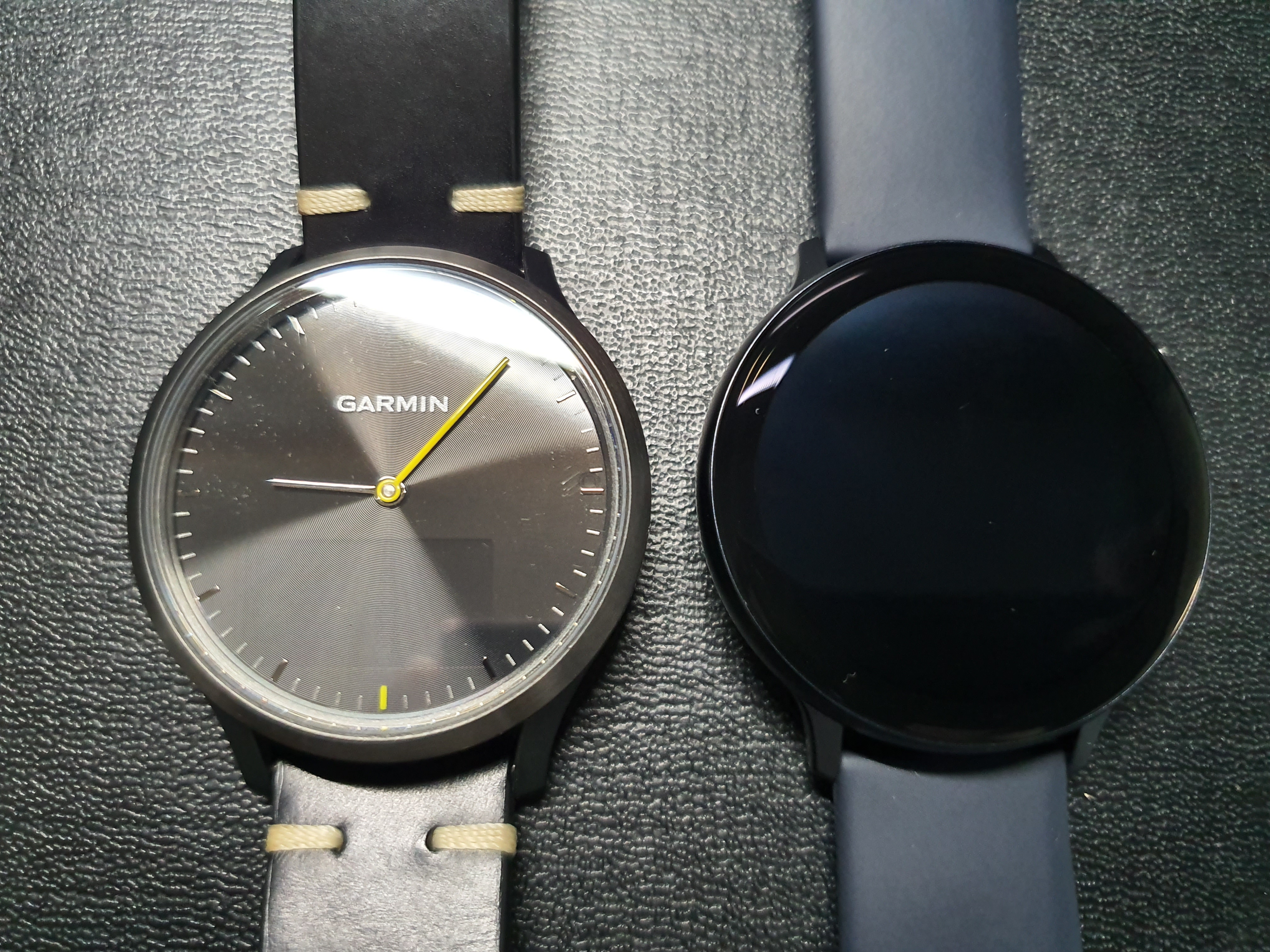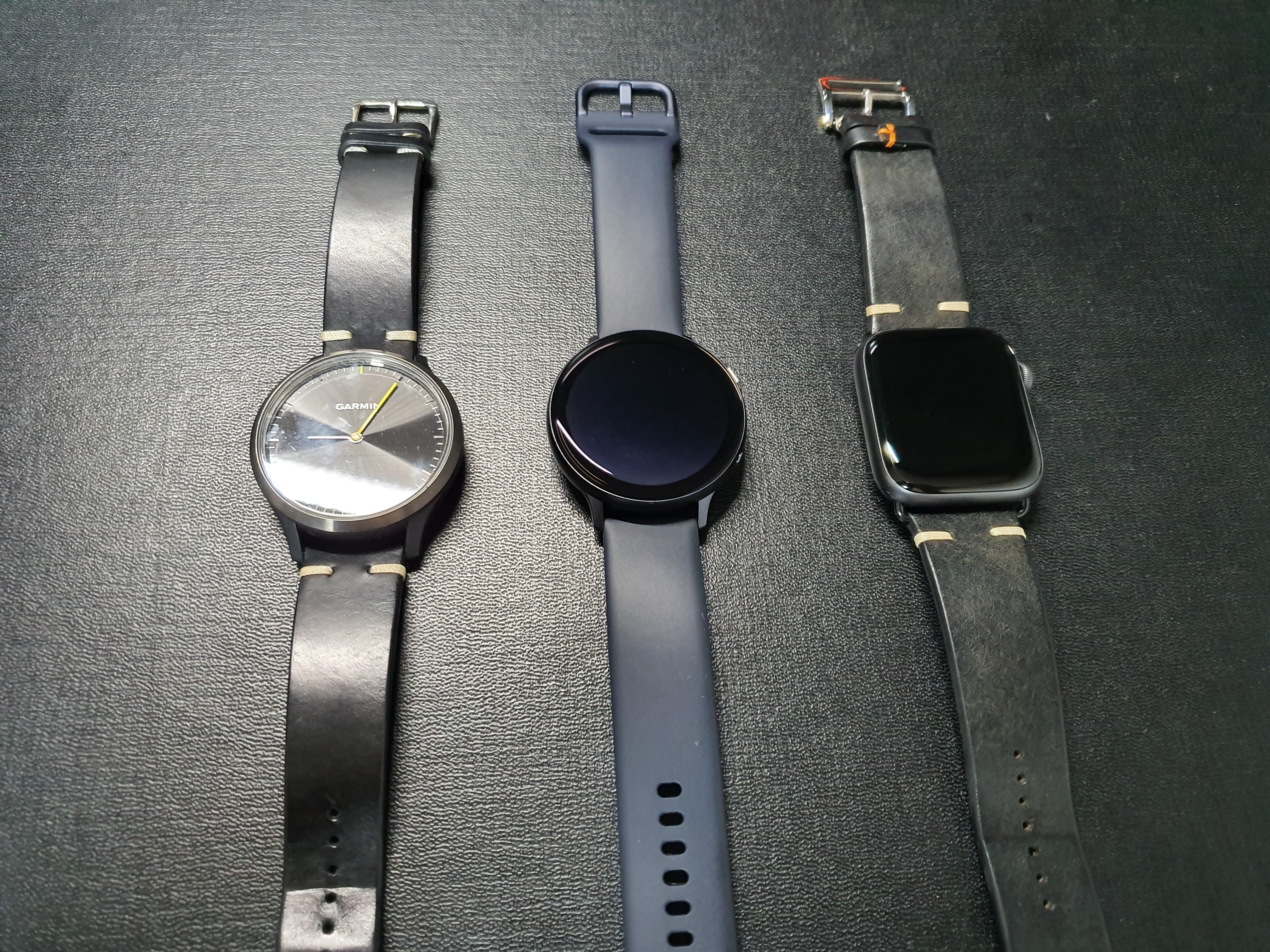 위 이미지는 다른 스마트워치인 가민 비보무브hr과 애플워치4 알루미늄 모델과 비교샷입니다. 이미지상으로는 다른 기기와 비슷한 크기인데 여전히 손목에 착용하고 있으면 작아 보여요. 신기할 노릇입니다.
