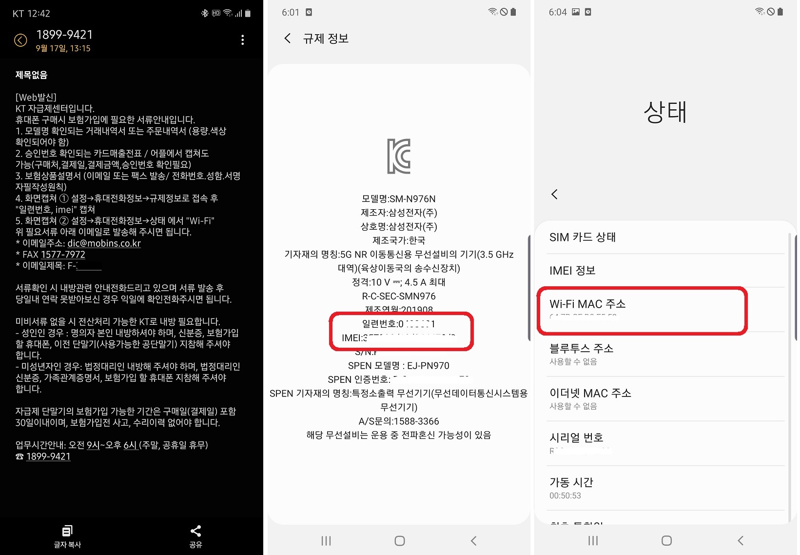 KT의 경우, 1899-9421 로 전화를 해야 합니다. 114를 통해서 문의해도 결국 앞선 번호로 안내를 해줘요. 해당 번호로 전화해서 접수를 진행하면 준비해야 할 부분을 문자로 안내해줍니다. 그대로 따르면 됩니다. 미리 준비해야 할 서류는 2장입니다. 그리고 기기 내에서 imei값, 일련번호, wifi 맥주소를 스크린샷으로 찍어야 합니다.