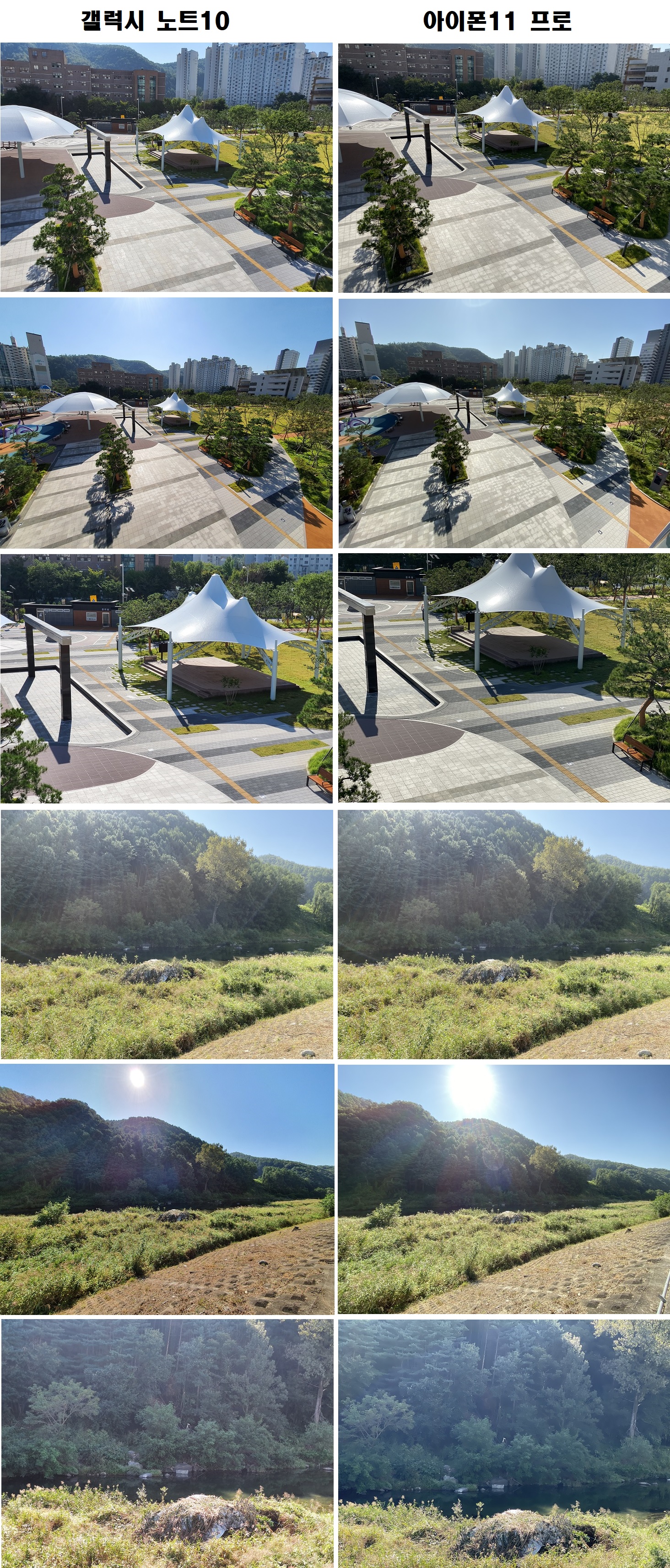실외 사진에서도 실내와 같이 색감 차이를 느낄 수 있었어요. 풍경 광각이라 왜곡 차이가 덜하게 보이지 않을까 싶었는데요. 실내 못지않게 왜곡이 심했어요. 제가 보기에는 실내보다 실외에서 갤럭시 왜곡이 심하더라고요. 아무리 광각이라지만... 이건 아니지 않나 싶을 정도였습니다. 그 외 망원에서는 비슷한 품질을 보여줬어요.