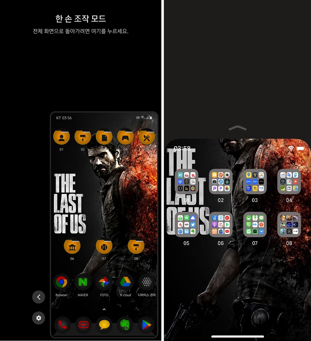 마지막 여담입니다. 오래된 기능이긴 한데요. 전 아이폰의 한손 조작 모드를 좋아합니다. 이전 대부분 기기에 홈버튼이 있었을 때에는 모든 기기에서 조작이 쉬웠습니다만... 제스처로 바뀐 이후 아이폰 홈바로 모드를 작동시키는 게 가장 편하더라고요. 그리고 갤럭시의 화면 자체를 줄이는 것보다 상단을 내리는 게 더 보기도 좋고, 조작도 쉬웠습니다.