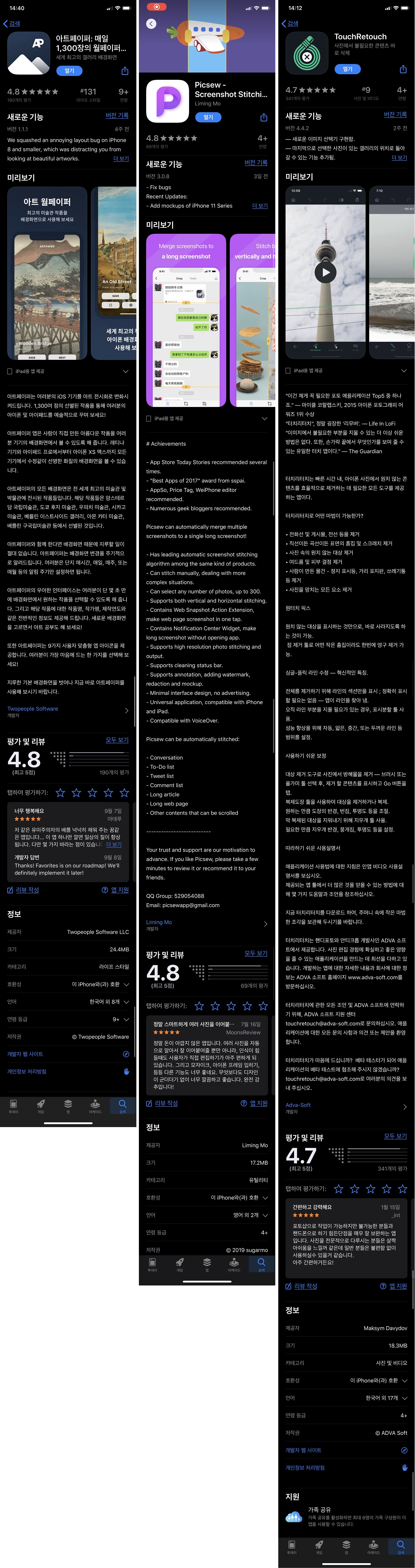 소개할 어플은 아트페이퍼, Picsew, Touch ReTouch입니다. 순서대로 배경화면 다운받는 어플, 스크롤 스크린샷을 만들 수 있는 어플, 사진 중 특정 영역을 지울 수 있는 편집 어플이에요.