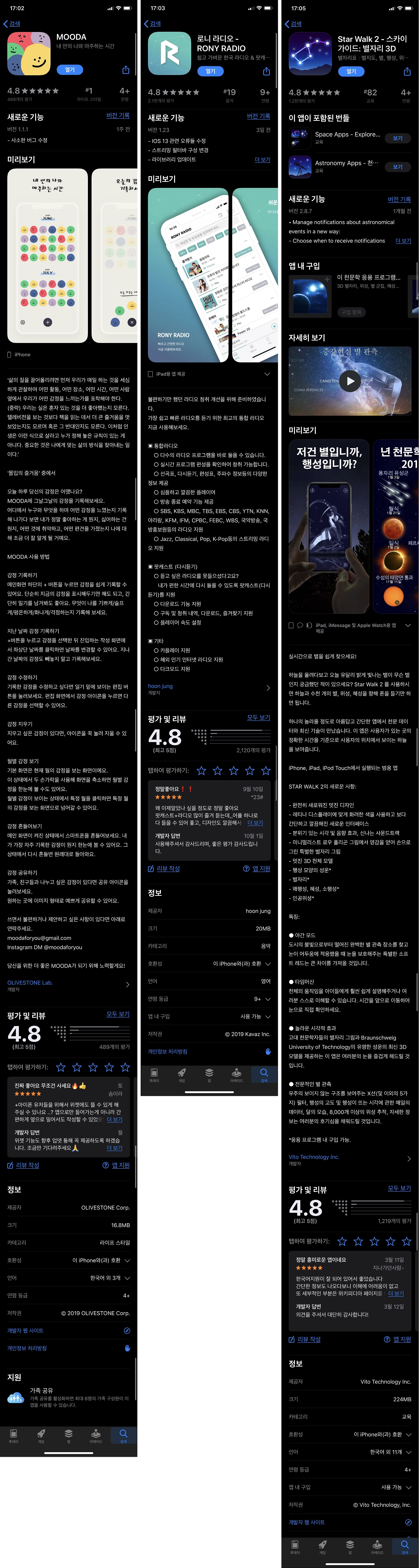 마지막 분류는 취미? 등등 기타입니다. 순서대로 데이그램 & MOODA, 로니 라디오, Star Walk2입니다. 데이그램과 무다는 같은 내용을 복사해서 기록하고 있어서 묶었어요. 라디오 어플이 참 많은데... 국내 방송국이 나오는 게 거의 없죠. 매번 막히더라고요. 글을 작성하는 현시점 잘 나오는 어플입니다. 별 보는 어플도 많죠...? 그중 제가 선택한 어플입니다.
