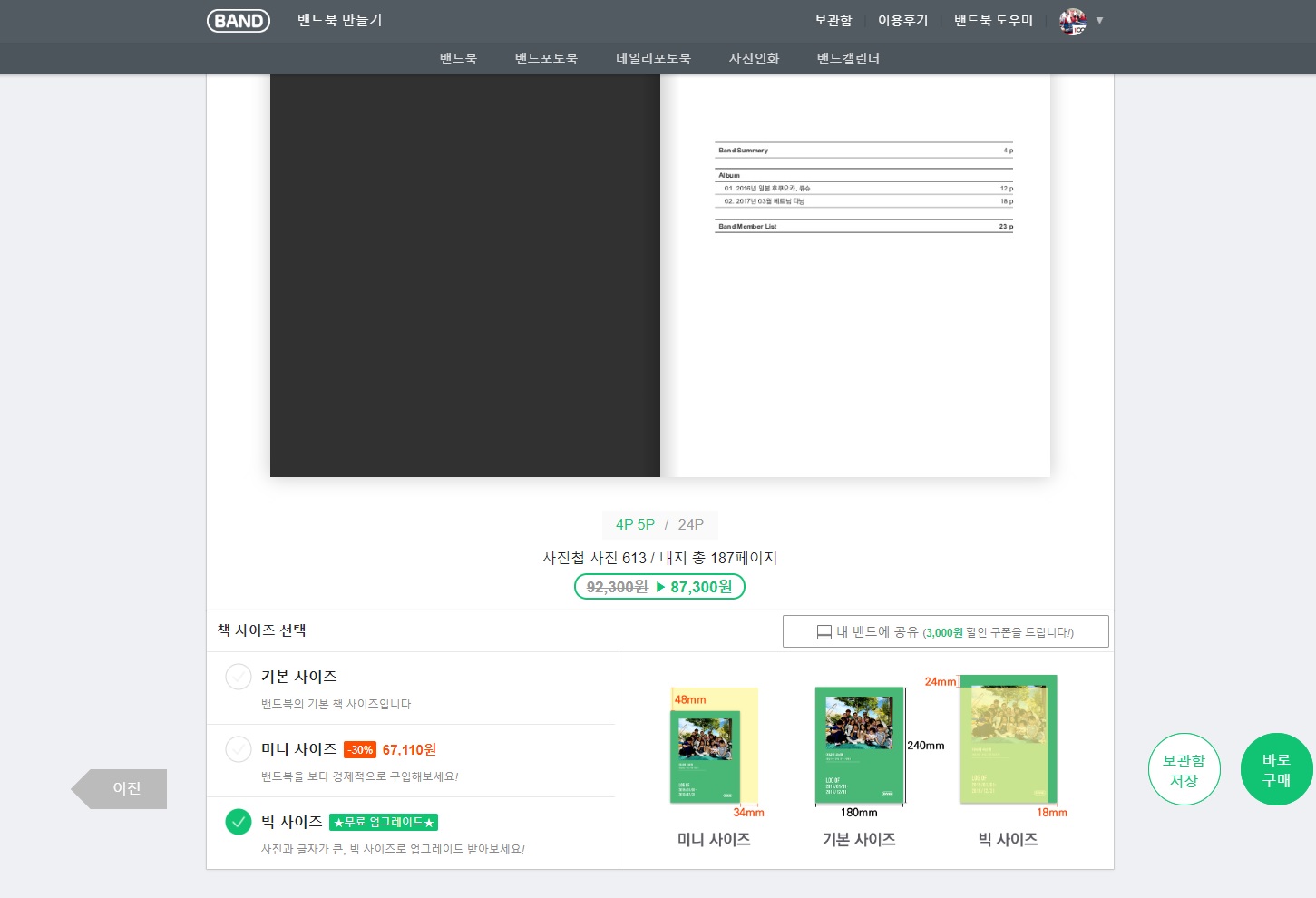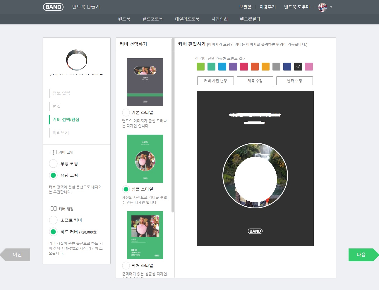 범위를 정하고 나면 커버를 편집해야 합니다. 좌우 메뉴를 꼼꼼히 봐야 해요. 전 조금 비싸더라도 유광 하드케이스를 선택했습니다. 장기간 보관 시에 하드 재질이 개인적으로 더 좋더라고요. 그다음 미리 보기를 보며 사이즈를 선택하면 됩니다. 지금도 진행 중인지는 모르겠습니다만, 제가 주문 당시에는 빅 사이즈로 무료 업그레이드가 가능했어요. 모든 선택을 마치면 결제를 진행하면 됩니다.