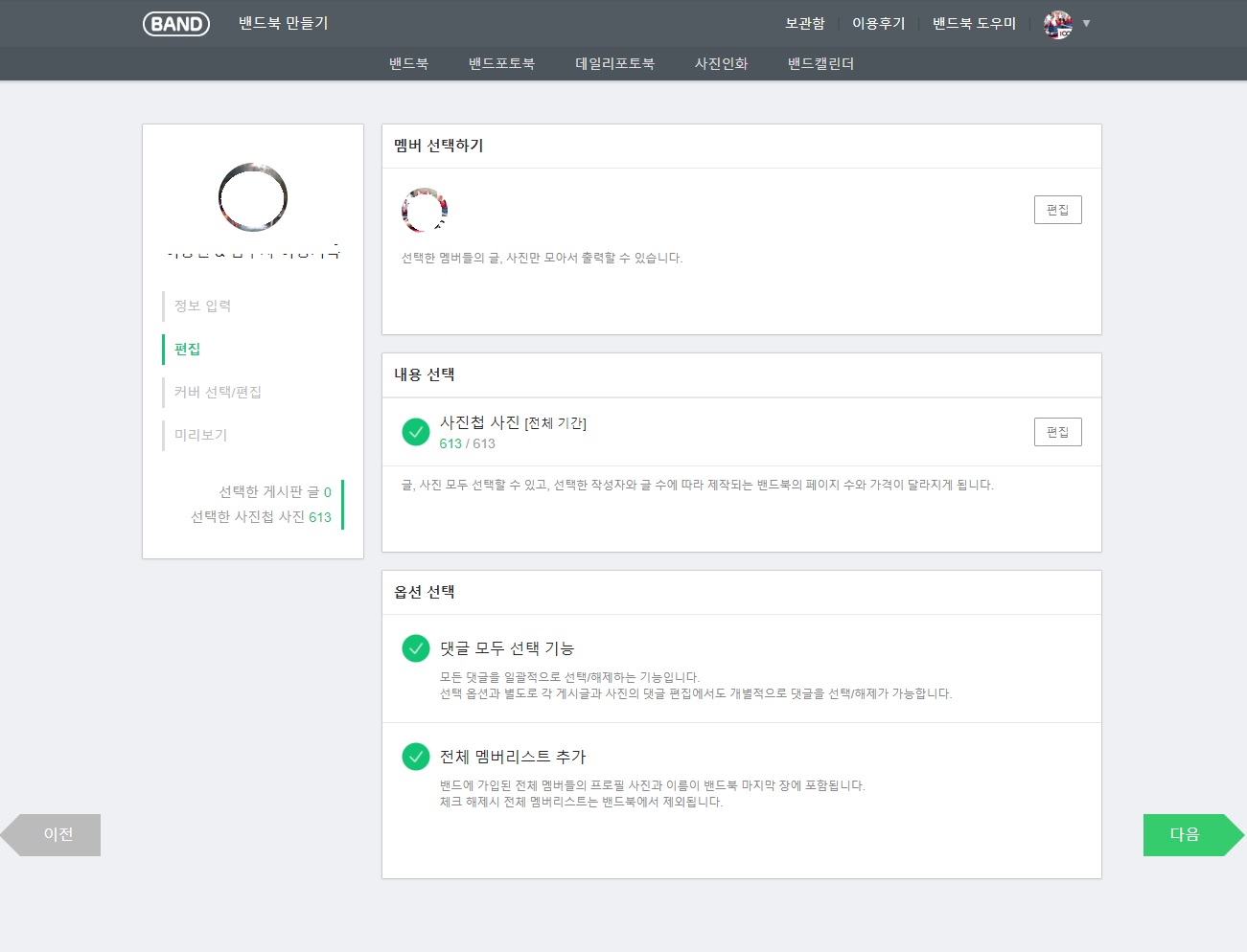 밴드북 제작 시 게시물 중심, 게시물 + 사진첩 중심, 사진첩 중심으로 각각 선택해서 제작할 수 있어요. 이전에 조카들에게 선물해줄 때는 글과 댓글들이 많아서 게시물 중심으로 제작을 했었어요.