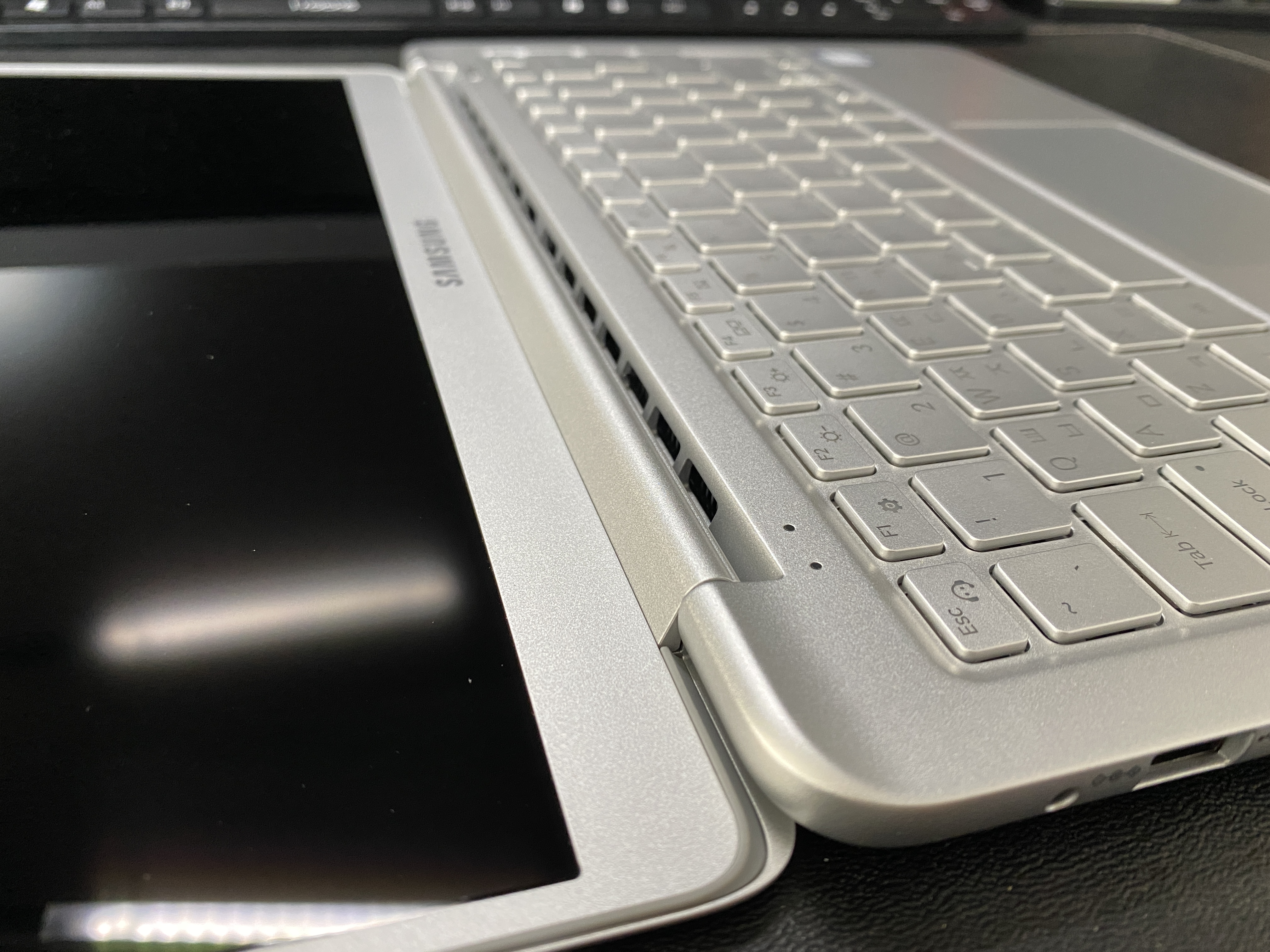 매장에서 실물을 보고 조금 놀랐었어요. 이전에도 삼성 노트북을 써본 적이 있었습니다만, 지난 기억과는 닮은 듯하면서도, 꽤 다른 디자인입니다. 개인 취향이긴 하지만요. 그램과 비교해서 뭔가 더 단단하고 마감이 좋게 느껴집니다. 실버 색상이지만 사실상 화이트 톤으로 느껴져요. 대부분의 사용 환경에서는 모니터에 유선으로 연결해서 사용합니다. 그래서 15인치보다는 가장 작은 13인치 모델을 선택했어요. 컴팩트한 사이즈라서인지 더 선이 곱습니다. ㅎㅎ