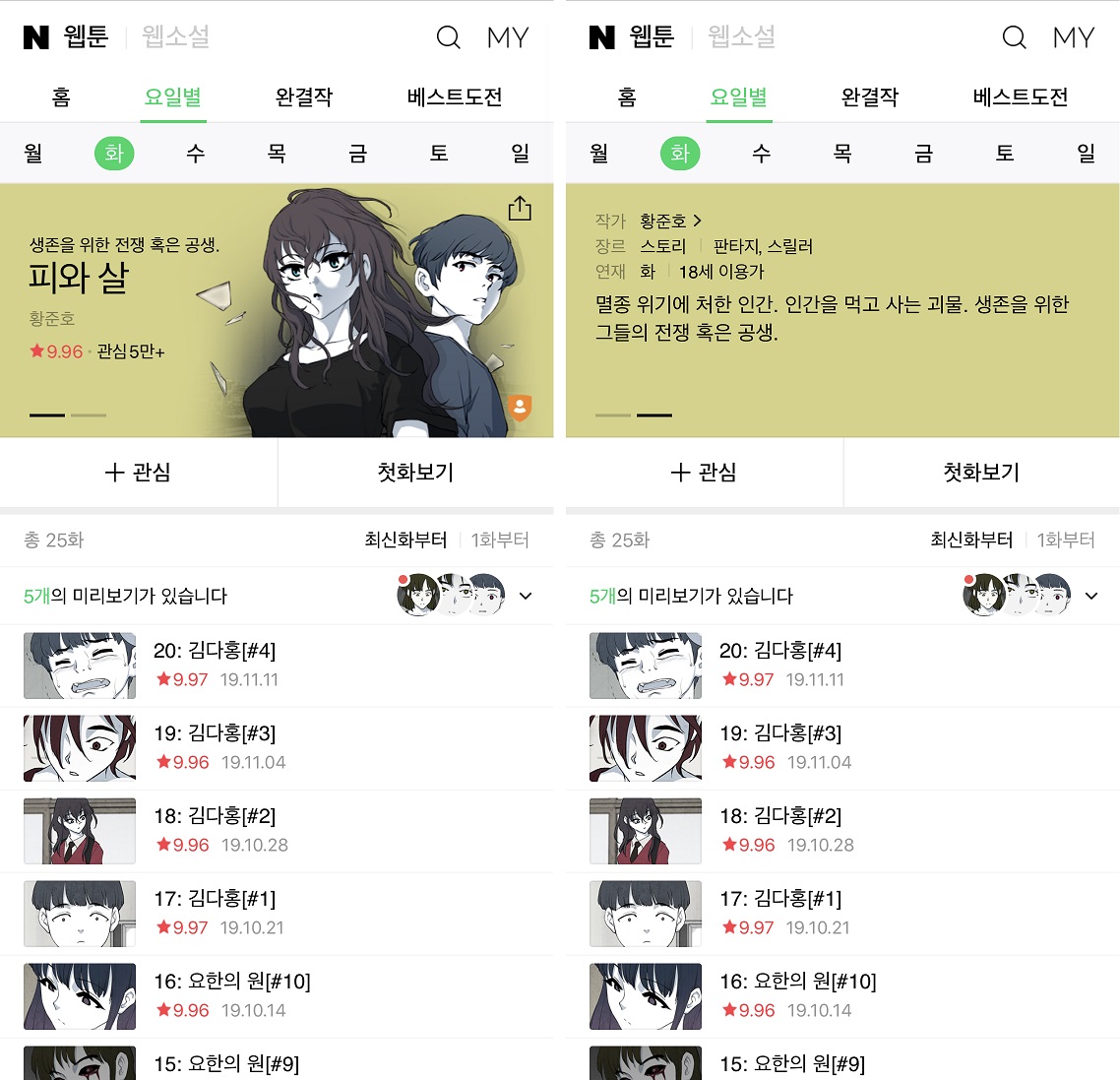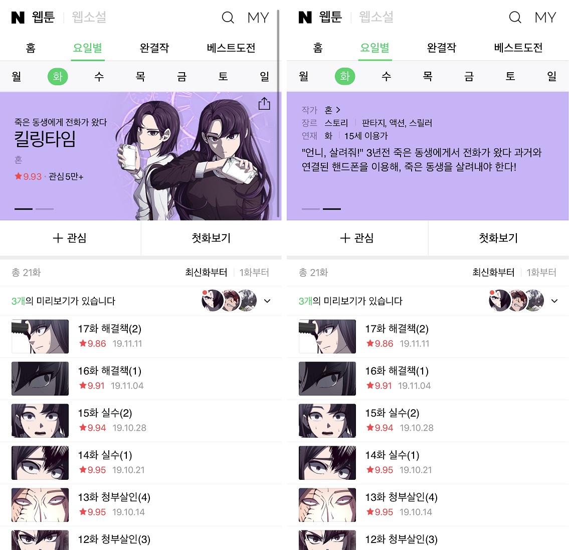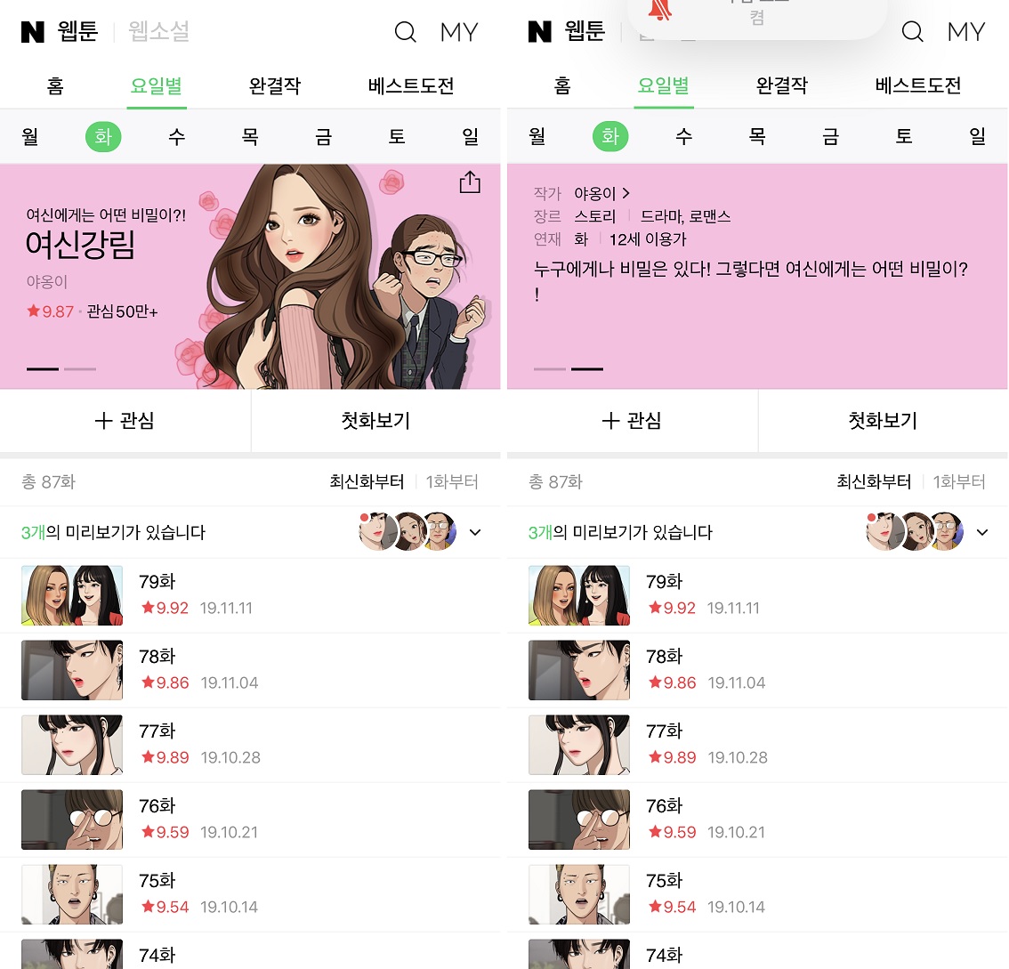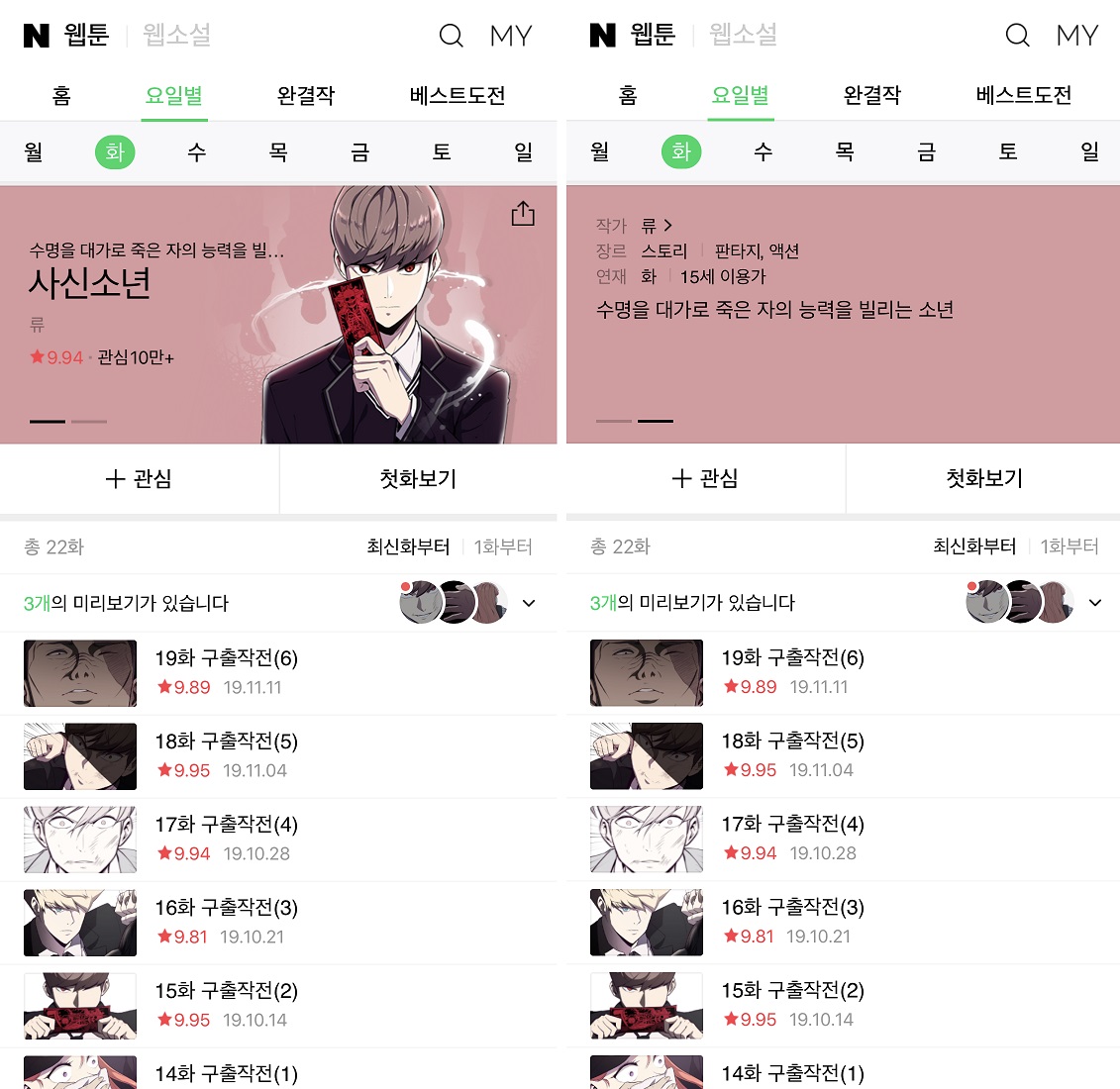 | [2019년 11월 기준] 취향 따라! 네이버웹툰 금요일 연재작 리뷰 (후기/추천) (0) | 2019.12.06 |