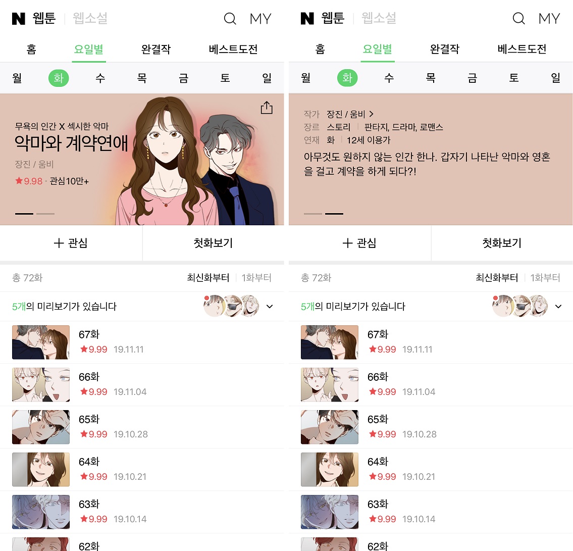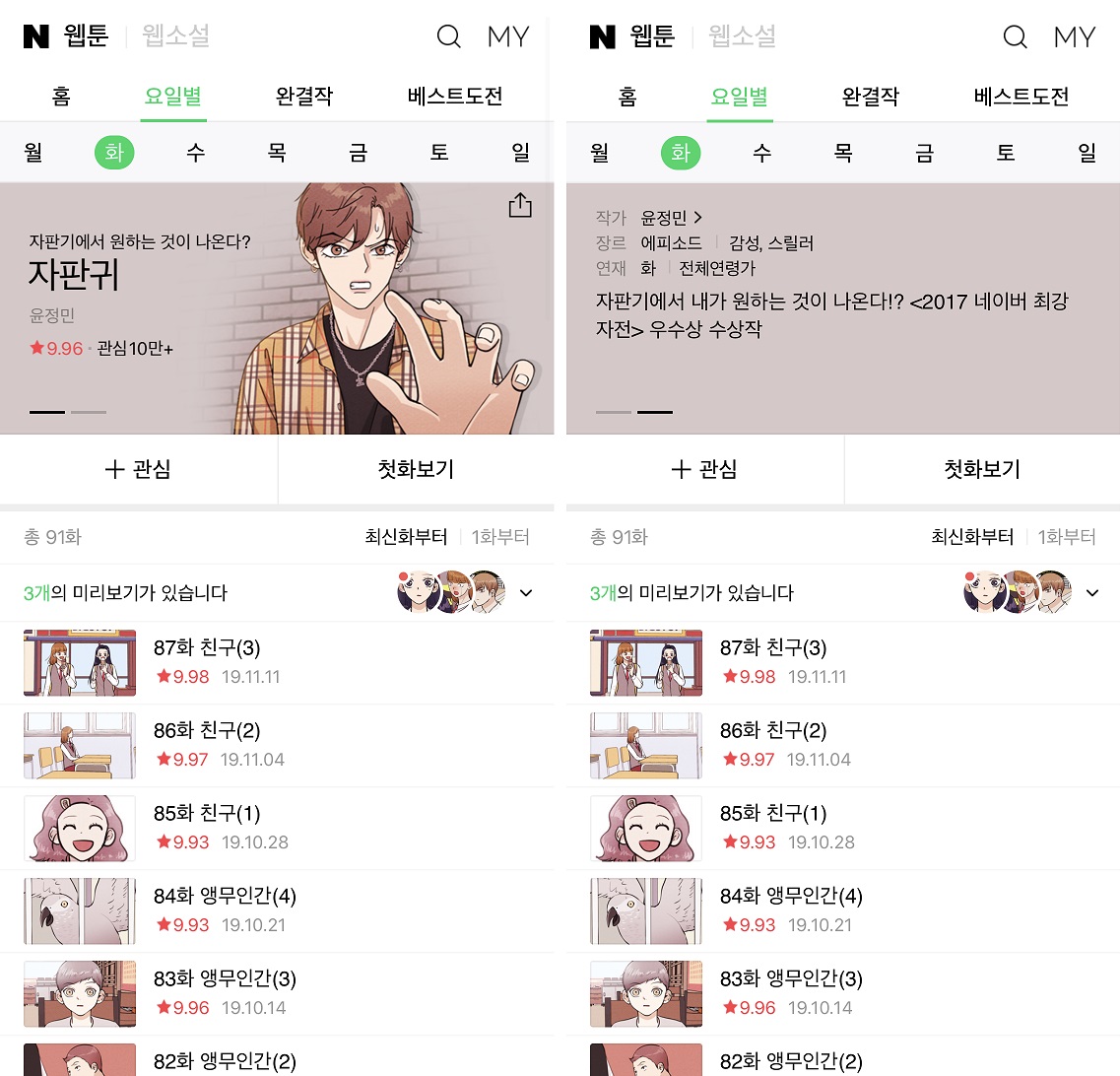 | [2019년 11월 기준] 취향 따라! 네이버웹툰 수요일 연재작 리뷰(후기/추천) (0) | 2019.12.04 |