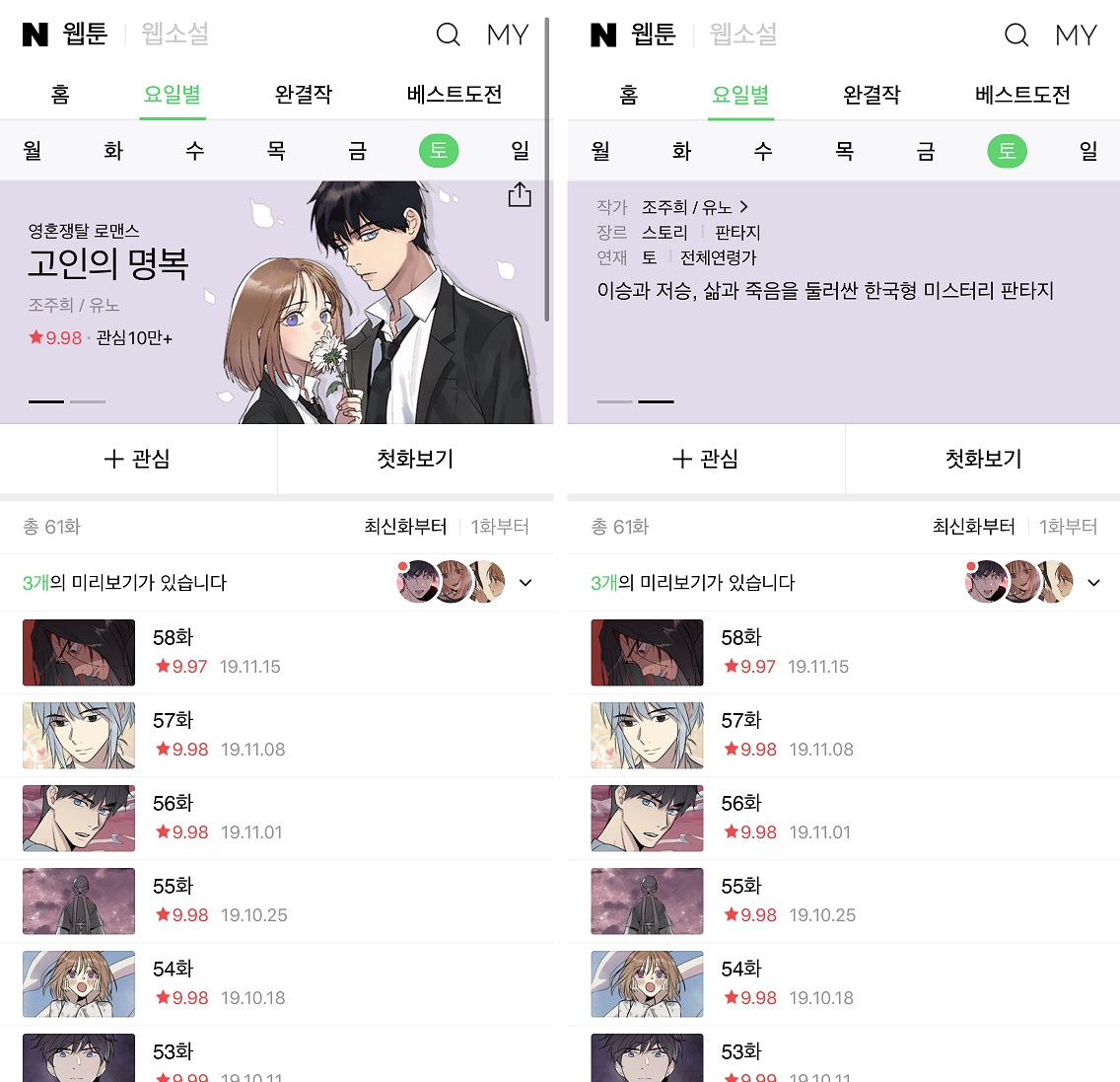 | [2019년 11월 기준] 취향 따라! 네이버웹툰 수요일 연재작 리뷰(후기/추천) (0) | 2019.12.04 |