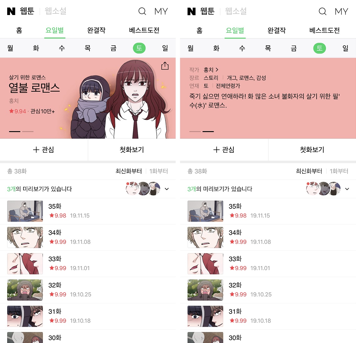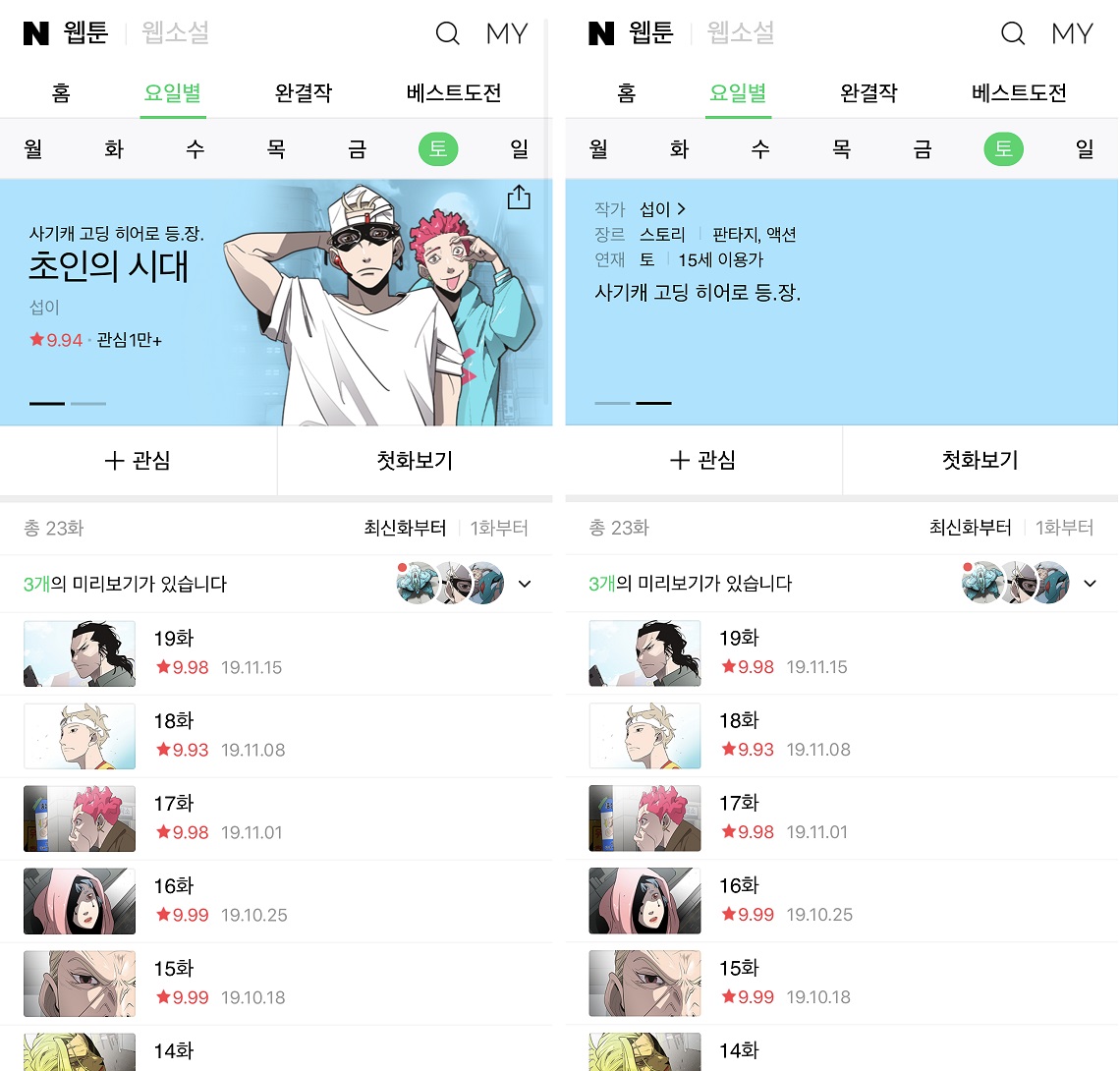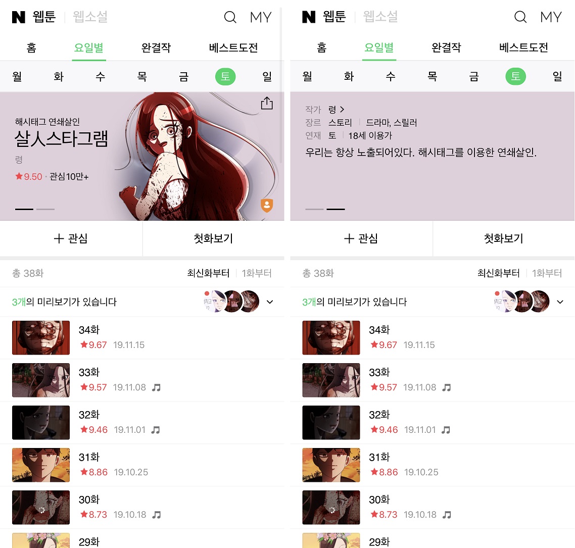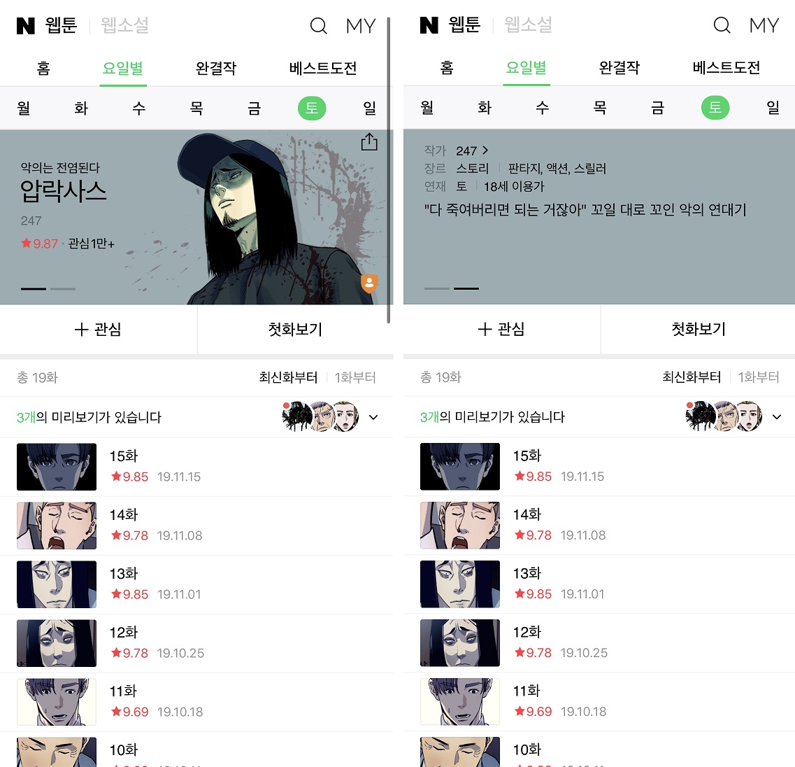 | [2019년 11월 기준] 취향 따라! 네이버웹툰 일요일 연재작 리뷰 (후기/추천) (0) | 2019.12.08 |