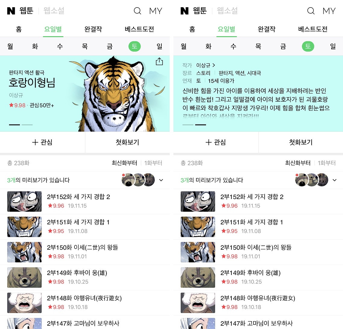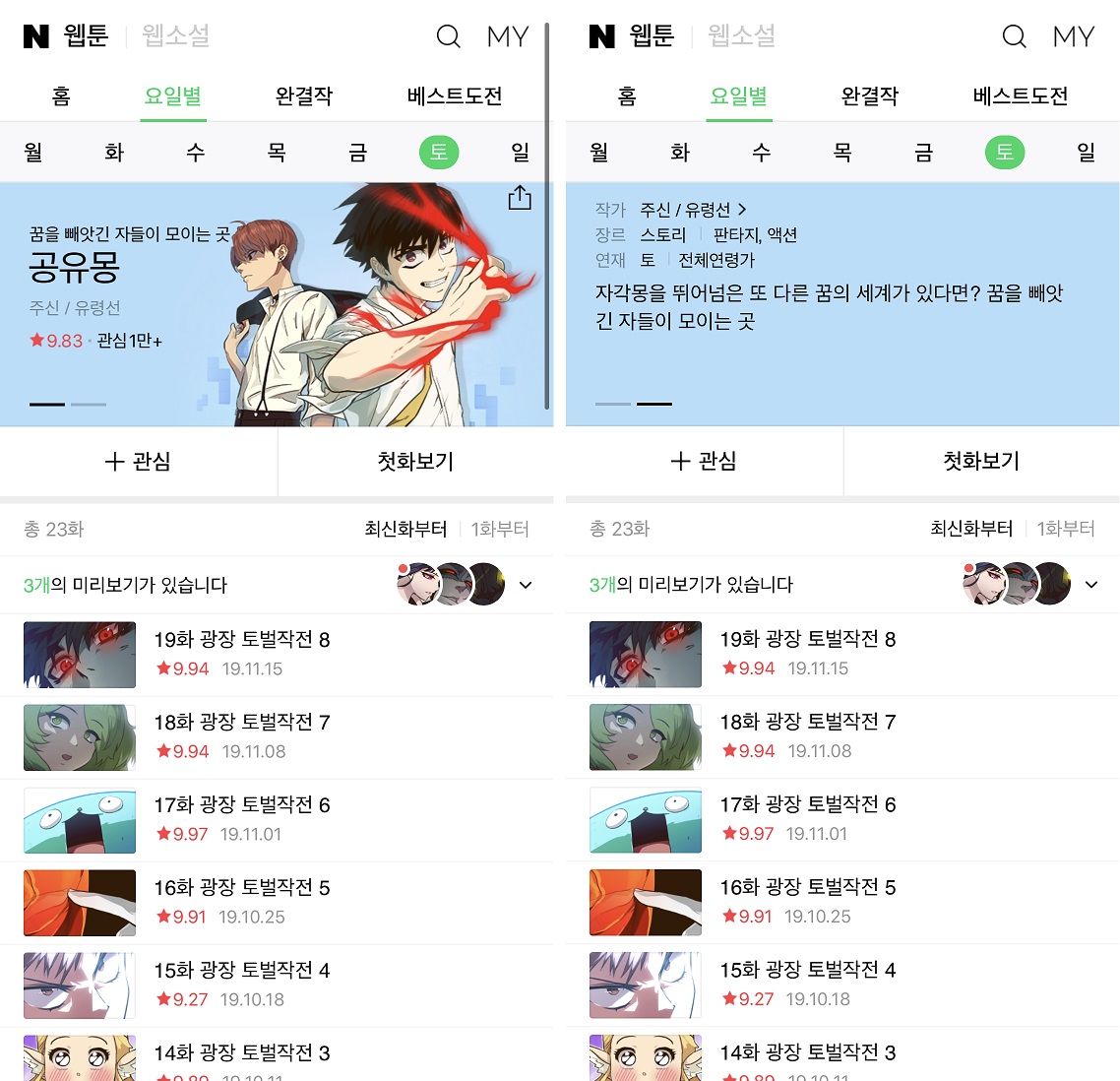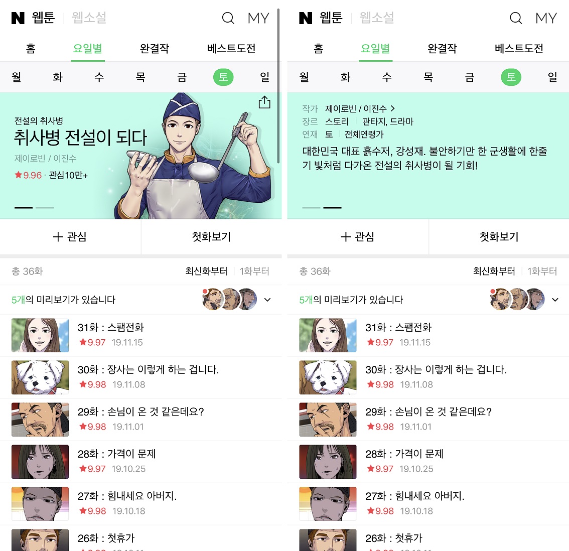 | [2019년 11월 기준] 취향 따라! 네이버웹툰 일요일 연재작 리뷰 (후기/추천) (0) | 2019.12.08 |