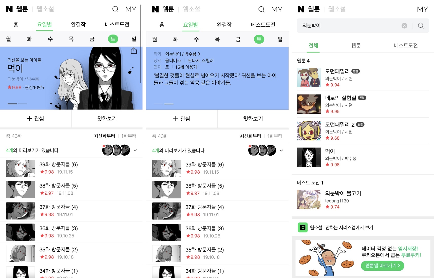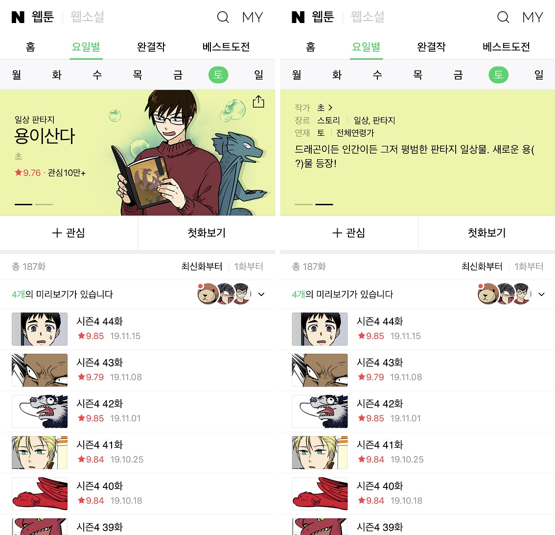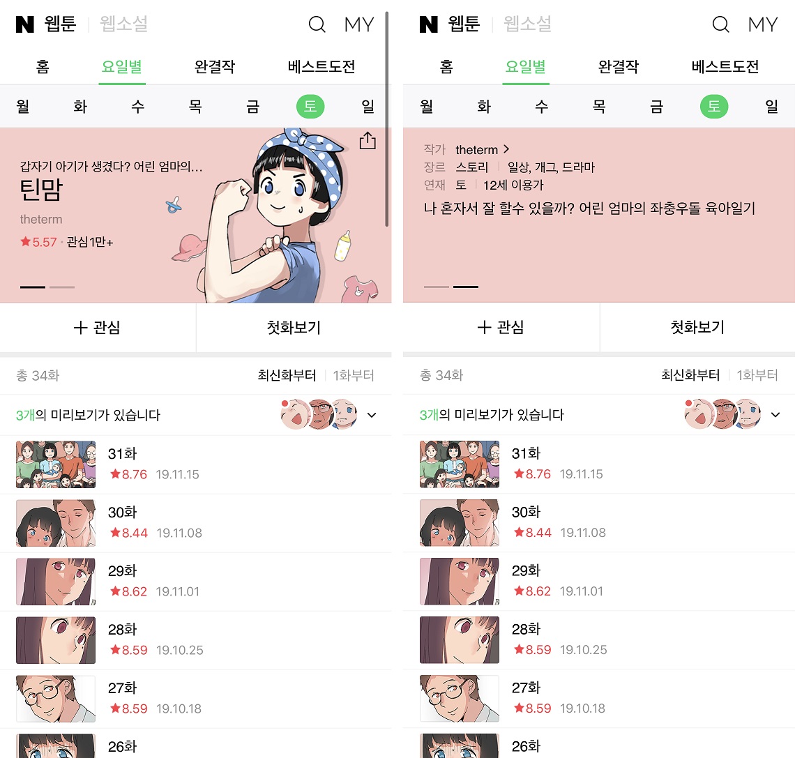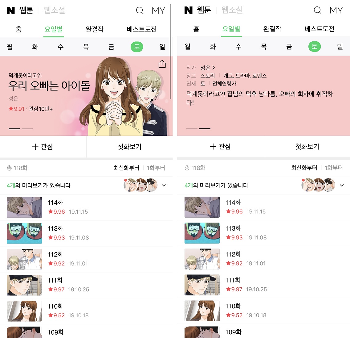 | [2019년 11월 기준] 취향 따라! 네이버웹툰 일요일 연재작 리뷰 (후기/추천) (0) | 2019.12.08 |
