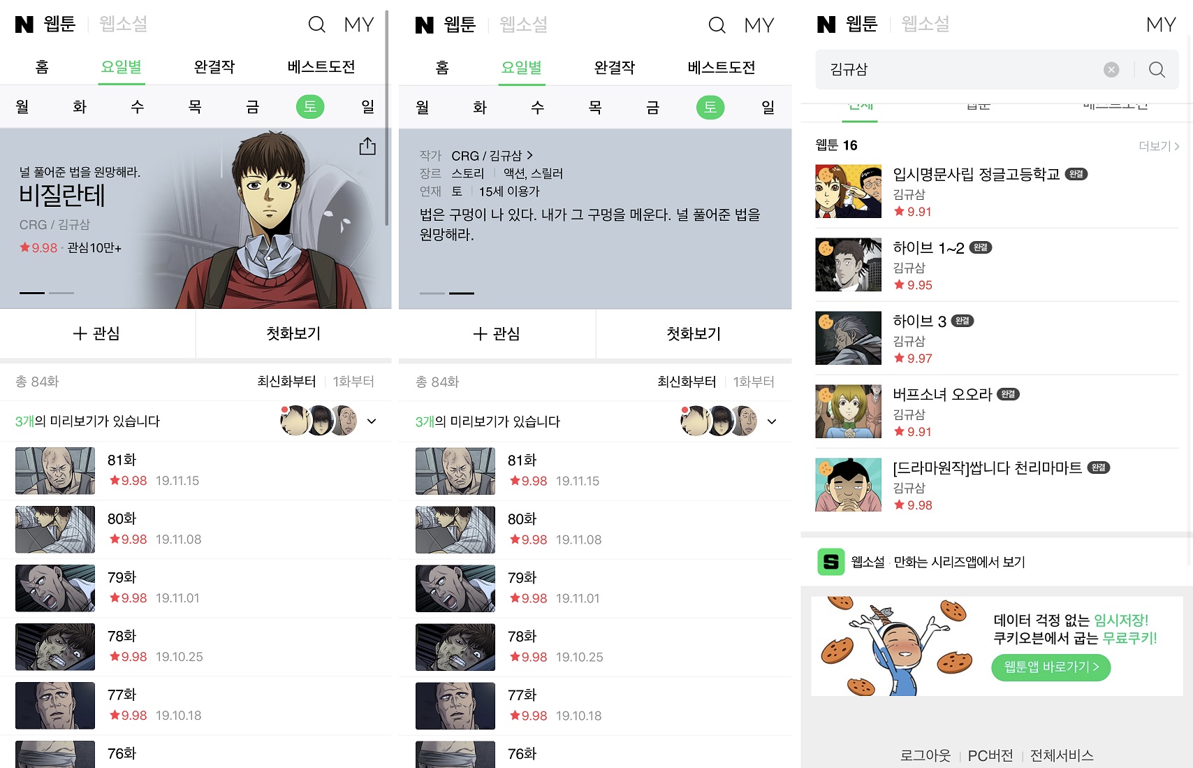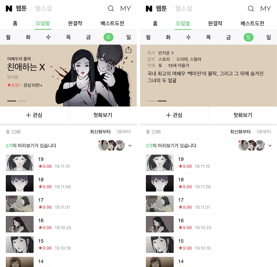 | [2019년 11월 기준] 취향 따라! 네이버웹툰 화요일 연재작 리뷰(후기/추천) (0) | 2019.12.03 |