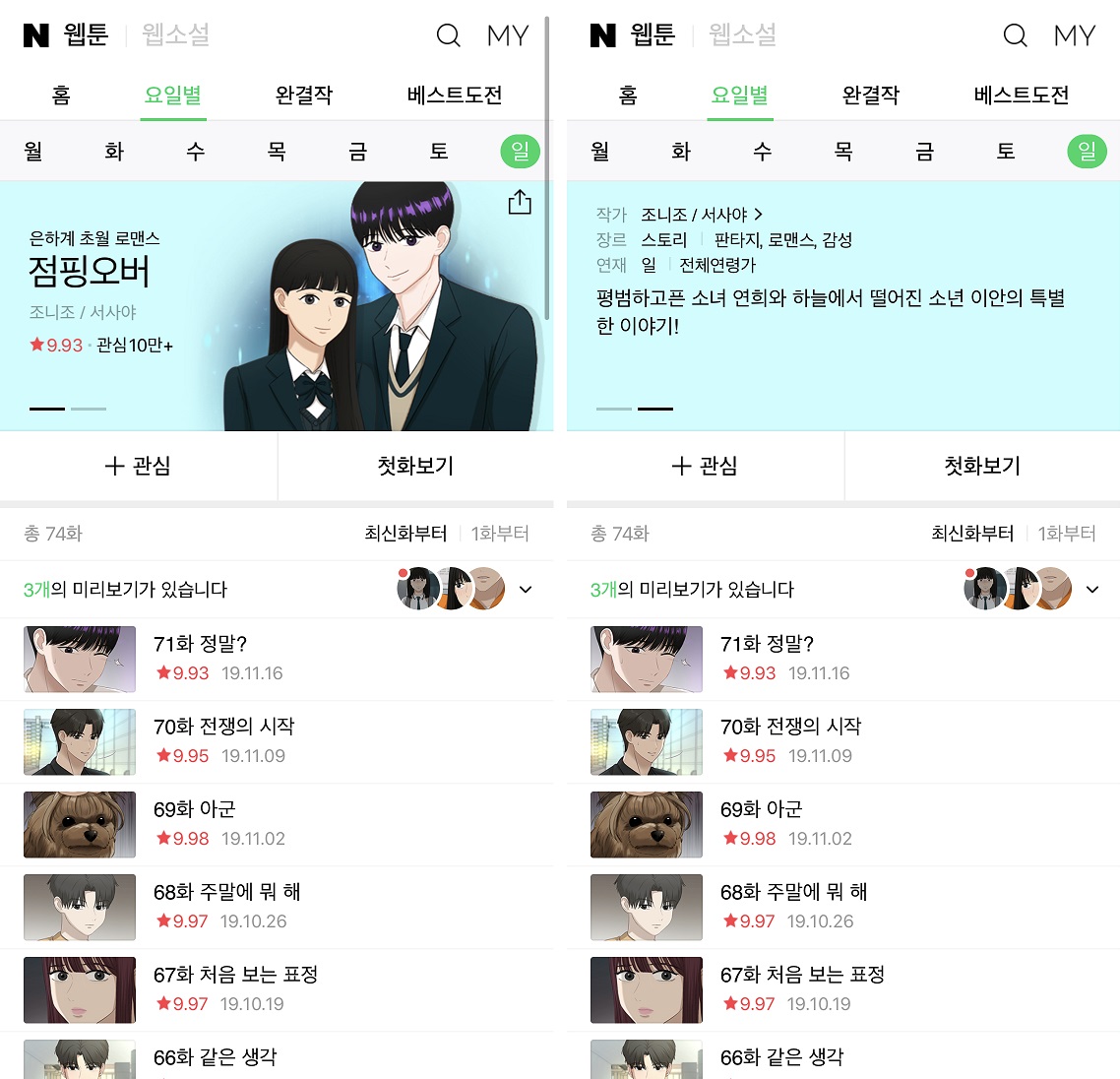 | [2019년 11월 기준] 취향 따라! 네이버웹툰 토요일 연재작 리뷰 (후기/추천) (0) | 2019.12.07 |
