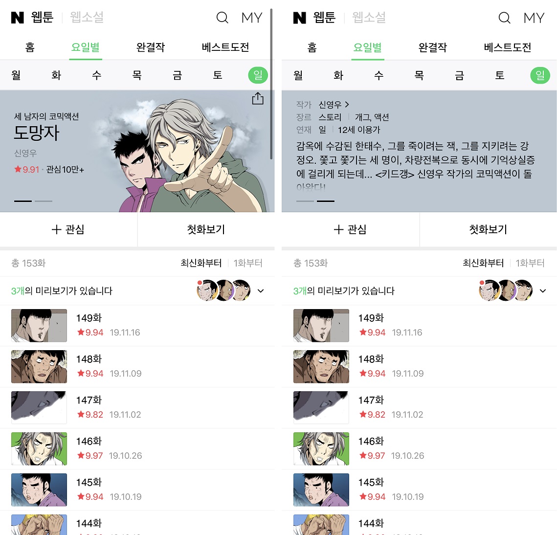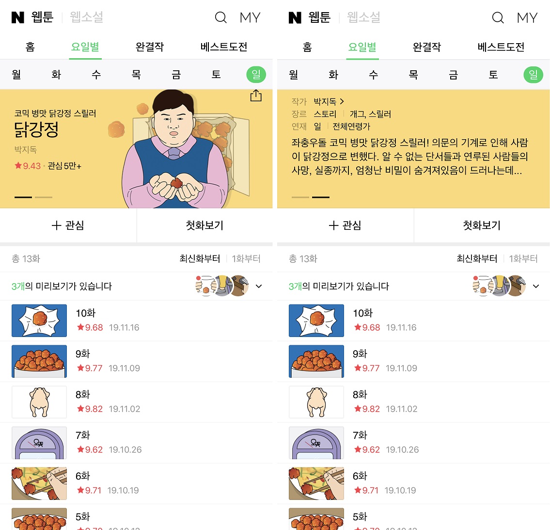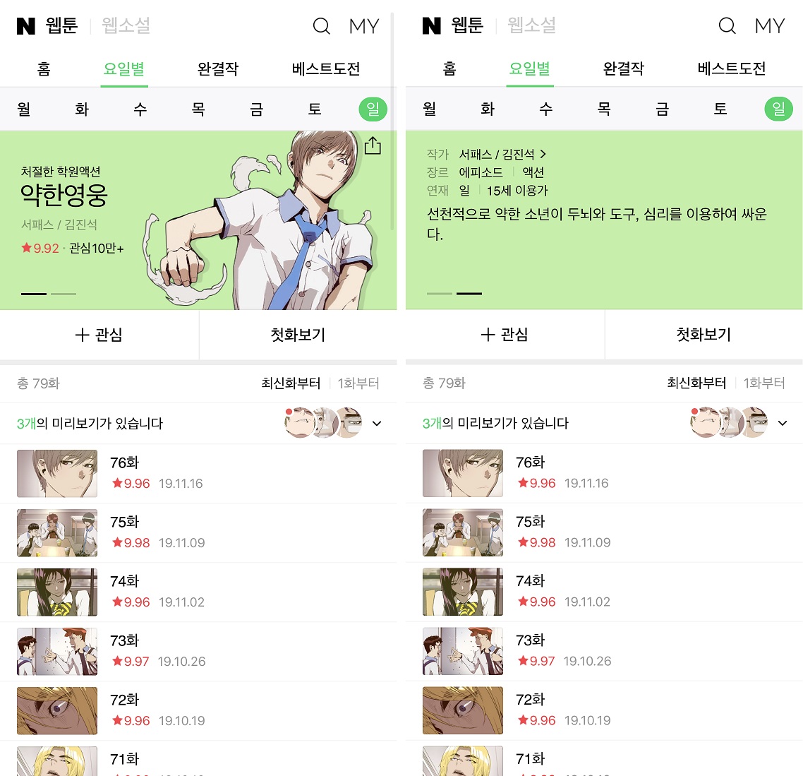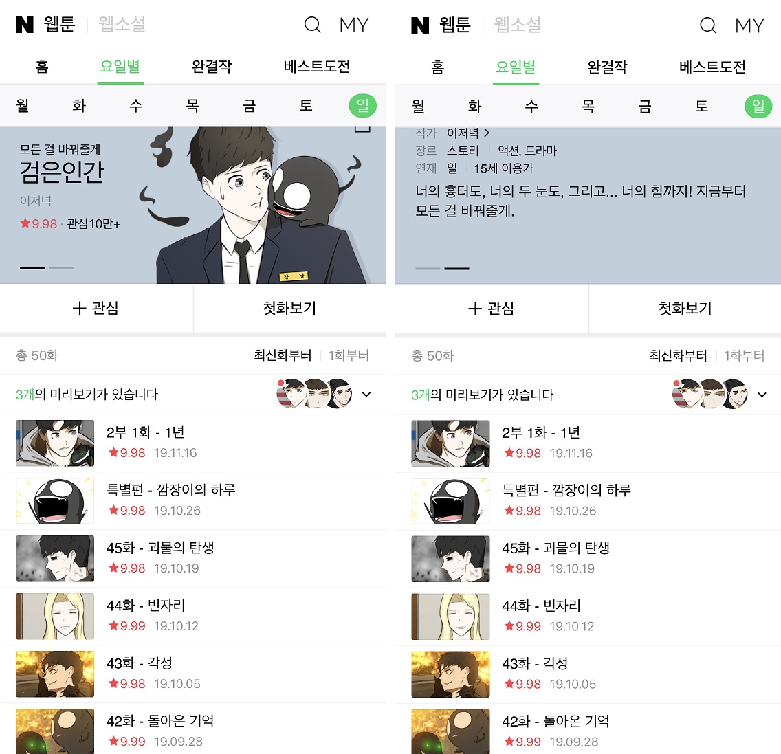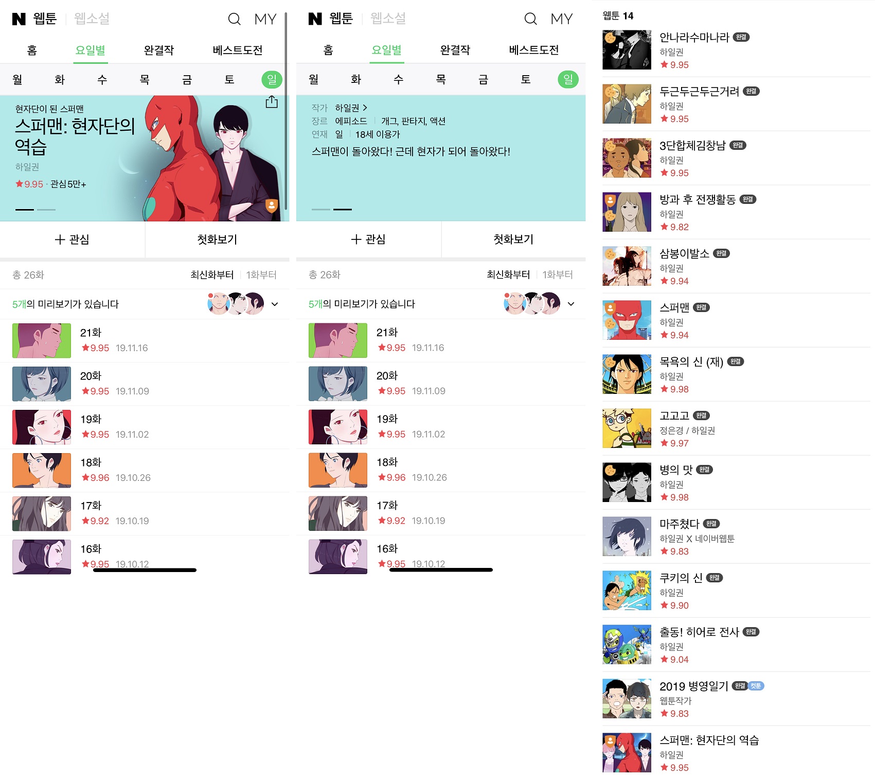 | [2019년 11월 기준] 취향 따라! 네이버웹툰 금요일 연재작 리뷰 (후기/추천) (0) | 2019.12.06 |