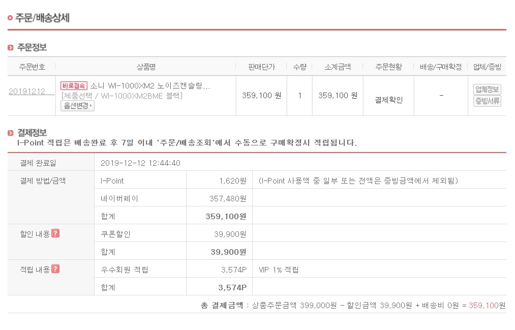제 기준으로는 갑작스럽게 1000x 시리즈의 신작 wi-1000xm2가 출시되었습니다. 잠시의 고민 끝에 구입을 했어요. 색상은 블랙과 실버 두 색상으로 나왔습니다. 전 블랙을 선택했어요. 사용 포인트는 제외하고, 네이버 검색가 기준으로 359,000원에 구입했습니다. 정가는 399,000원입니다.