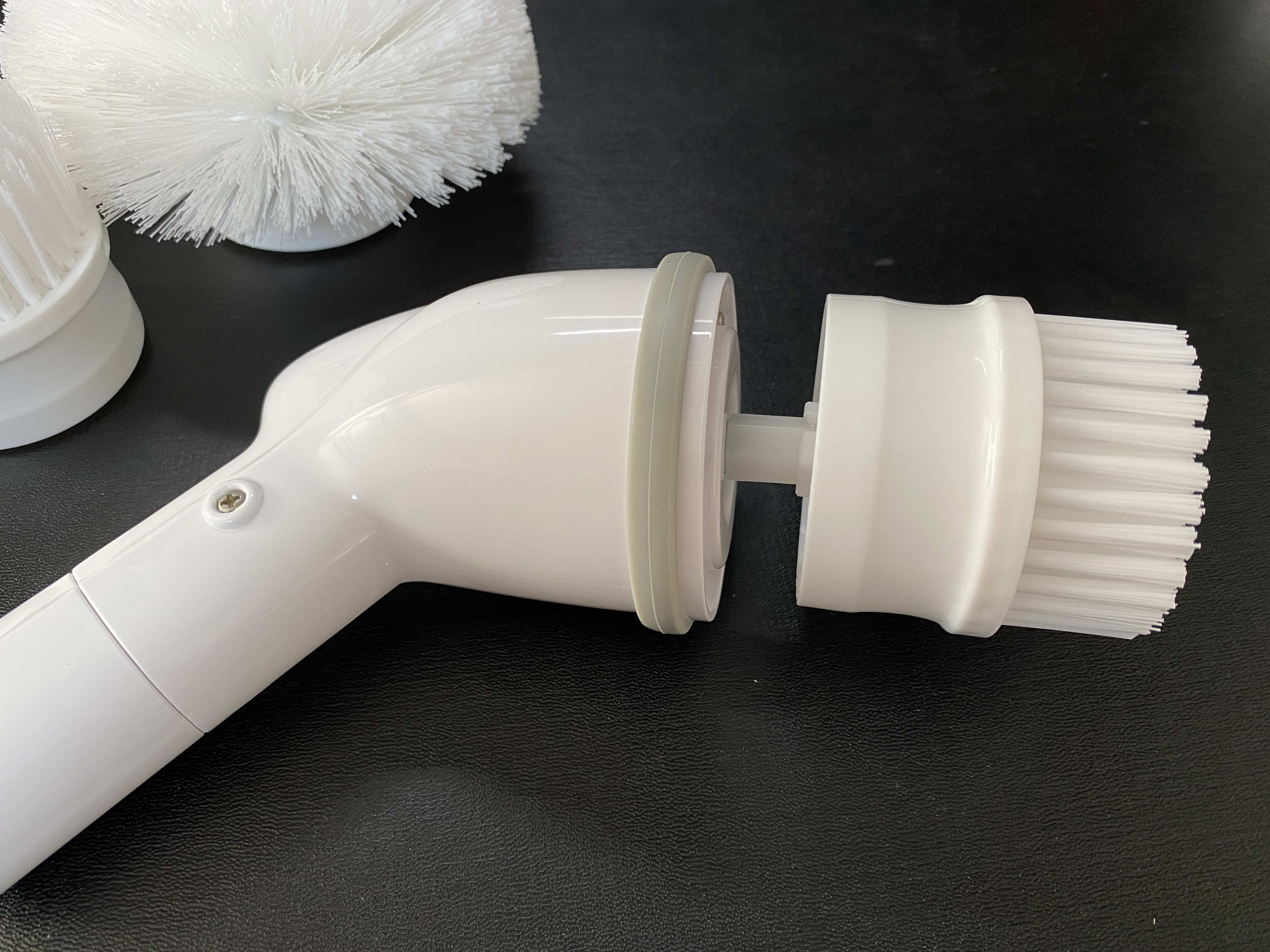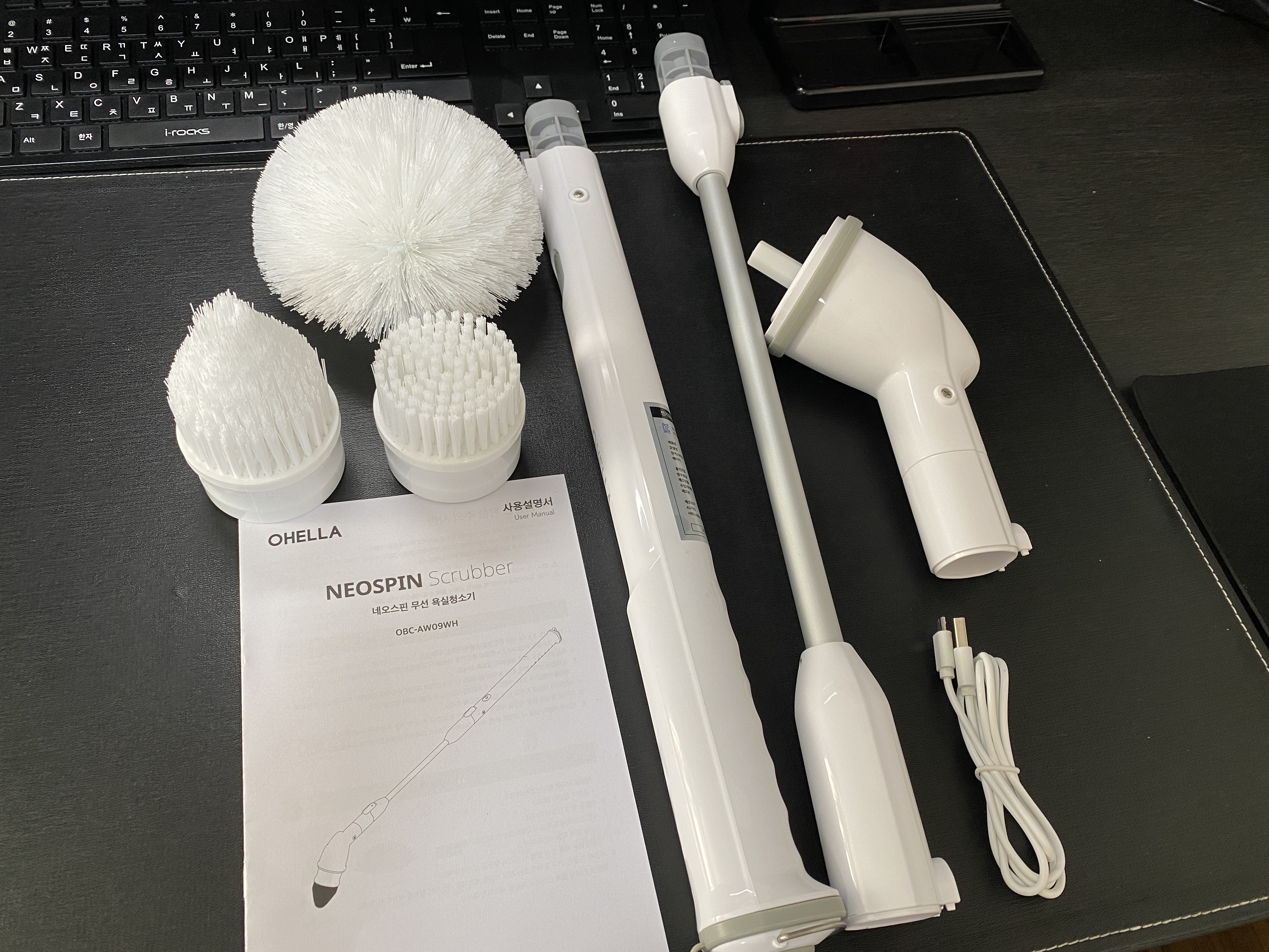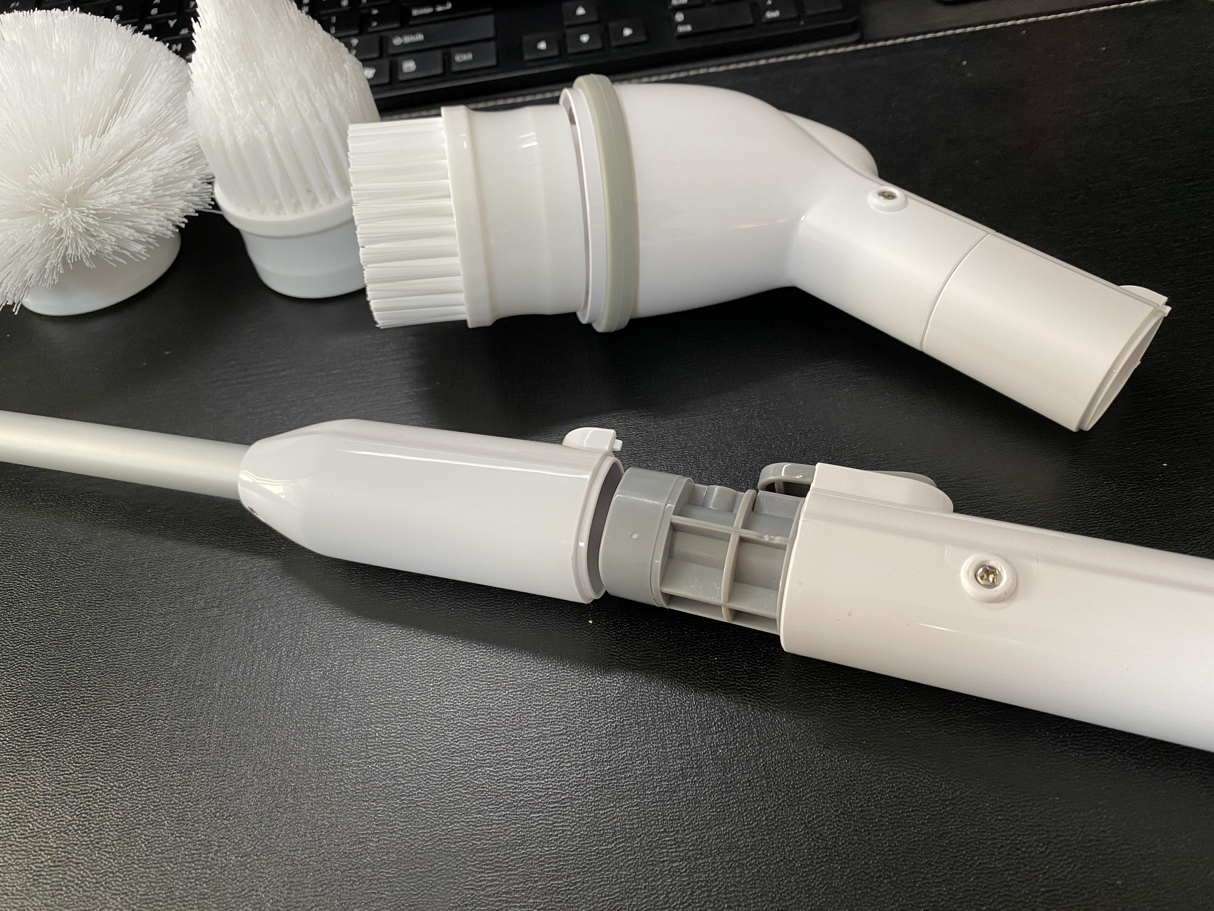 연결은 기본적으로 두 번입니다. 본체와 헤드, 솔의 연결이에요. 여기에 길게 사용하고 싶으면 연결대까지 결합하면 됩니다. 실제 사용 시에는 바닥 청소할 때만 연장대를 사용하게 됩니다. 벽이나 변기 등을 청소할 때는 짧은 게 낫더라고요.