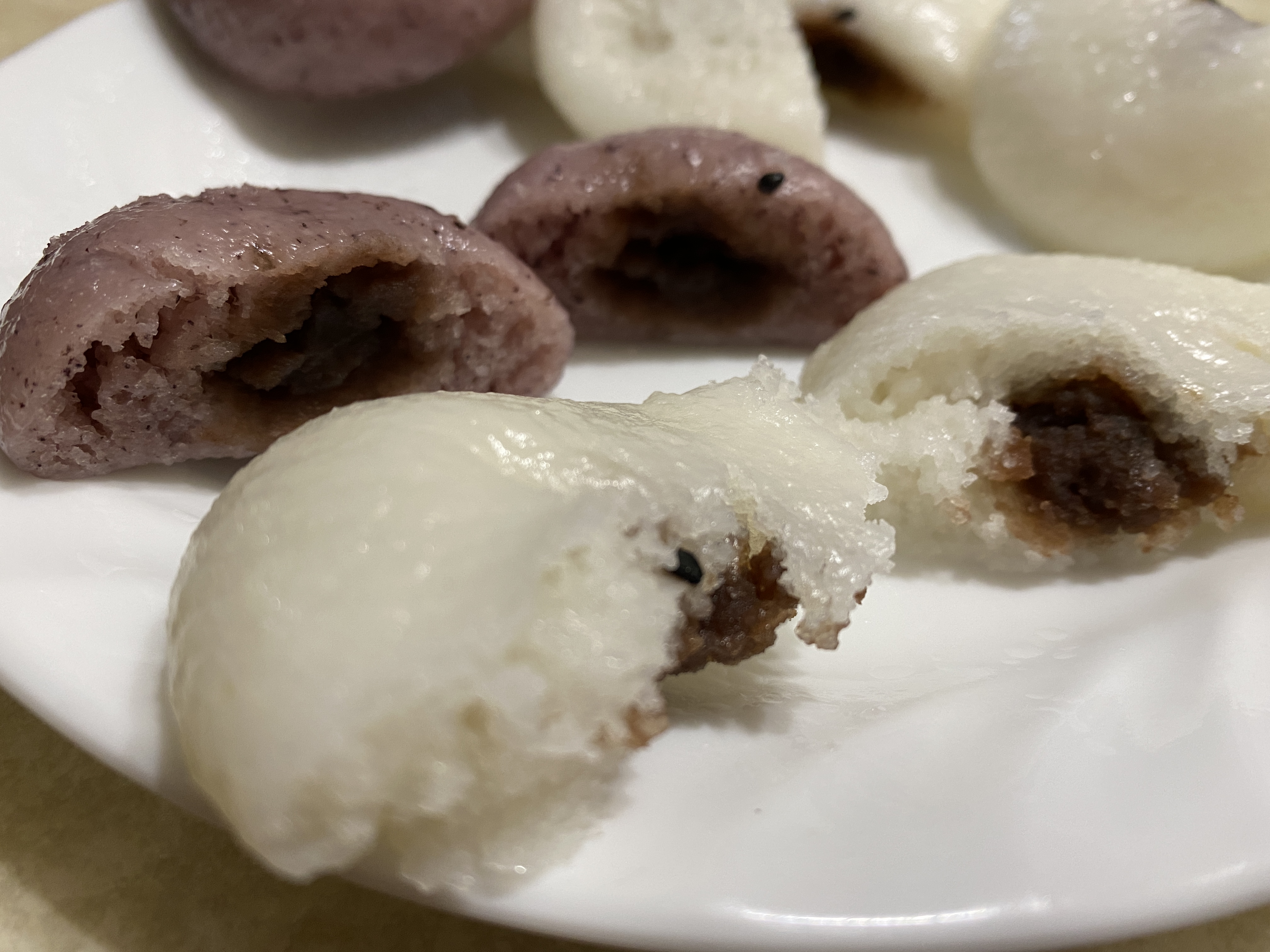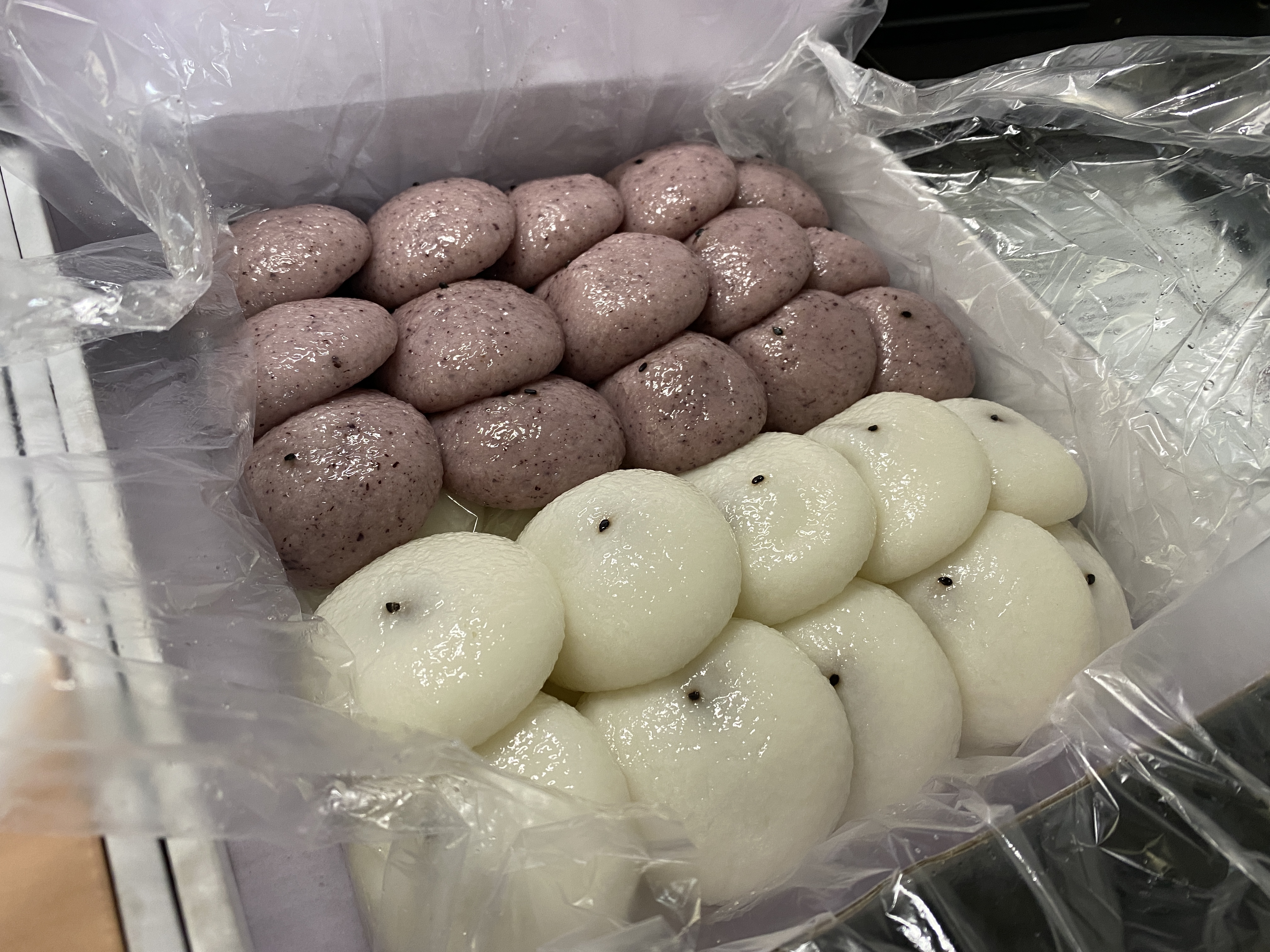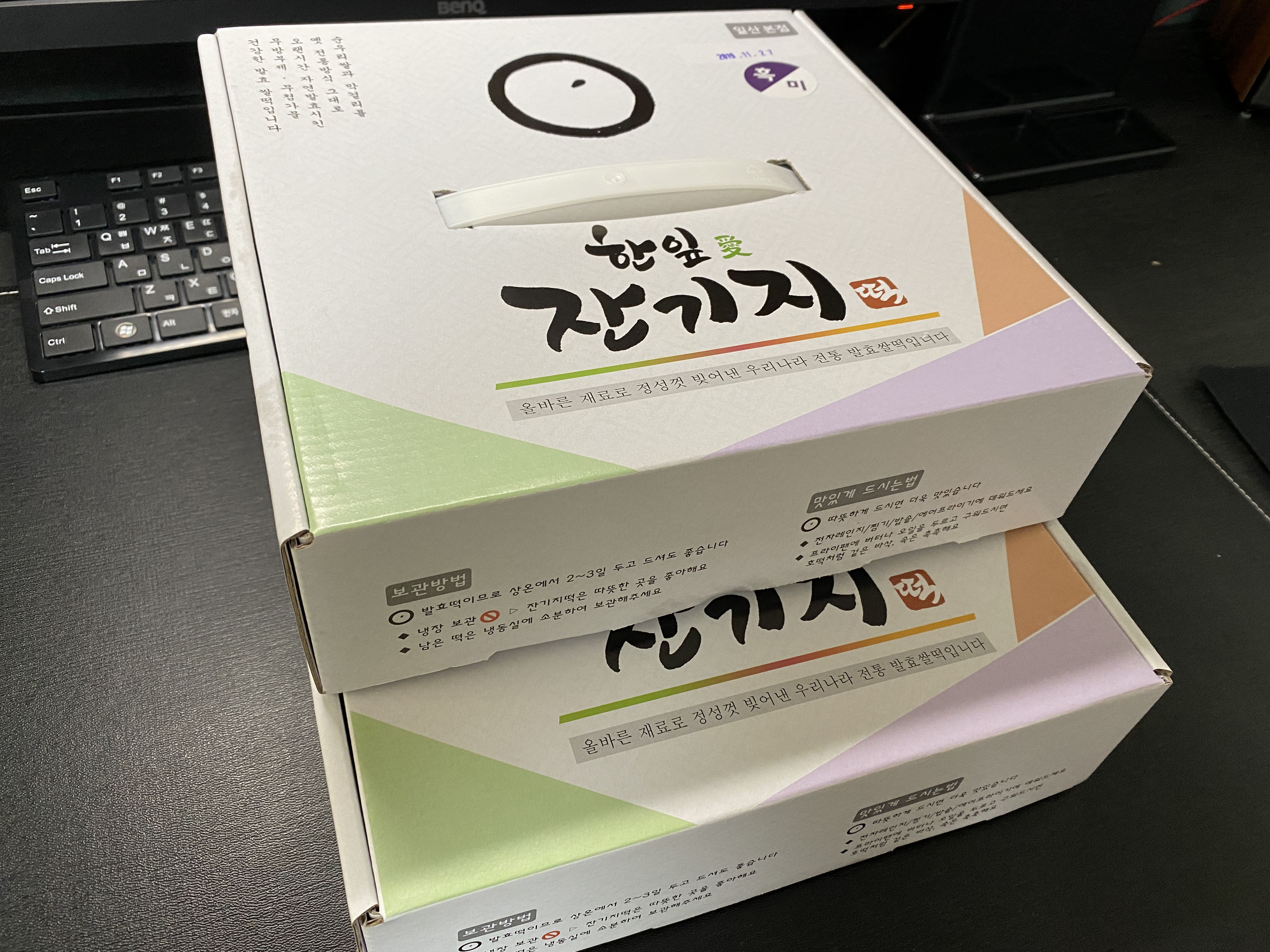 제품의 종류에는 앙금, 무앙금, 흑미잔기지떡으로 세 종류에요. 전 앙금과 흑미잔기지떡 반반으로 주문을 했습니다. 개별로 나눈 후 냉동 보관을 하고요. 한 번에 다섯 개 정도 꺼내서 먹습니다. 가정용 전자레인지 기준으로 2분을 돌리면 딱 알맞게 데워집니다.