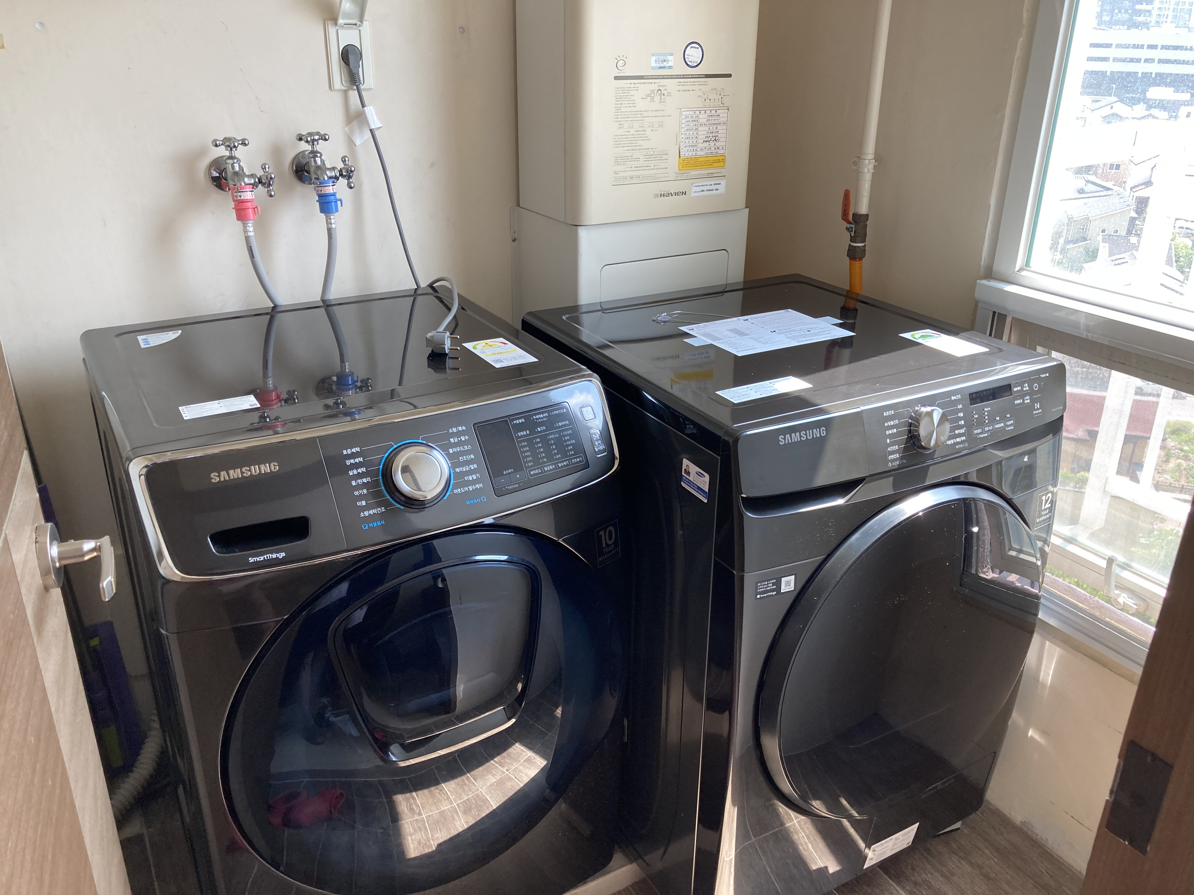 대부분 가전은 해당 제조사 물류센터 직배송입니다. 건조기도 마찬가지였어요. 늘 친절한 삼성 전문 설치 기사님들이 약속된 시간에 오셔서 설치를 해주셨습니다. 전 당연히 세탁기 위로 올리려고 했는데요. 세탁실 구조상 위로 올리면... 세탁실 문이 안 닫히더라고요;; 엄청 당황했습니다. 그래서 부득이하게 세탁기 우측에 좌우로 배치하게 됐어요. 이사 등을 대비해서 상단 키트는 잘 보관하려 합니다.ㅠㅠ...