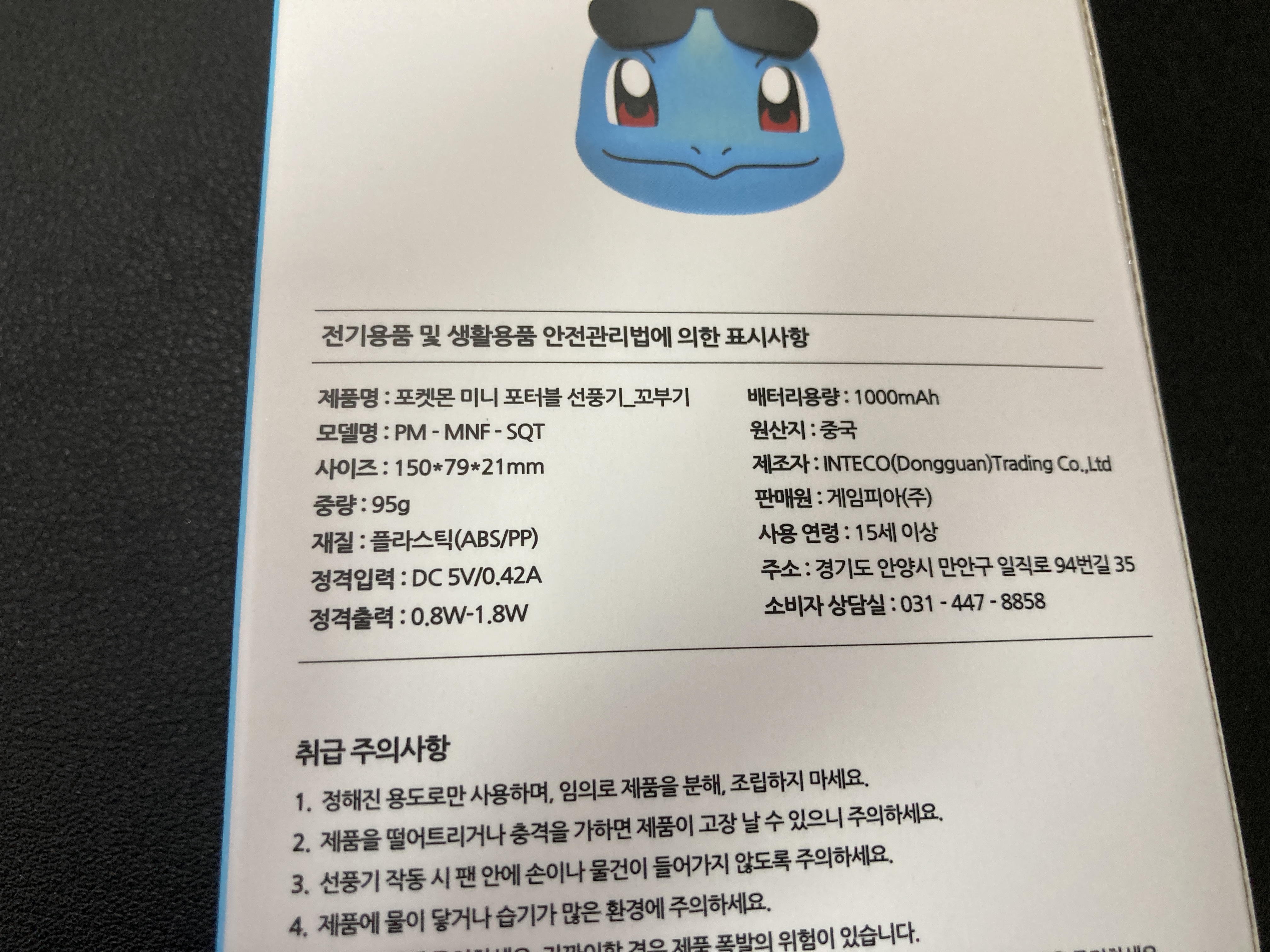 제가 받은 제품은 미니 포터블 선풍기에요. 이 제품은 정가 19,800원입니다. 핸디 선풍기 치고는 저가 라인은 아니에요. 아무래도 포켓몬스터 캐릭터를 사용하다 보니 비용이 올라갈 수밖에 없었을 거예요. 가격을 고려하면 포장은 나쁘지 않습니다만... 제 취향은 아닙니다. ㅎㅎ 여담으로 체험단 신청 시 제품을 선택할 수 없었고, 랜덤으로 받은 건데요. 개인적으로 포켓몬을 원했었어요. 그런데 결과적으로 꼬부기 ㅠㅠ...