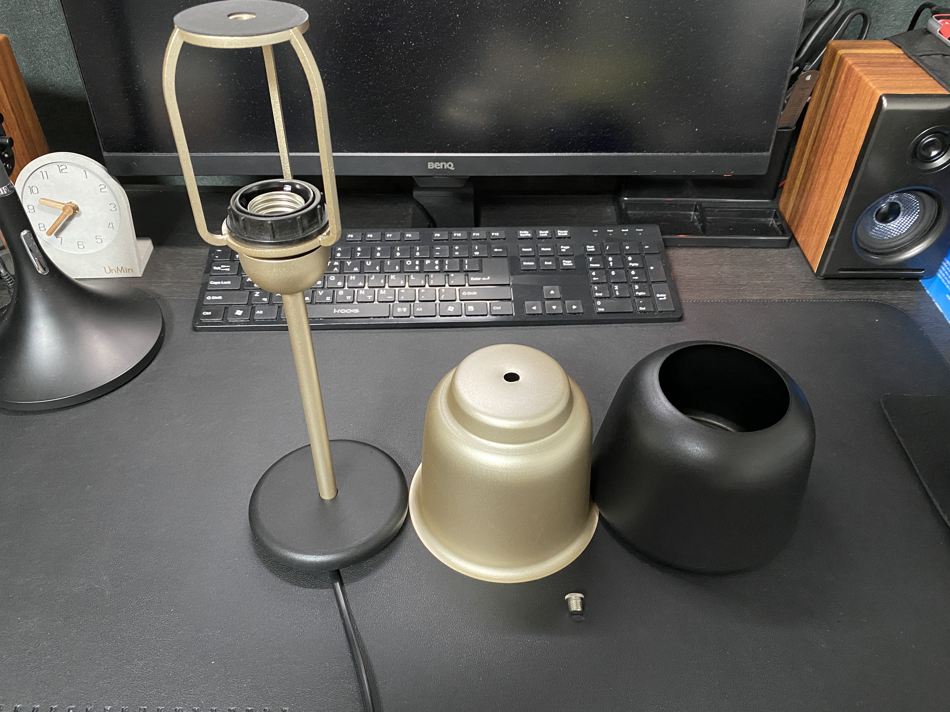 포장도 신경 썼지만... 저가가 아닌 만큼 제품 보증서와 간단한 설명서가 같이 들어 있습니다. 제품 디자인 자체는 이미지에서 봤던 대로 깔끔 그 자체에요. 약간은 과거 학교에서 사용하던 교실종 같은 느낌도 있습니다. 검은 상판을 들어내고 나사를 제거하면 램프를 교체할 수 있습니다.