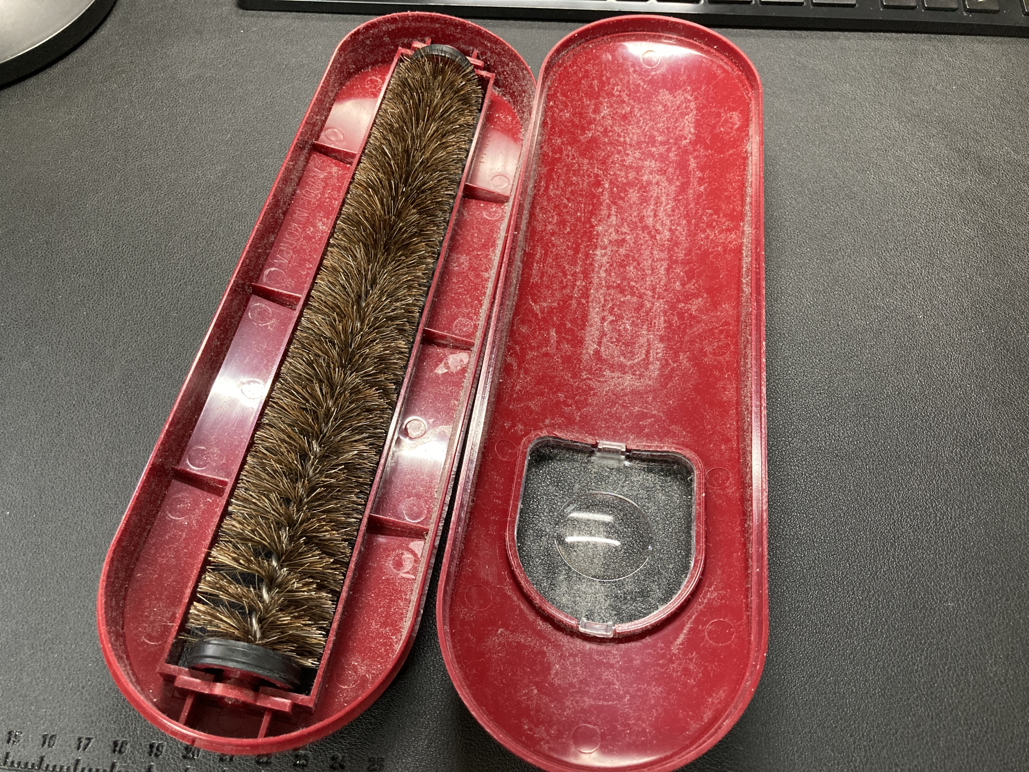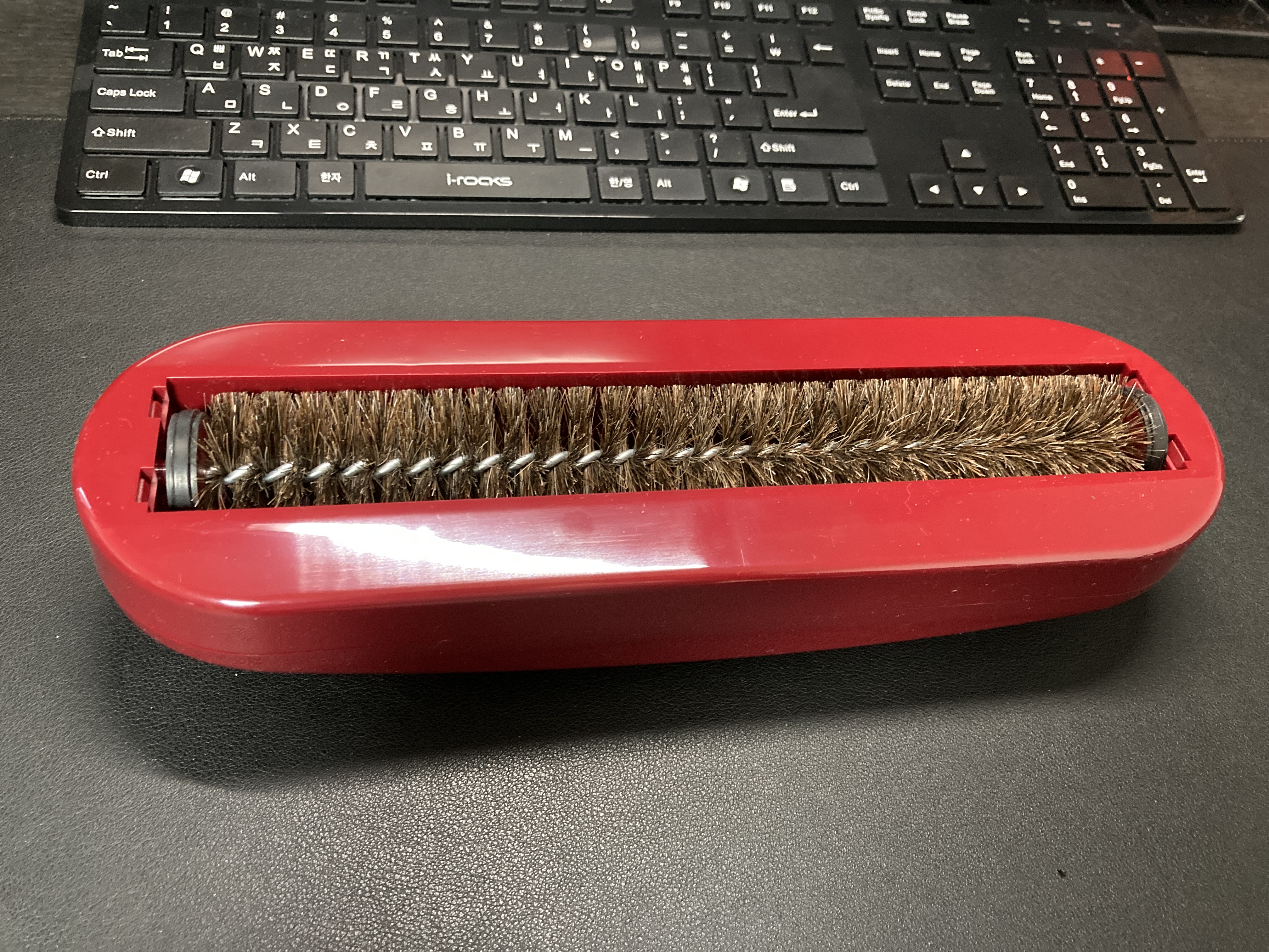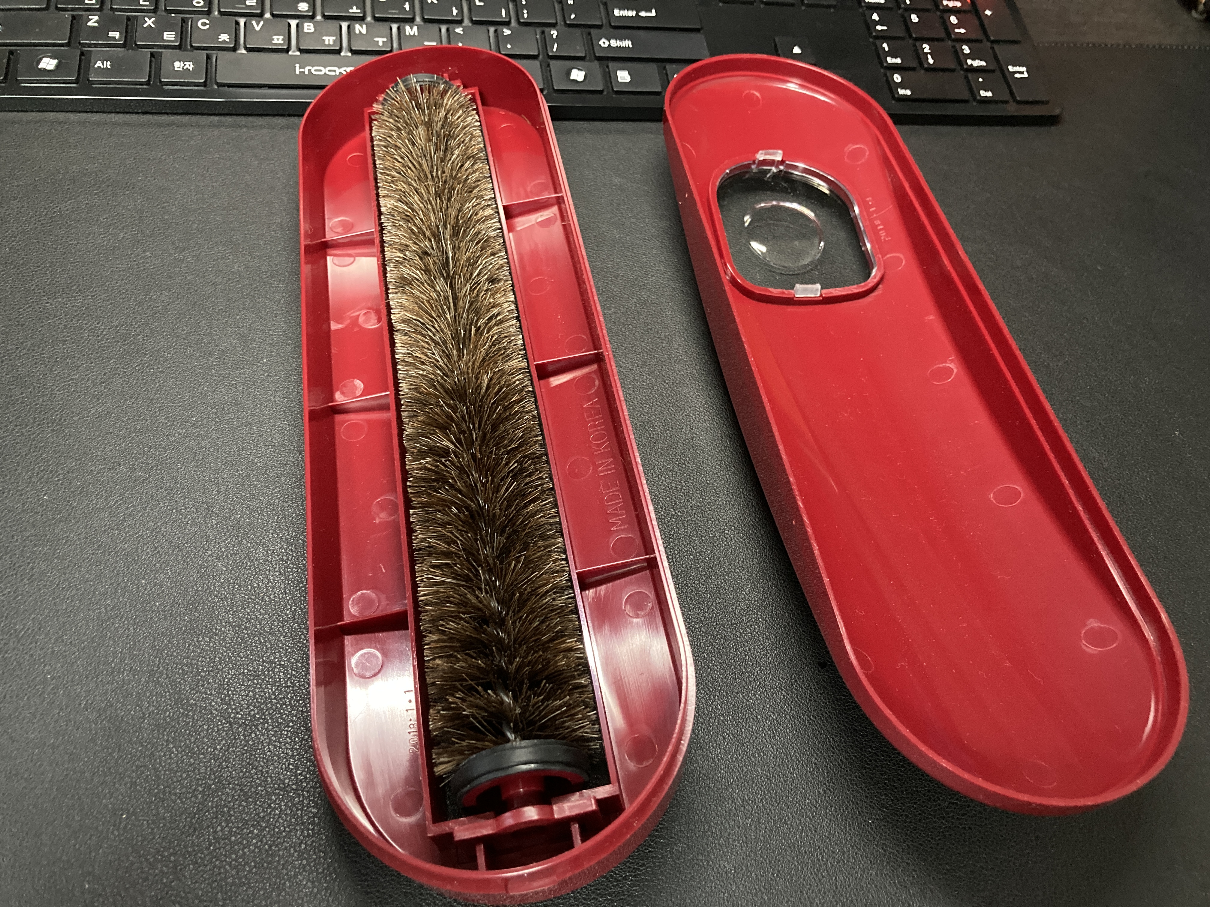 사이즈가 두 가지 종류가 있습니다. 8*20cm인 소 사이즈와 8*28cm인 대 사이즈가 있어요. 전 대 사이즈를 구입했습니다. 복잡할 것 없이 간단합니다. 위에 보면 내부 먼지 쌓인 정도를 알 수 있게 투명창이 있고, 하단 먼지를 청소하는 회전 브러시가 있습니다. 간간이 내부를 비울 수 있게 간단하게 열려요.