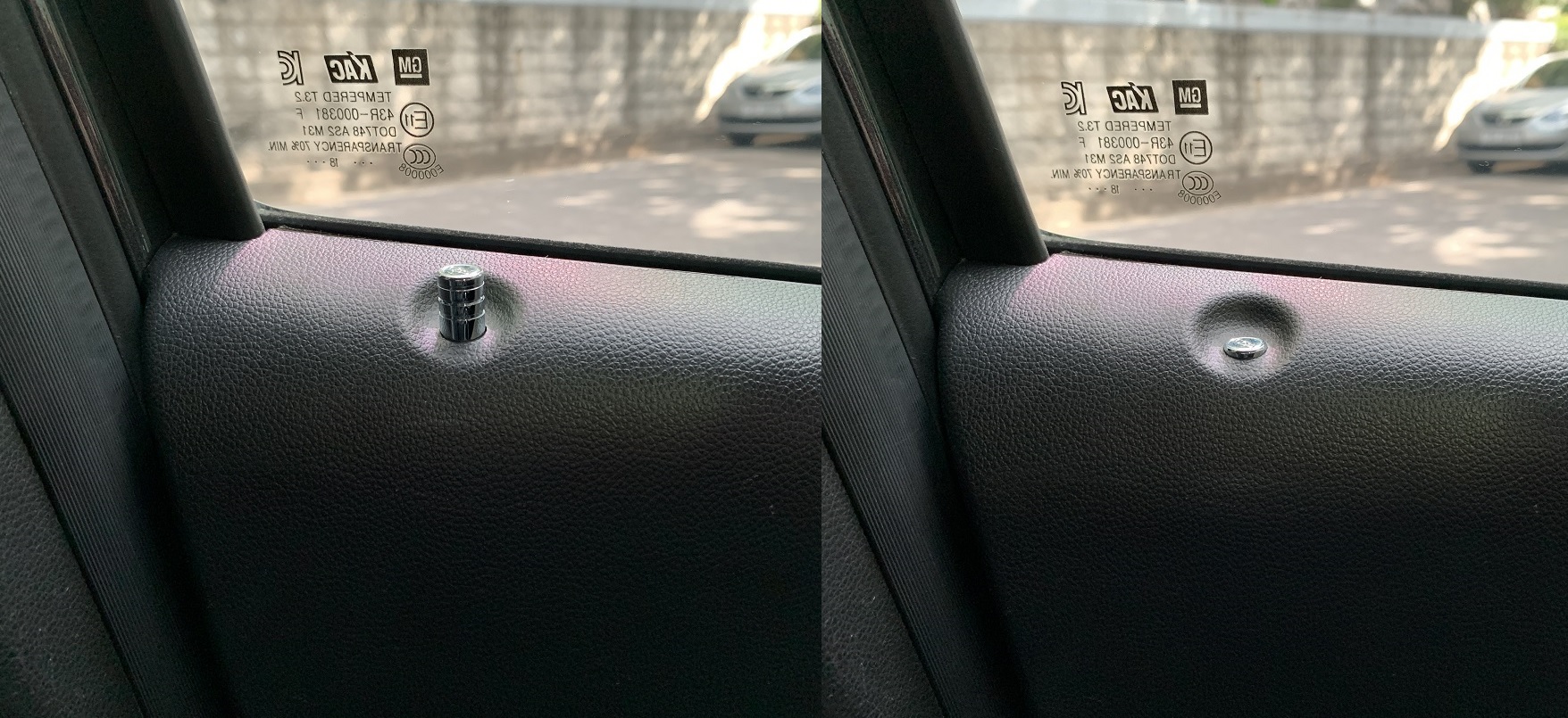 설치에 어려움을 겪어서 그냥 뒀던 크롬 도어핀을 인치업팩토리에서 설치를 받았습니다. 확실히 기존 도어핀보다는 훨씬 이쁩니다. 이 도어핀의 포인트는 잠금 시 안으로 쏙 들어가는 겁니다. 사실 이 부분 때문에 사고 시 안전 부분에 대한 우려가 있었어요. 감안하고 선택해야 하는 부분입니다.