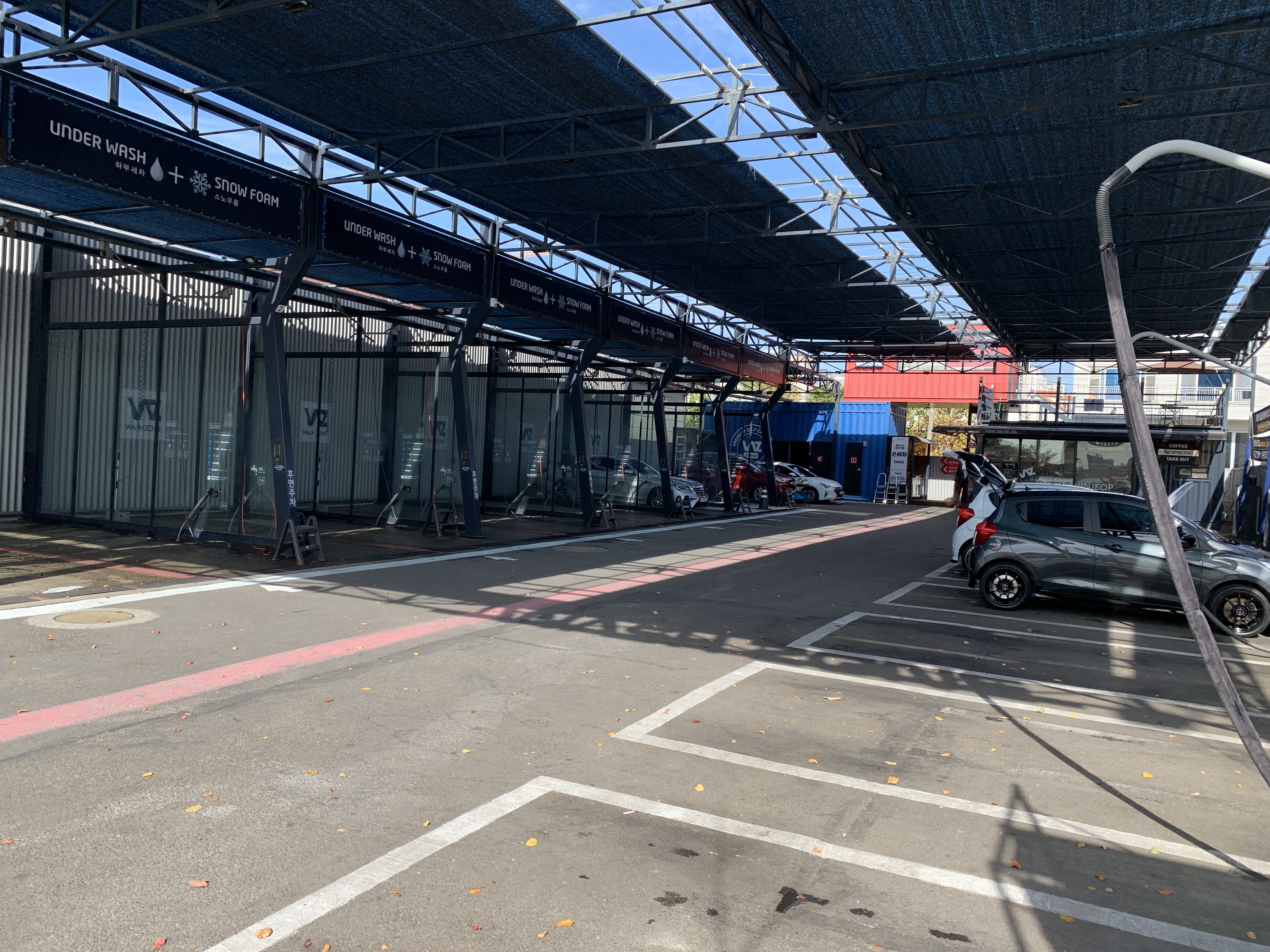 교체는 실내외 세차 후에 하려고 세차를 먼저 진행했습니다. 어느새 차가워진 공기와 평일 오전이라 세차장이 텅텅 비었어요. ㅎㅎ 덕분에 편하게 세차도 진행하고 추가 작업들도 진행할 수 있었습니다.