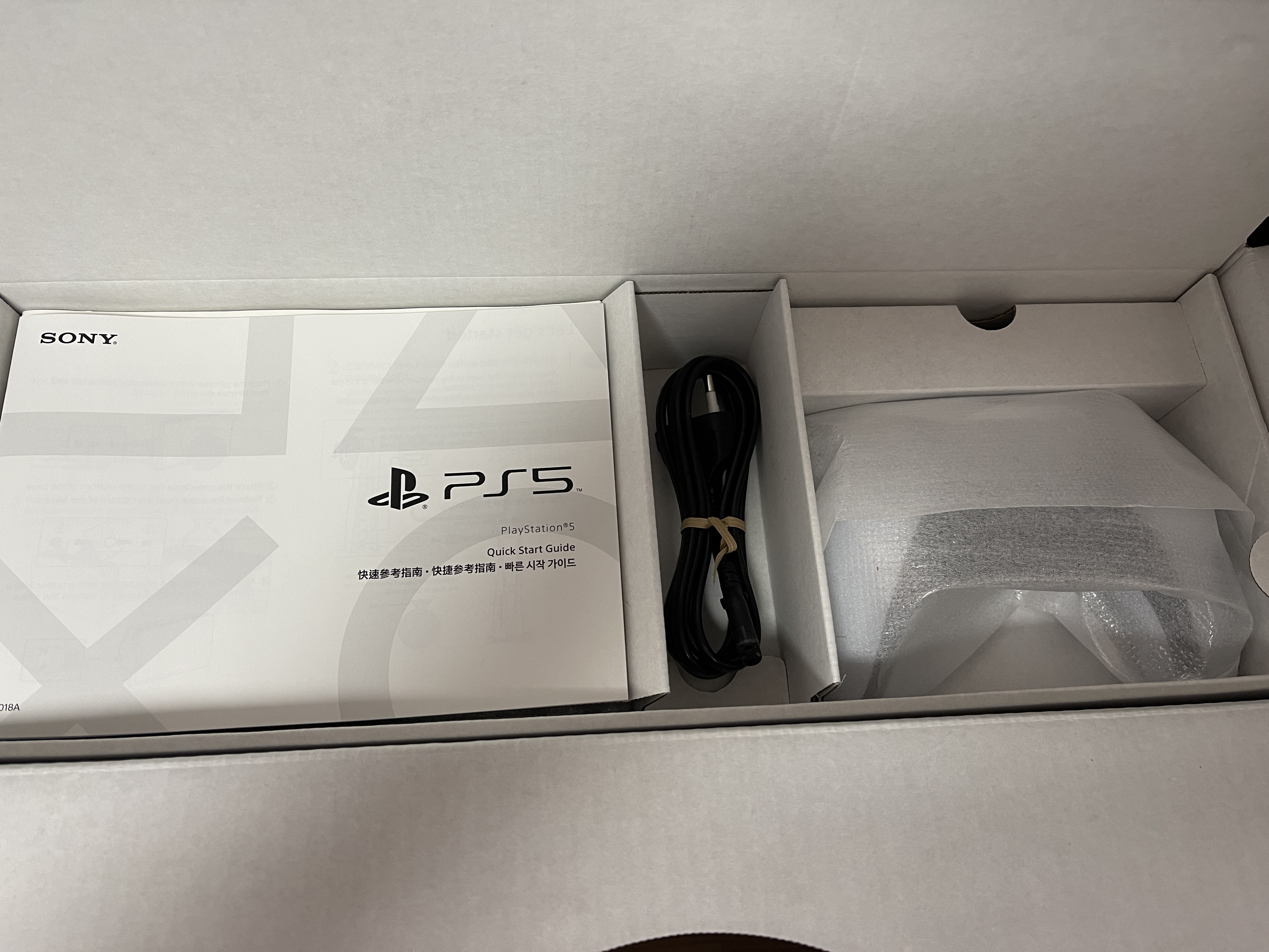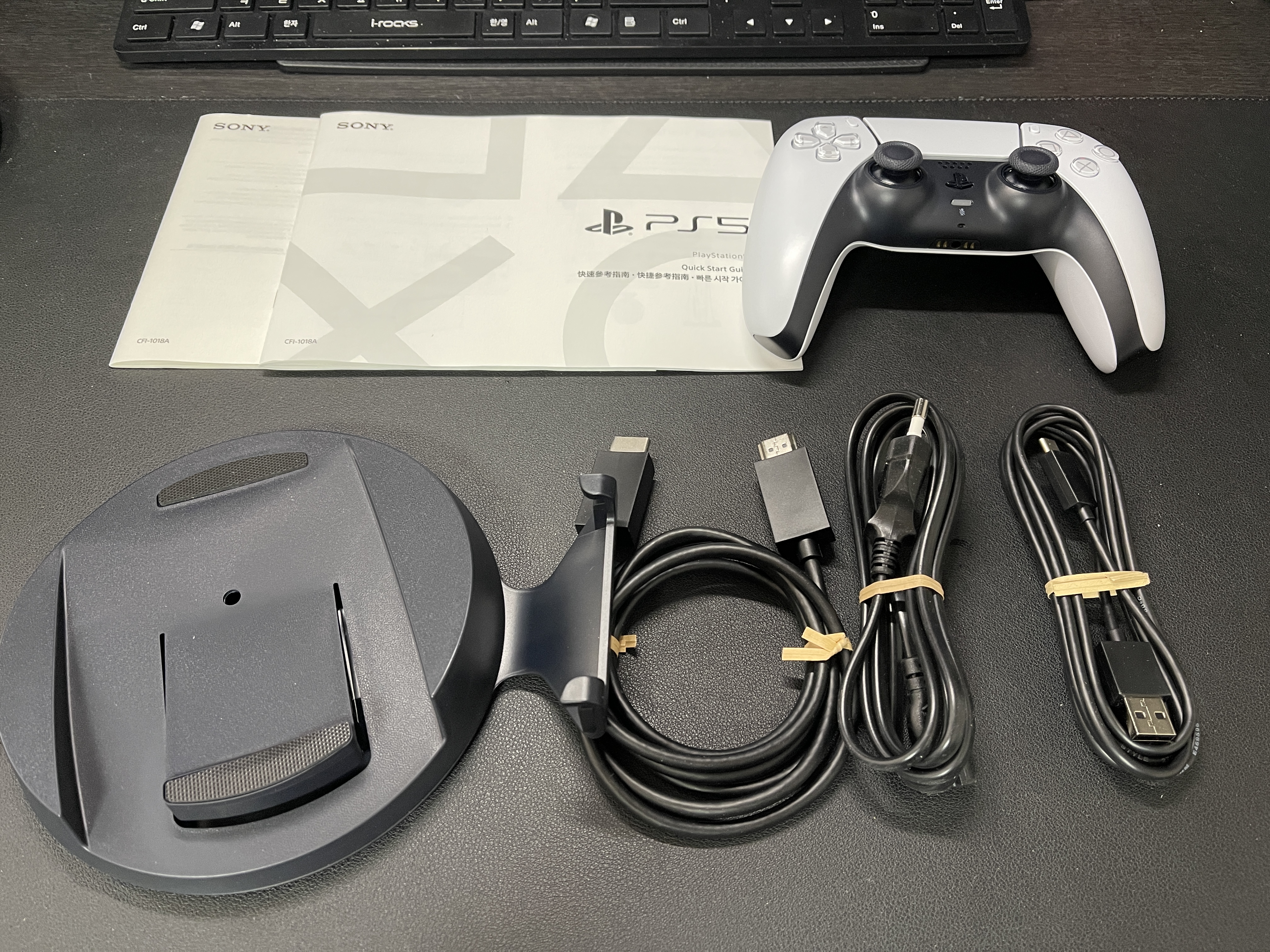 구성은 심플해요. 본체와 설명서, 듀얼센스 1개, 받침대, 충전기, HDMI 케이블, 타입C 듀얼센스 연결용 케이블입니다.