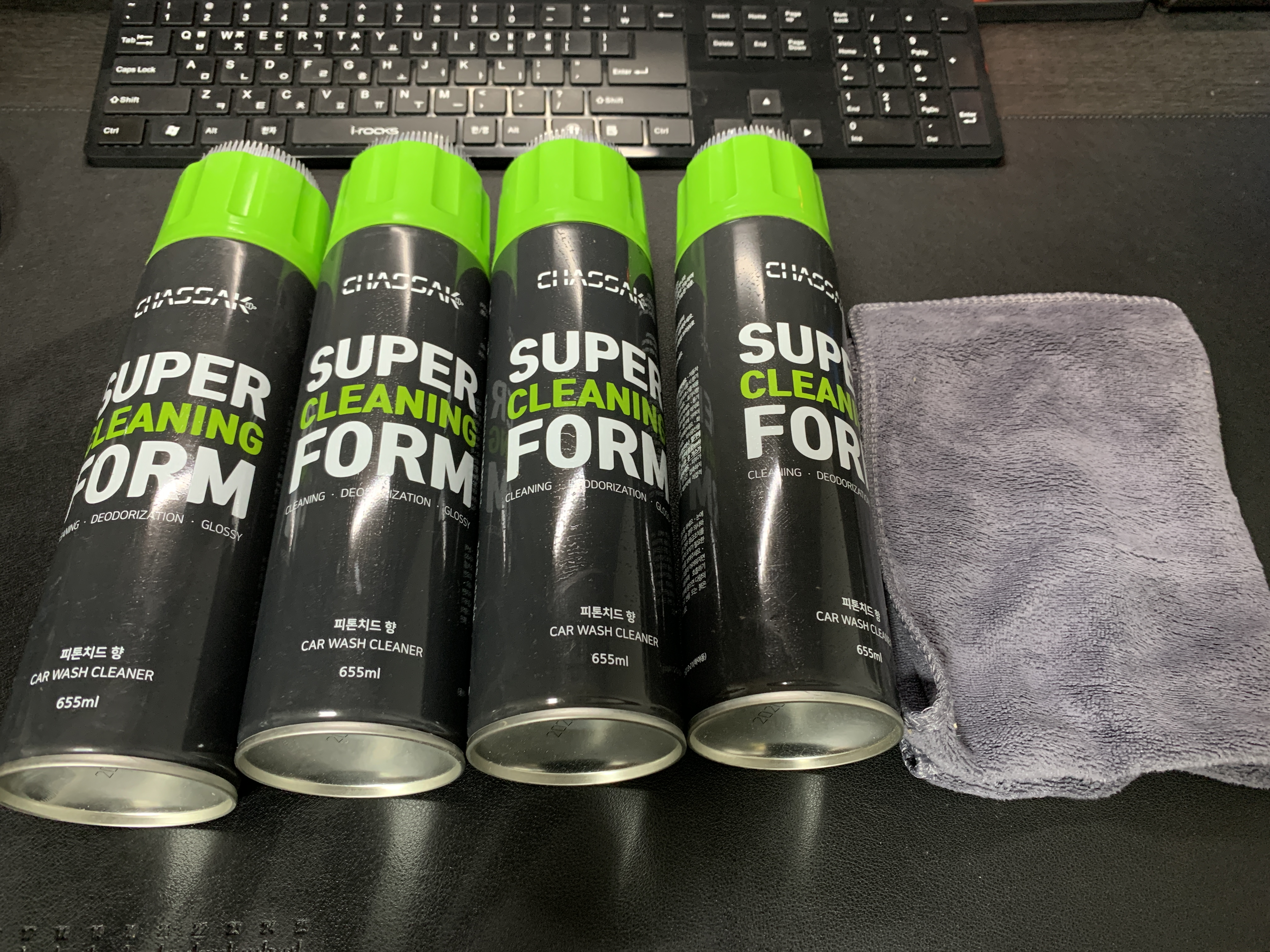 앞서 언급한 대로 실내 세차 도구입니다. 차싹 슈퍼클리닝폼이라는 제품인데요. 방문 세차하시는 분들이 많이 사용하신다고 합니다. 실제 사용은 매우 간단합니다. 분사 시 거품이 나와요. 그걸 뿌린 후 액체로 변하면 타월로 닦아내면 됩니다. 전자 기기 등에는 직접 분사하지 말고 타월에 뿌린 후 닦으라고 설명해요.