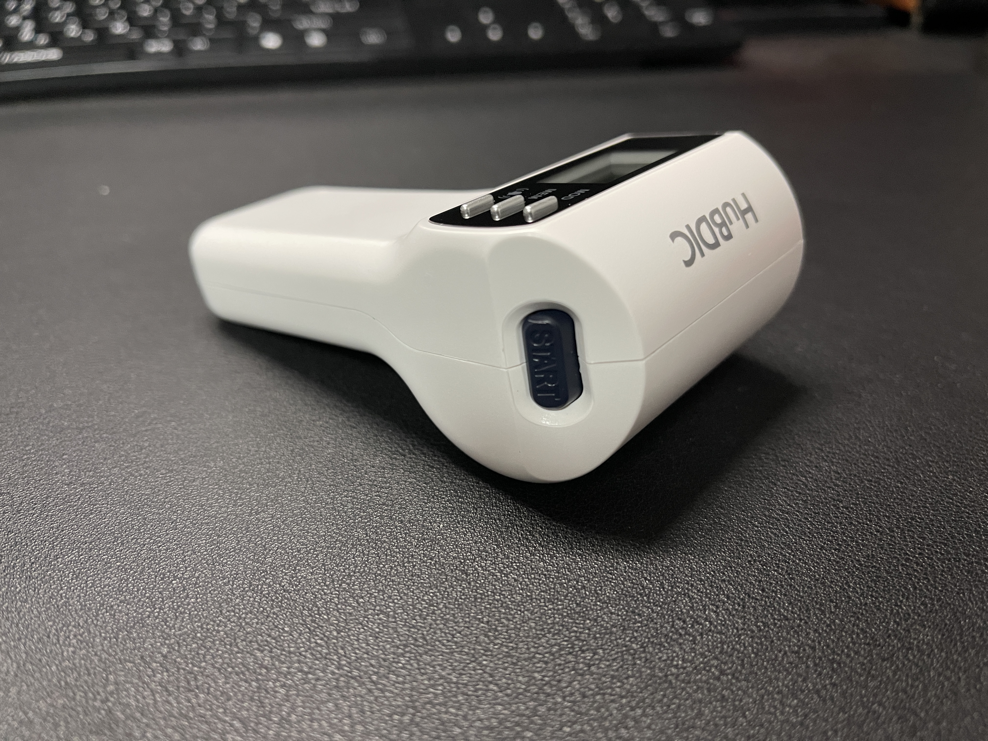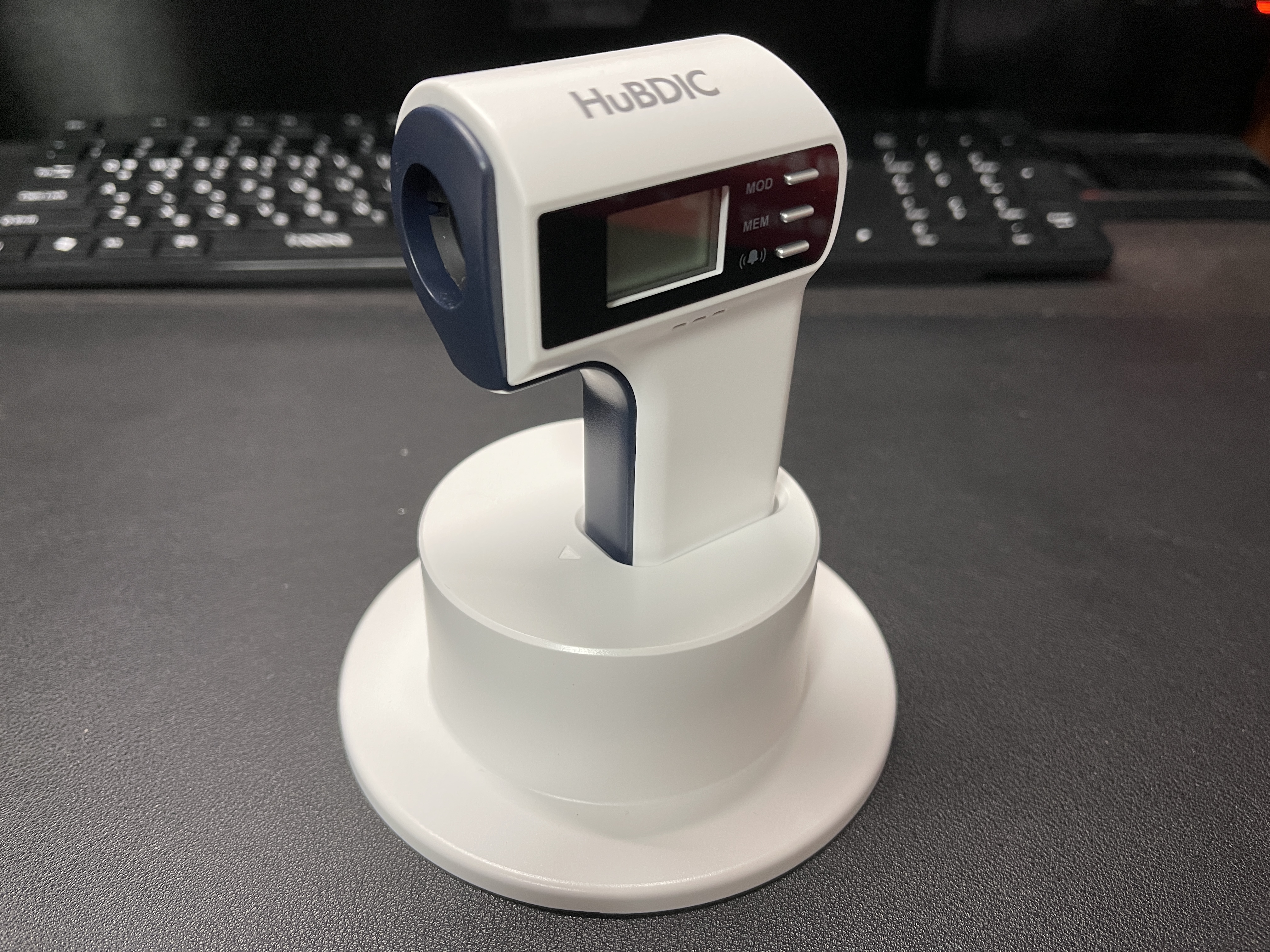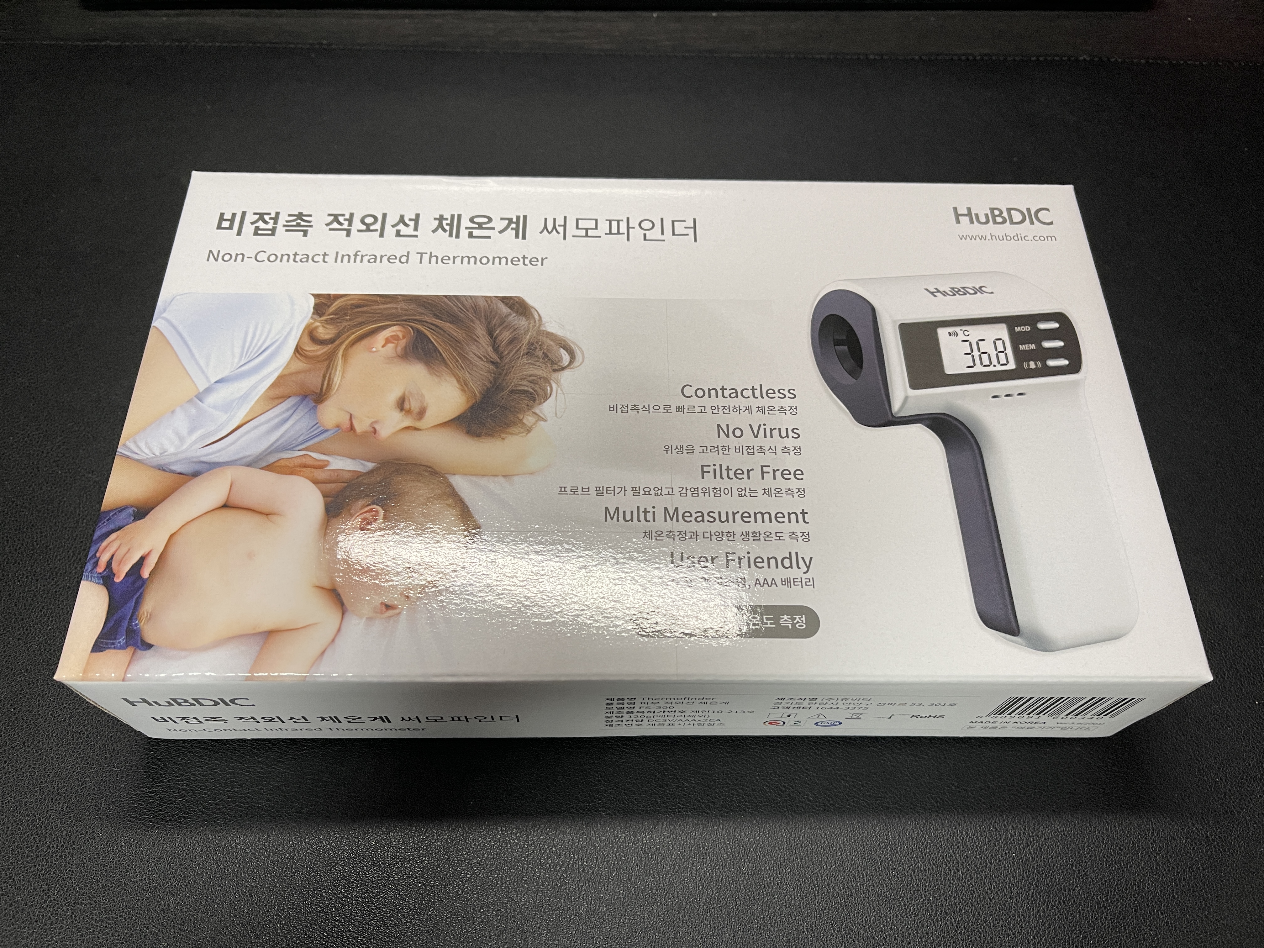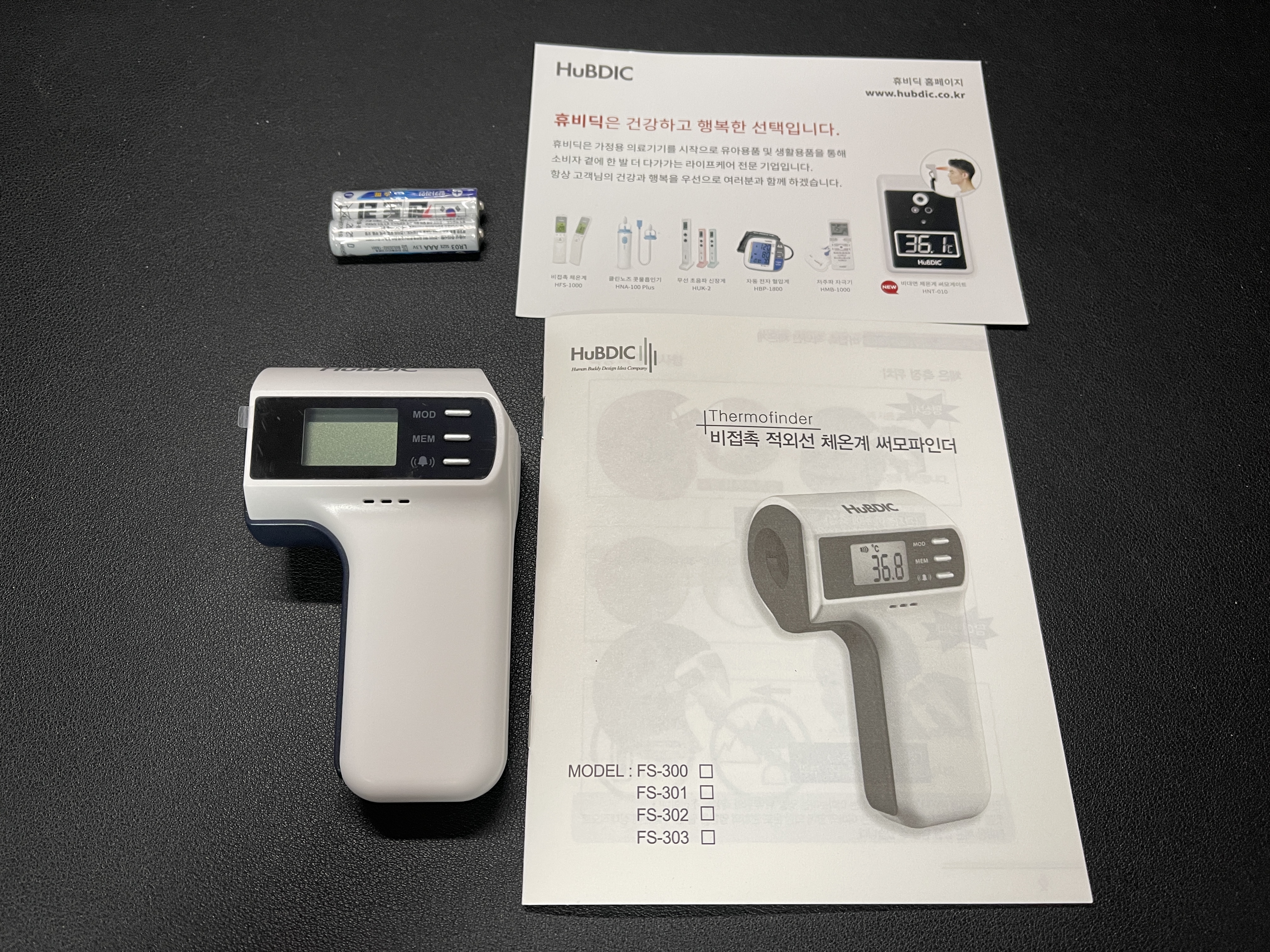 다음은 사무실에서 사용하려고 구입한 제품이에요. 휴비딕 FS-300입니다. 완전 비접촉 제품으로 정확성은 사실 조금 떨어진다고 생각해요. 다만, 고온의 경우에는 잡아낼 수 있기 때문에 유용합니다. 사무실 방문자 측정용으로는 충분한 기능을 해요. 다만, 이 제품의 경우 체온 측정 버튼이 고장이 잘 난다고 합니다. 구매한 후에 얘기를 들어서 어쩔 수 없었는데요. 최대한 조심하면서 사용하고 있습니다.