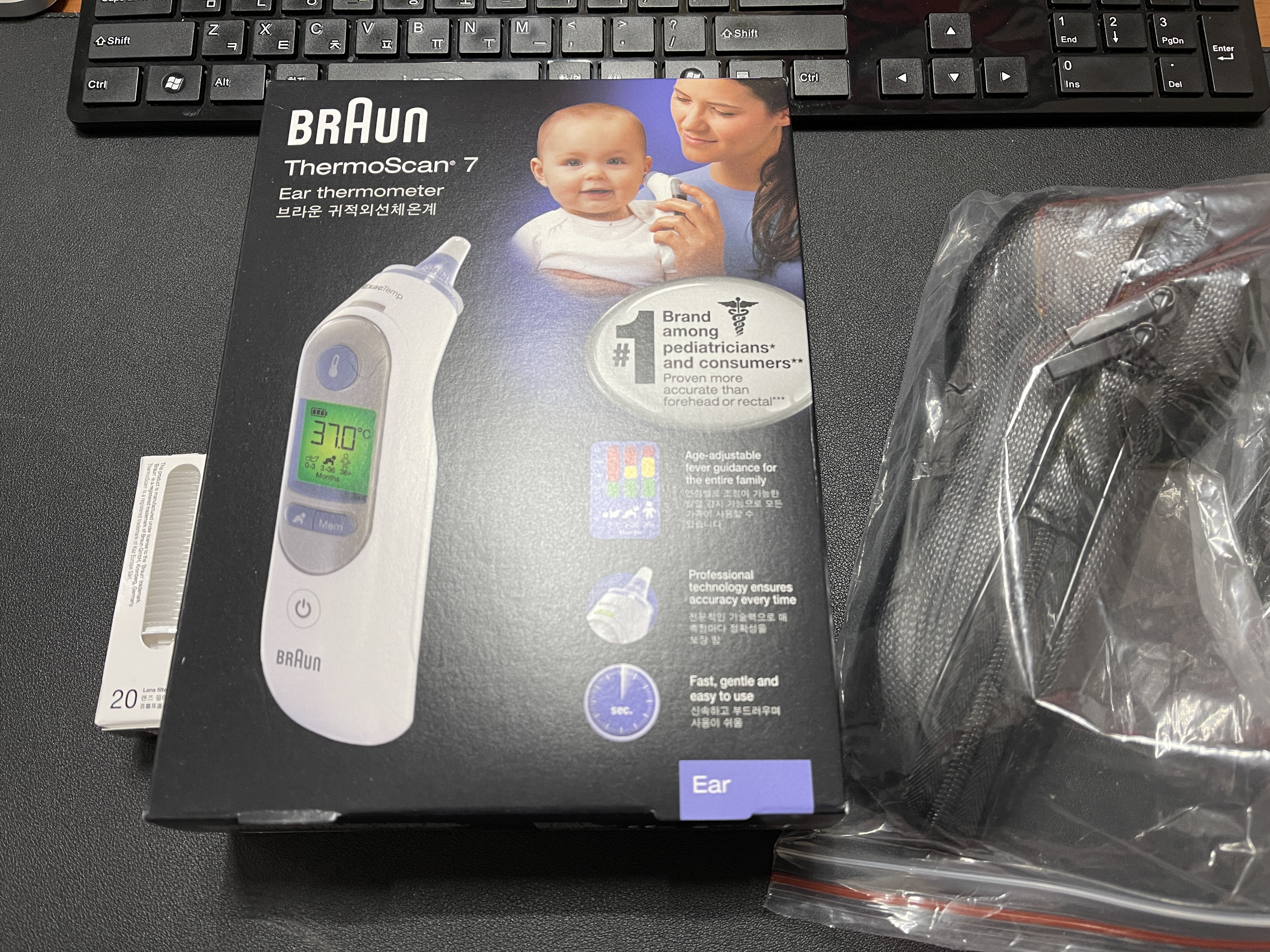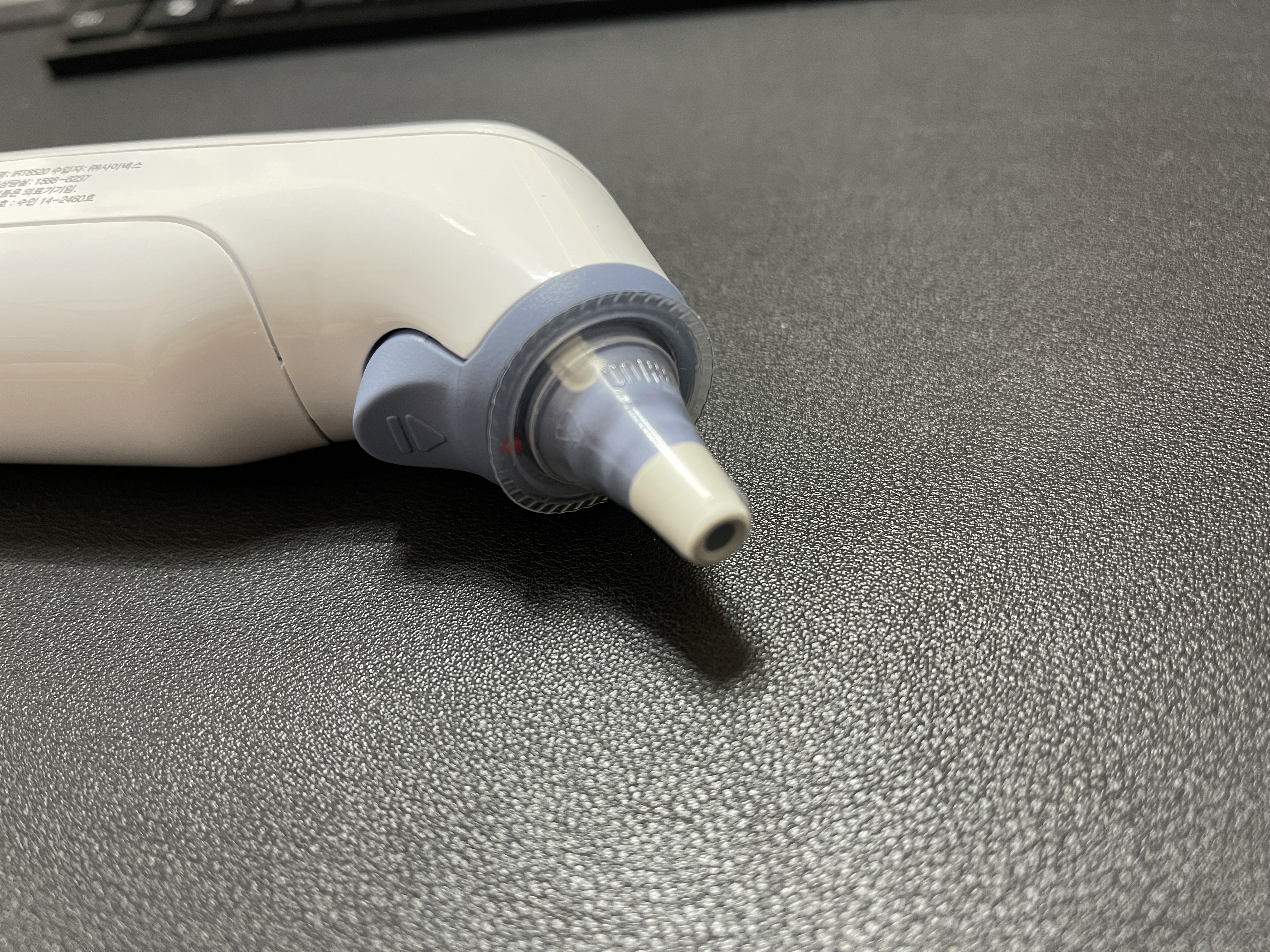이 제품은 기본적으로 기계와 직접 접촉이 일어나진 않습니다. 접촉부위에 PC20 필터를 끼워서 필터만 접촉하는 방식이에요. 필터는 매번 교체를 해야 감염 예방 및 정확한 체온 측정이 가능하다고 합니다. 상대적으로 정확도가 높았어요. 단, 필터를 추가 구매해야 하는 번거로움이 있습니다.