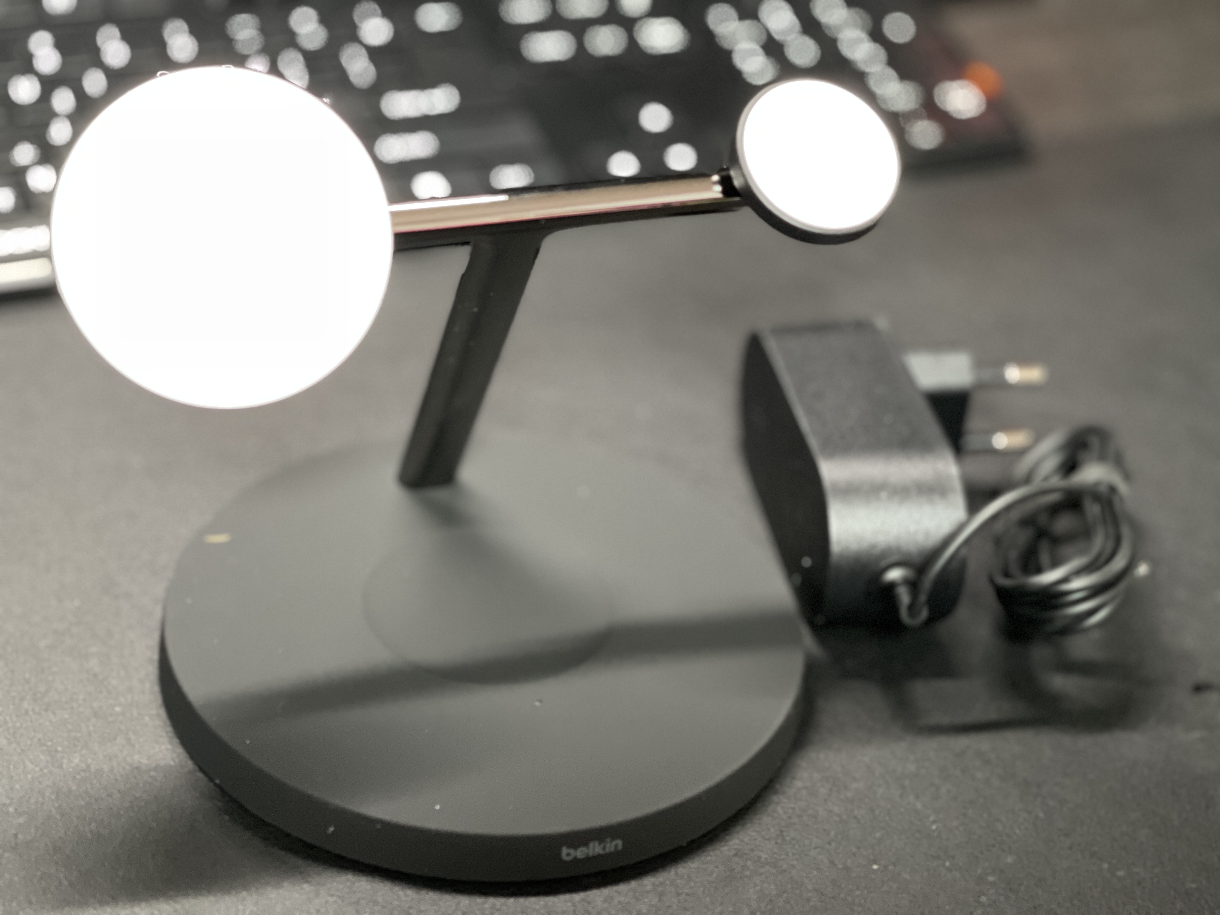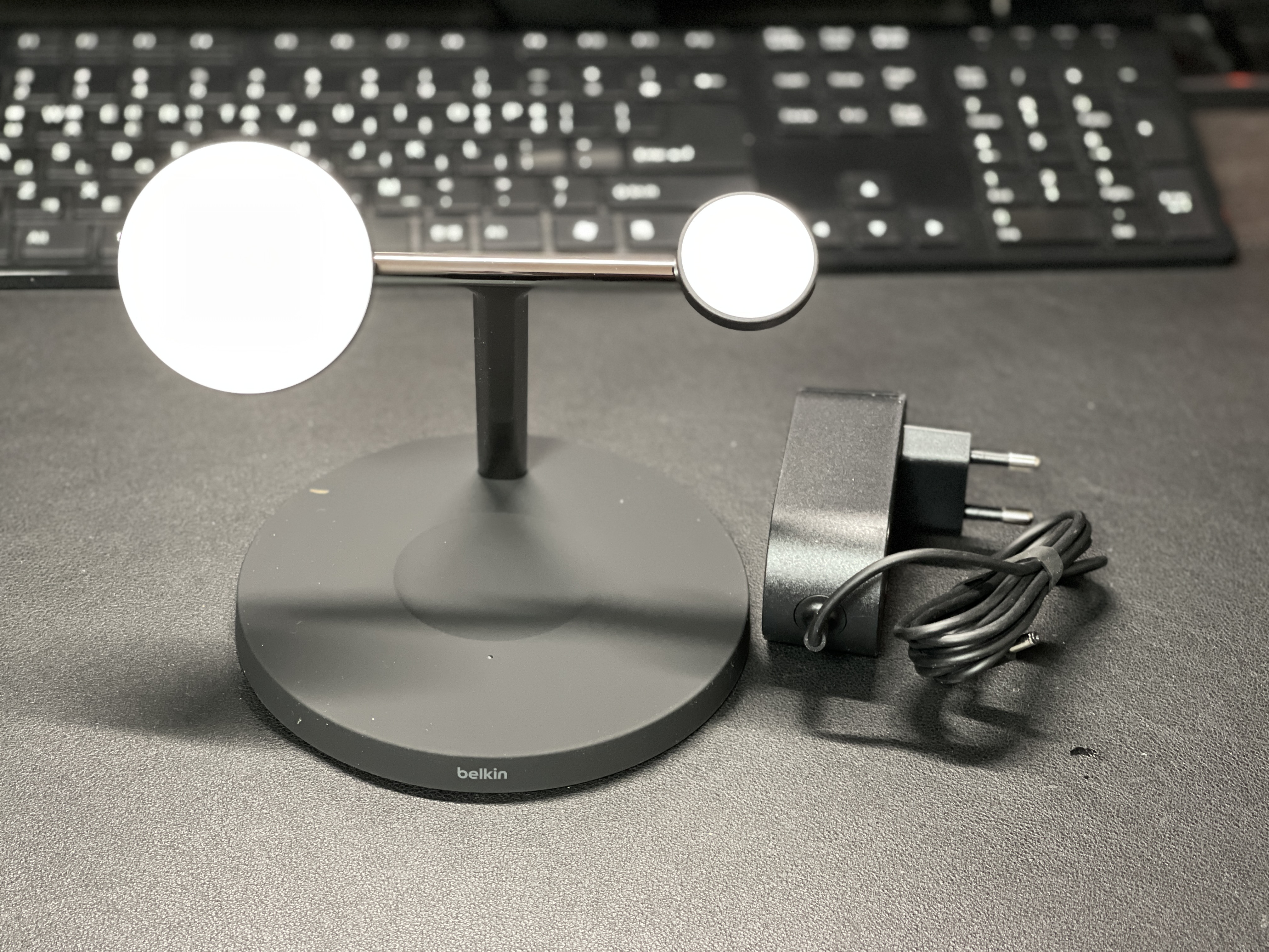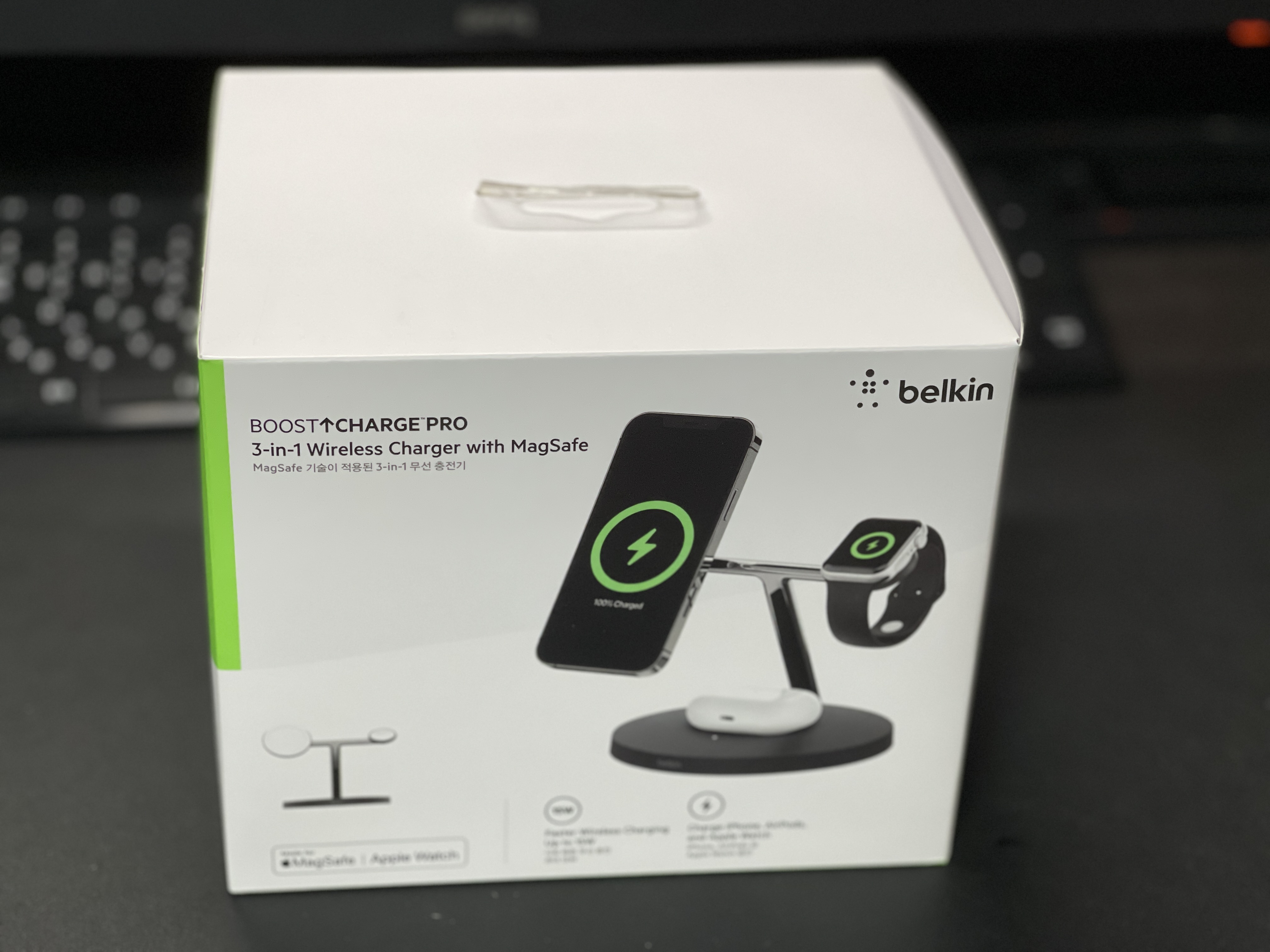 다음은 벨킨 부스트업 프로 3in1 맥세이프 15W 무선 충전 스탠드 WIZ009kr입니다. 3in1이라는 이름처럼 세 개의 제품을 동시에 무선 충전할 수 있는 제품이에요. 이 제품은 아이폰 애플워치 충전이 주력인만큼 애플 유저만 사용 가능한 제품입니다.