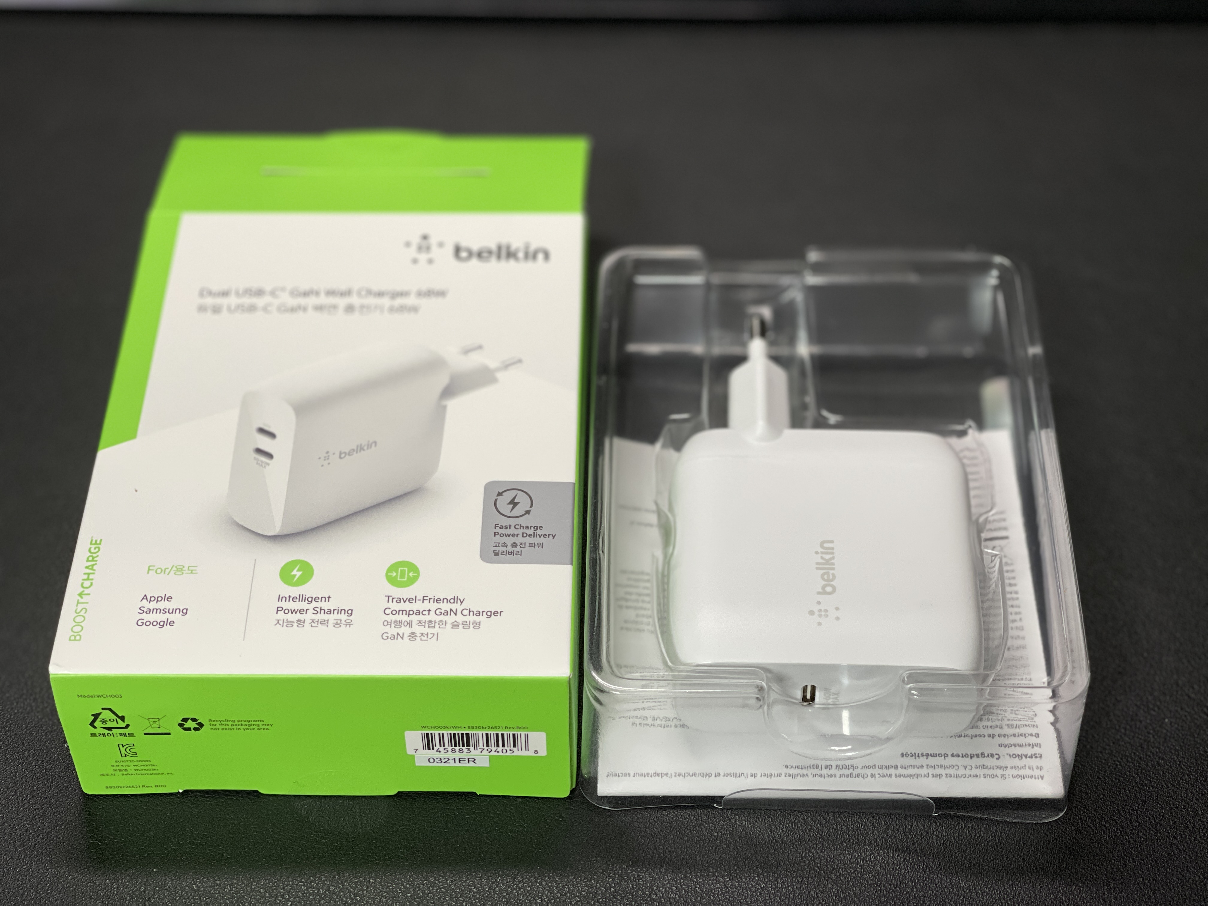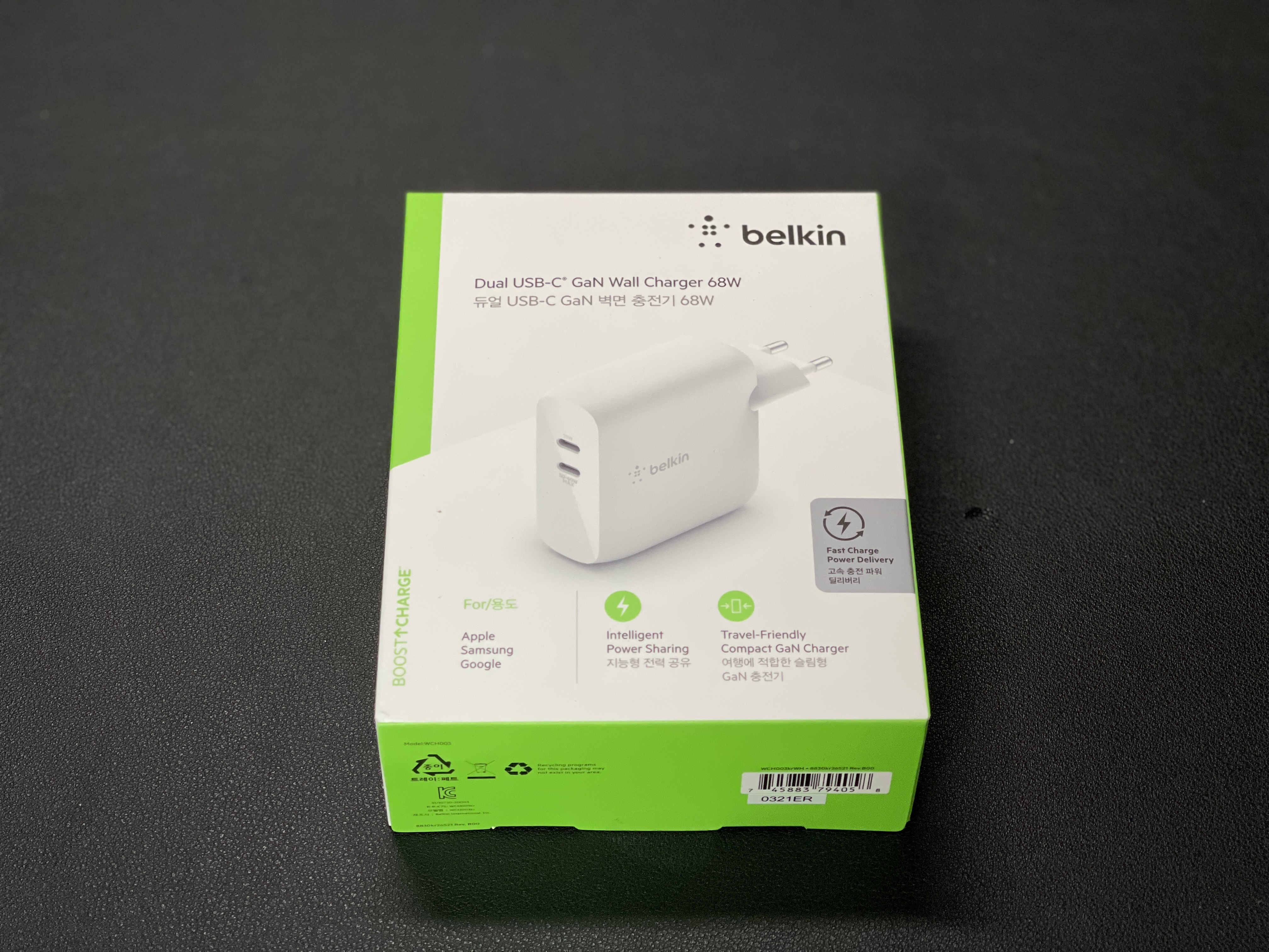 이번에 소개해드릴 제품은 벨킨 듀얼 USB-C GaN 68W 충전기입니다. GaN은 제조 소재명을 딴 거라고 하고요. 요약하면 신소재로 안전하고 빠른 충전이 가능하다는 의미라고 합니다. 포장은 벨킨스러운 심플하고 화이트와 그린 색의 조합입니다. 워낙 오래 전부터 벨킨 제품을 사용하고 있다보니... 친숙한 포장이에요. 포장에 집착하는 입장으로서 만족스럽지는 않지만... 나쁘지 않은 포장입니다.