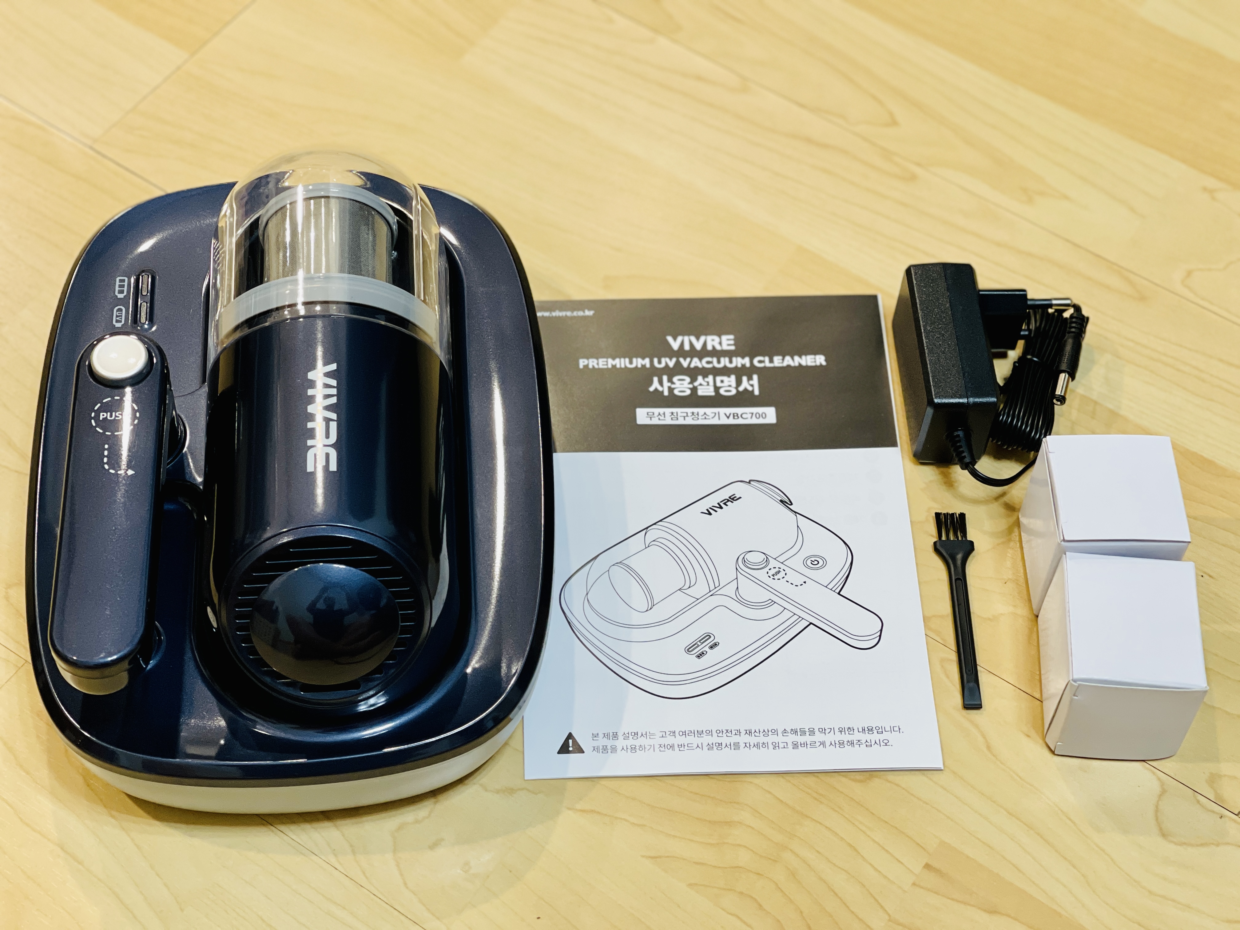 잘 때 속옷만 입고 자는 편입니다. 그러다 보니 작은 먼지에도 간지러움을 느끼곤 하죠. 이전부터 간단한 도구로 이불 청소를 하기도 했는데요. 조금 더 편리하고 제대로 청소하고 싶은 마음에 구입한 제품입니다. 비브르 무선 UV 살균 침구청소기 VBC700 모델입니다.